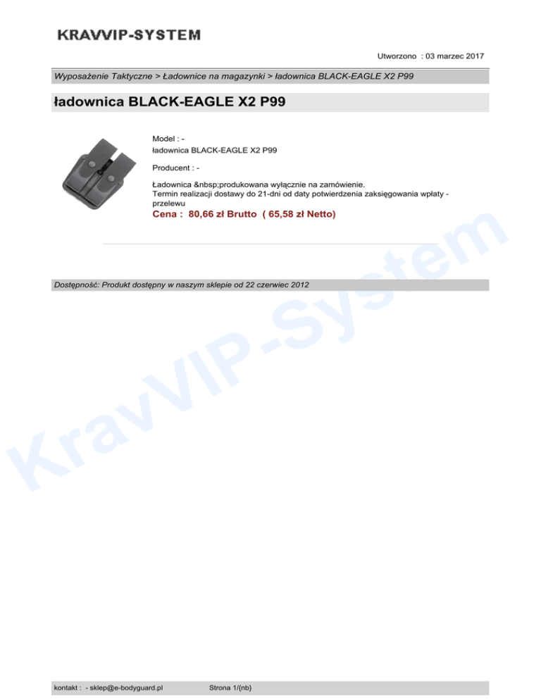 Utworzono : 03 marzec 2017 Wyposażenie Taktyczne > Ładownice na magazynki > ładownica BLACK-EAGLE X2 P99 ładownica BLACK-EAGLE X2 P99 Model : ładownica BLACK-EAGLE X2 P99 Producent : Ładownica produkowana wyłącznie na zamówienie. Termin realizacji dostawy do 21-dni od daty potwierdzenia zaksięgowania wpłaty przelewu m te Cena : 80,66 zł Brutto ( 65,58 zł Netto) s y Dostępność: Produkt dostępny w naszym sklepie od 22 czerwiec 2012 V v a r S IP K kontakt : - [email protected] Strona 1/{nb}