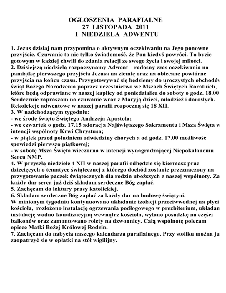OGŁOSZENIA PARAFIALNE 27 LISTOPADA 2011 I NIEDZIELA ADWENTU 1. Jezus dzisiaj nam przypomina o aktywnym oczekiwaniu na Jego ponowne przyjście. Czuwanie to nie tylko świadomość, że Pan kiedyś powróci. To bycie gotowym w każdej chwili do zdania relacji ze swego życia i swojej miłości. 2. Dzisiejszą niedzielą rozpoczynamy Adwent – radosny czas oczekiwania na pamiątkę pierwszego przyjścia Jezusa na ziemię oraz na obiecane powtórne przyjścia na końcu czasu. Przygotowywać się będziemy do uroczystych obchodów świąt Bożego Narodzenia poprzez uczestnictwo we Mszach Świętych Roratnich, które będą odprawiane w naszej kaplicy od poniedziałku do soboty o godz. 18.00. Serdecznie zapraszam na czuwanie wraz z Maryją dzieci, młodzież i dorosłych. Rekolekcje adwentowe w naszej parafii rozpoczną się 18 XII. 3. W nadchodzącym tygodniu: - we środę święto Świętego Andrzeja Apostoła; - we czwartek o godz. 17.15 adoracja Najświętszego Sakramentu i Msza Święta w intencji wspólnoty Krwi Chrystusa; - w piątek przed południem odwiedziny chorych a od godz. 17.00 możliwość spowiedzi pierwszo piątkowej; - w sobotę Msza Święta wieczorna w intencji wynagradzającej Niepokalanemu Sercu NMP. 4. W przyszłą niedzielę 4 XII w naszej parafii odbędzie się kiermasz prac dziecięcych o tematyce świątecznej z którego dochód zostanie przeznaczony na przygotowanie paczek świątecznych dla rodzin uboższych z naszej wspólnoty. Za każdy dar serca już dziś składam serdeczne Bóg zapłać. 5. Zachęcam do lektury prasy katolickiej. 6. Składam serdeczne Bóg zapłać za każdy dar na budowę świątyni. W minionym tygodniu kontynuowano układanie izolacji przeciwwodnej na płycie kościoła, rozłożono instalację ogrzewania podłogowego w prezbiterium, układano instalację wodno-kanalizacyjną wewnątrz kościoła, wylano posadzkę na części balkonów oraz zamontowano rolety na dzwonnicy. Całą wspólnotę polecam opiece Matki Bożej Królowej Rodzin. 7. Zachęcam do nabycia naszego kalendarza parafialnego. Przy stoliku można już zaopatrzyć się w opłatki na stół wigilijny.