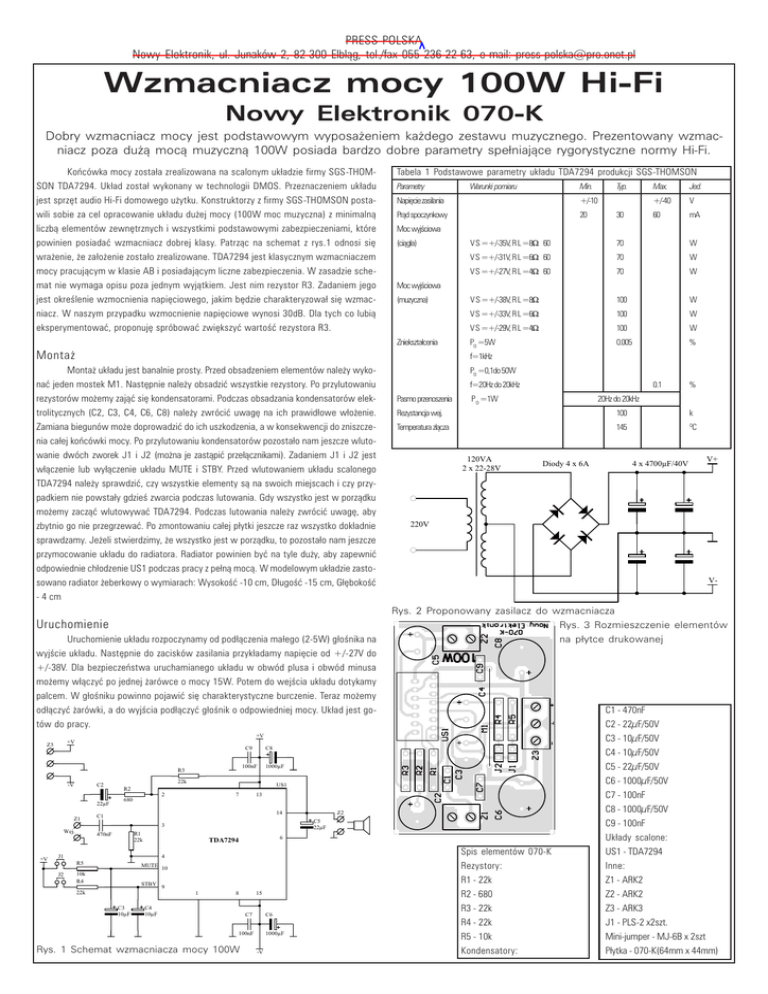 PRESS-POLSKA Nowy Elektronik, ul. Junaków 2, 82-300 Elbl¹g, tel./fax 055 236-22-63, e-mail: [email protected] Wzmacniacz mocy 100W Hi-Fi Nowy Elektronik 070-K Dobry wzmacniacz mocy jest podstawowym wyposa¿eniem ka¿dego zestawu muzycznego. Prezentowany wzmacniacz poza du¿¹ moc¹ muzyczn¹ 100W posiada bardzo dobre parametry spe³niaj¹ce rygorystyczne normy Hi-Fi. Koñcówka mocy zosta³a zrealizowana na scalonym uk³adzie firmy SGS-THOMSON TDA7294. Uk³ad zosta³ wykonany w technologii DMOS. Przeznaczeniem uk³adu jest sprzêt audio Hi-Fi domowego u¿ytku. Konstruktorzy z firmy SGS-THOMSON postawili sobie za cel opracowanie uk³adu du¿ej mocy (100W moc muzyczna) z minimaln¹ liczb¹ elementów zewnêtrznych i wszystkimi podstawowymi zabezpieczeniami, które powinien posiadaæ wzmacniacz dobrej klasy. Patrz¹c na schemat z rys.1 odnosi siê wra¿enie, ¿e za³o¿enie zosta³o zrealizowane. TDA7294 jest klasycznym wzmacniaczem mocy pracuj¹cym w klasie AB i posiadaj¹cym liczne zabezpieczenia. W zasadzie schemat nie wymaga opisu poza jednym wyj¹tkiem. Jest nim rezystor R3. Zadaniem jego jest okrelenie wzmocnienia napiêciowego, jakim bêdzie charakteryzowa³ siê wzmacniacz. W naszym przypadku wzmocnienie napiêciowe wynosi 30dB. Dla tych co lubi¹ eksperymentowaæ, proponujê spróbowaæ zwiêkszyæ wartoæ rezystora R3. Tabela 1 Podstawowe parametry uk³adu TDA7294 produkcji SGS-THOMSON Parametry Warunki pomiaru Min. +/-10 Pr¹d spoczynkowy 20 (ci¹g³a) (muzyczna) mA V S =+/-35V, R L =8W 60 70 W V S =+/-31V, R L =6W 60 70 W V S =+/-27V, R L =4W 60 70 W W V S =+/-38V, R L =8W 100 V S =+/-33V, R L =6W 100 W V S =+/-29V, R L =4W 100 W PO =5W 0.005 % PO =0,1do 50W f=20Hz do 20kHz Pasmo przenoszenia zbytnio go nie przegrzewaæ. Po zmontowaniu ca³ej p³ytki jeszcze raz wszystko dok³adnie sprawdzamy. Je¿eli stwierdzimy, ¿e wszystko jest w porz¹dku, to pozosta³o nam jeszcze przymocowanie uk³adu do radiatora. Radiator powinien byæ na tyle du¿y, aby zapewniæ odpowiednie ch³odzenie US1 podczas pracy z pe³n¹ moc¹. W modelowym uk³adzie zastosowano radiator ¿eberkowy o wymiarach: Wysokoæ -10 cm, D³ugoæ -15 cm, G³êbokoæ - 4 cm Uruchomienie Uruchomienie uk³adu rozpoczynamy od pod³¹czenia ma³ego (2-5W) g³onika na wyjcie uk³adu. Nastêpnie do zacisków zasilania przyk³adamy napiêcie od +/-27V do +/-38V. Dla bezpieczeñstwa uruchamianego uk³adu w obwód plusa i obwód minusa mo¿emy w³¹czyæ po jednej ¿arówce o mocy 15W. Potem do wejcia uk³adu dotykamy palcem. W g³oniku powinno pojawiæ siê charakterystyczne burczenie. Teraz mo¿emy 0.1 P O =1W 100 k Temperatura z³¹cza 145 O 120VA 2 x 22-28V Diody 4 x 6A C1 - 470nF C2 - 22µF/50V C3 - 10µF/50V C4 - 10µF/50V C5 - 22µF/50V C6 - 1000µF/50V -V C2 22µF Z1 Wej. 1000µF 22k R2 US1 2 680 C1 TDA7294 10k R4 STBY 22k C3 10µF 10 9 Z1 - ARK2 Z2 - ARK2 Z3 - ARK3 J1 - PLS-2 x2szt. Mini-jumper - MJ-6B x 2szt P³ytka - 070-K(64mm x 44mm) 6 4 MUTE R1 - 22k R2 - 680 R3 - 22k R4 - 22k R5 - 10k Kondensatory: C5 22µF 3 R1 22k R5 Spis elementów 070-K Rezystory: Z2 14 470nF C7 - 100nF C8 - 1000µF/50V C9 - 100nF Uk³ady scalone: US1 - TDA7294 Inne: 13 7 1 8 C4 10µF 15 C7 C6 100nF Rys. 1 Schemat wzmacniacza mocy 100W 1000µF -V V+ Rys. 2 Proponowany zasilacz do wzmacniacza Rys. 3 Rozmieszczenie elementów na p³ytce drukowanej C8 100nF R3 4 x 4700µF/40V V- +V C9 C 220V od³¹czyæ ¿arówki, a do wyjcia pod³¹czyæ g³onik o odpowiedniej mocy. Uk³ad jest gotów do pracy. +V % 20Hz do 20kHz Rezystancja wej. nia ca³ej koñcówki mocy. Po przylutowaniu kondensatorów pozosta³o nam jeszcze wlutowanie dwóch zworek J1 i J2 (mo¿na je zast¹piæ prze³¹cznikami). Zadaniem J1 i J2 jest w³¹czenie lub wy³¹czenie uk³adu MUTE i STBY. Przed wlutowaniem uk³adu scalonego TDA7294 nale¿y sprawdziæ, czy wszystkie elementy s¹ na swoich miejscach i czy przypadkiem nie powsta³y gdzie zwarcia podczas lutowania. Gdy wszystko jest w porz¹dku mo¿emy zacz¹æ wlutowywaæ TDA7294. Podczas lutowania nale¿y zwróciæ uwagê, aby J2 60 f=1kHz Monta¿ uk³adu jest banalnie prosty. Przed obsadzeniem elementów nale¿y wykonaæ jeden mostek M1. Nastêpnie nale¿y obsadziæ wszystkie rezystory. Po przylutowaniu rezystorów mo¿emy zaj¹æ siê kondensatorami. Podczas obsadzania kondensatorów elektrolitycznych (C2, C3, C4, C6, C8) nale¿y zwróciæ uwagê na ich prawid³owe w³o¿enie. Zamiana biegunów mo¿e doprowadziæ do ich uszkodzenia, a w konsekwencji do zniszcze- +V Jed. V Moc wyjciowa Zniekszta³cenia J1 30 Max. +/-40 Moc wyjciowa Monta¿ Z3 Typ. Napiêcie zasilania