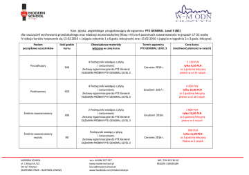 Kurs języka angielskiego przygotowujący do egzaminu PTE GENERAL Level 3 (B2) dla nauczycieli wychowania przedszkolnego oraz edukacji wczesnoszkolnej (klasy I-III) na 4 poziomach zaawansowania w grupach 17-22 osoby IV edycja kursów rozpocznie się 13.02.2016 r. (zajęcia sobotnie 1 x 6 godz. lekcyjnych) oraz 15.02.2016 r.(zajęcia w tygodniu 2 x 3 godz. lekcyjne) Poziom początkowy uczestników Ilość godzin kursu Obowiązkowe materiały wliczone w cenę kursu 540 4 Podręczniki wiodące z płytą i ćwiczeniami; Zestawy egzaminacyjne do PTE General EGZAMIN PRÓBNY PTE GENERAL LEVEL 3 420 4 Podręczniki wiodące z płytą i ćwiczeniami; Zestawy egzaminacyjne do PTE General EGZAMIN PRÓBNY PTE GENERAL LEVEL 3 180 2 Podręczniki wiodące z płytą i ćwiczeniami; Zestawy egzaminacyjne do PTE General EGZAMIN PRÓBNY PTE GENERAL LEVEL 3 90 Podręcznik wiodący z płytą i ćwiczeniami; Zestawy egzaminacyjne do PTE General EGZAMIN PRÓBNY PTE GENERAL LEVEL 3 Początkujący Podstawowy Średnio-zaawansowany Średnio-zaawansowany wyższy MODERN SCHOOL ul. 1 Maja 5A /13 10-117 Olsztyn (KOPERNIK PARK – BUDYNEK JOWISZ) tel.+ 48 696 557 557 www.modernschool.pl [email protected] www.facebook.com/modernolsztyn Termin egzaminu PTE GENERAL LEVEL 3 Cena kursu (możliwość płatności w ratach) Czerwiec 2018 r. 5 130 PLN tylko 9,50 PLN za 1 godzinę lekcyjną płatne w aż 25 ratach Grudzień 2017 r. Grudzień 2016r. Czerwiec 2016 r. NIP: 739-332-30-10 REGON: 519626189 4 200 PLN tylko 10,00 PLN za 1 godzinę lekcyjną płatne w aż 20 ratach 1 800 PLN tylko 10,00 PLN za 1 godzinę lekcyjną płatne w 6 ratach 990 PLN tylko 11,00 PLN za 1 godzinę lekcyjną Płatne w 3 ratach