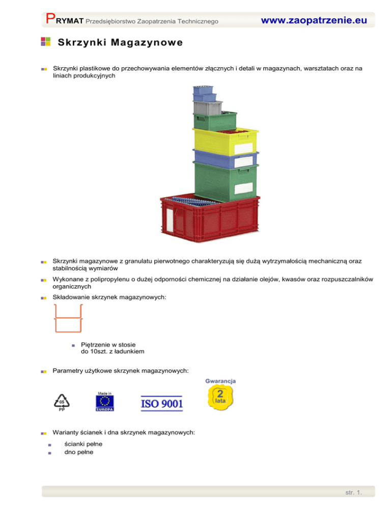 PRYMAT Przedsiębiorstwo Zaopatrzenia Technicznego www.zaopatrzenie.eu Skrzynki Magazynow e Skrzynki plastikowe do przechowywania elementów złącznych i detali w magazynach, warsztatach oraz na liniach produkcyjnych Skrzynki magazynowe z granulatu pierwotnego charakteryzują się dużą wytrzymałością mechaniczną oraz stabilnością wymiarów Wykonane z polipropylenu o dużej odporności chemicznej na działanie olejów, kwasów oraz rozpuszczalników organicznych Składowanie skrzynek magazynowych: Piętrzenie w stosie do 10szt. z ładunkiem Parametry użytkowe skrzynek magazynowych: Warianty ścianek i dna skrzynek magazynowych: ścianki pełne dno pełne str. 1. PRYMAT Przedsiębiorstwo Zaopatrzenia Technicznego www.zaopatrzenie.eu Uchwyty do przenoszenia skrzynek magazynowych: Uchwyty (wgłębienia) na bocznych ściankach Zgodność wymiarowa skrzynek magazynowych plastikowych i skrzynek metalowych: Skrzynki magazynowe plastikowe można układać w stosie ze Skrzynkami metalowymi Zgodne rozmiary: 3A2; 4; 4A5; 5 Skrzynki magazynowe - warianty wykonania Wykonane z barwionego polipropylenu Skrzynka magazynowa rozmiar 0 Skrzynka magazynowa rozmiar 1 Pojemność skrzynki 0,9 l 1,4 l Ciężar 0,07 kg (70 g) 0,09 kg (90 g) Nr katalogowy 05-551 05-553 Wymiary zewnętrzne (gabarytowe) w mm Wymiary wewnętrzne (użytkowe) w mm str. 2. PRYMAT Przedsiębiorstwo Zaopatrzenia Technicznego www.zaopatrzenie.eu Skrzynka magazynowa rozmiar 2 Skrzynka magazynowa rozmiar 3A2 Pojemność skrzynki 3,6 l 8,7 l Ciężar 0,26 kg 0,53 kg Nr katalogowy 05-555 05-557 Wymiary zewnętrzne (gabarytowe) w mm Wymiary wewnętrzne (użytkowe) w mm Skrzynka magazynowa rozmiar 4A2 Skrzynka magazynowa rozmiar 4 Pojemność skrzynki 16,2 l 27,0 l Ciężar 0,97 kg 1,28 kg Nr katalogowy 05-559 05-560 Wymiary zewnętrzne (gabarytowe) w mm Wymiary wewnętrzne (użytkowe) w mm str. 3. PRYMAT Przedsiębiorstwo Zaopatrzenia Technicznego www.zaopatrzenie.eu Skrzynka magazynowa rozmiar 4A5 Skrzynka magazynowa rozmiar 5 Pojemność skrzynki 40,5 l 85,0 l Ciężar 1,79 kg 4,28 kg Nr katalogowy 05-561 05-563 Wymiary zewnętrzne (gabarytowe) w mm Wymiary wewnętrzne (użytkowe) w mm Kolorystyka skrzynek magazynowych Szary (RAL7000) Niebieski (RAL5012) Czerwony Żółty Zielony (RAL6011) Informacja o warunkach zakupu i dostawy PZT PRYMAT Dział Sprzedaży 801 003 192 (Infolinia) 74 831 18 82 694 486 552 74 661 41 16 (faks) p r yma t@p r ym at .co m www.prymat.com www.zaopatrzenie.eu str. 4.