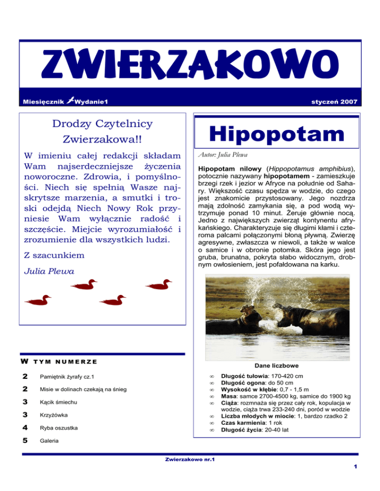 Zwierzakowo Miesięcznik ZWydanie1 styczeń 2007 Drodzy Czytelnicy Zwierzakowa!! Hipopotam W imieniu całej redakcji składam Wam najserdeczniejsze Ŝyczenia noworoczne. Zdrowia, i pomyślności. Niech się spełnią Wasze najskrytsze marzenia, a smutki i troski odejdą Niech Nowy Rok przyniesie Wam wyłącznie radość i szczęście. Miejcie wyrozumiałość i zrozumienie dla wszystkich ludzi. Z szacunkiem KK KK Julia Plewa W Autor: Julia Plewa Hipopotam nilowy (Hippopotamus amphibius), potocznie nazywany hipopotamem - zamieszkuje brzegi rzek i jezior w Afryce na południe od Sahary. Większość czasu spędza w wodzie, do czego jest znakomicie przystosowany. Jego nozdrza mają zdolność zamykania się, a pod wodą wytrzymuje ponad 10 minut. śeruje głównie nocą. Jedno z największych zwierząt kontynentu afrykańskiego. Charakteryzuje się długimi kłami i czteroma palcami połączonymi błoną pływną. Zwierzę agresywne, zwłaszcza w niewoli, a takŜe w walce o samice i w obronie potomka. Skóra jego jest gruba, brunatna, pokryta słabo widocznym, drobnym owłosieniem, jest pofałdowana na karku. TYM NUMERZE 2 Pamiętnik Ŝyrafy cz.1 2 Misie w dolinach czekają na śnieg 3 Kącik śmiechu 3 KrzyŜówka 4 Ryba oszustka 5 Galeria Dane liczbowe • • • • • • • • Długość tułowia: 170-420 cm Długość ogona: do 50 cm Wysokość w kłębie: 0,7 - 1,5 m Masa: samce 2700-4500 kg, samice do 1900 kg CiąŜa: rozmnaŜa się przez cały rok, kopulacja w wodzie, ciąŜa trwa 233-240 dni, poród w wodzie Liczba młodych w miocie: 1, bardzo rzadko 2 Czas karmienia: 1 rok Długość Ŝycia: 20-40 lat Zwierzakowo nr.1 1 wy Regionalnej Dyrekcji Lasów Państwowych w Krośnie, Edward Marszałek. W dolinie Sanu widziano misia w ostatnich dniach, tropy widywane są codziennie. Pamiętnik Ŝyrafy cz.1 autor: Julia Plewa "Przyczyną bezsenności jest brak wysokiego śniegu, który zawsze usypiał drapieŜniki" wyjaśnia rzecznik. Pierwszy dzień w szkole 02.01.07r. Wstałam rano i dopiero po ok.5 minutach zdałam sobie sprawę, Ŝe dziś jest ten rewelacyjny dzień, kiedy idę pierwszy raz do mojej nowej szkółki. Rzuciłam się do szafy i wyjęłam rewelacyjny, czerwony golf, który dostałam od mojej młodszej (czasem denerwującej) siostry Gosi pod choinkę. WłoŜyłam ulubioną dŜinsową spódniczkę i załoŜyłam na kopyto bransoletkę. Wpadłam jak piorun do kuchni i dosłownie pochłonęłam śniadanie (jeŜeli was to interesuje to zjadłam czekoladowe płatki „Czekuś” z mlekiem „Muu”). Tu pominę szczegóły aŜ do momentu, kiedy wchodzę do klasy. Weszłam!! Pani Słonica nasza nauczycielka powiedziała całej klasie jak się nazywam i kazała mi usiąść obok sympatycznie wyglądającej antylopy Kasi. Na przerwie poznałam prawie całą klasę. Składa się prawie z samych dziewczyn. Najbardziej polubiłam Kasie z, którą siedzę w ławce. Polubiłam jeszcze słonicę Klarę, zwariowane siostry małpy Zuzię i Zosię oraz lwicę Oliwię. Za to nie polubiłam węŜycy Sylwii i jej przyjaciółki jaszczurki Maryli. Tyle co do dziewczyn, bo pozostałe cztery dziewczyny są w porządku i nie będę o nich pisać. Chłopców prawie nie ma. Jest tylko trzech. jaszczur, lew i słoń. Michał, Adrian i Tomek. Mądrala klasowy, osiłek i ktoś kto ma równo pod sufitem. Mam fajową klasę. Jest nas tylko 15. To był super, ekstra, odlotowy dzień. Agnieszka J Z kolei w sąsiednim nadleśnictwie Stuposiany we wtorek miejscowy leśniczy widział pięć niedźwiedzi drzemiących na płatach śniegu opodal leśnej drogi. Według jego relacji, na śniegu odpoczywały matka, dwoje młodych, jeden piastun i osobnik, którego wieku nie mógł określić. "W takich przypadkach niedźwiedzie mogą być bardzo niebezpieczne przy bliskim spotkaniu" - zwraca uwagę rzecznik. Rok temu bieszczadzkie misie w sen zimowy zapadły w pierwszej połowie grudnia. W Bieszczadach Ŝyje ponad 70 niedźwiedzi, z czego na terenie nadleśnictwa Lutowiska stale przebywa około 30 sztuk. W polskich Tatrach jest ich do 15 sztuk. Całą populację tego drapieŜnika w naszym kraju szacuje się na 80-90 osobników. Niedźwiedź brunatny waŜy około 300 kg, Ŝyje do 50 lat. Zwierzęta te są wszystkoŜerne, przez cały rok gromadzą zapasy energetyczne na zimę. V Twój artykuł, list, wywiad lub zdjęcie w Zwierzakowie!! Misie w dolinach czekają na śnieg Opracowanie: Julia Plewa W Bieszczadach w zimowy sen zapadły niedźwiedzie bytujące w górnych partiach gór. Natomiast w dolinach misie nadal czekają na śnieg. "DuŜą aktywność niedźwiedzi obserwujemy w nadleśnictwie Lutowiska" - mówi rzecznik praso- JeŜeli chcesz to twojego autorstwa artykuł, wywiad, list lub zdjęcie znalazło się w Zwierzakowie to prześlij je do nas pocztą elektroniczną. Jeśli to co nam prześlesz spodoba się nam to zamieścimy to w następnym miesiącu. Nie przejmuj się jeśli twój artykuł nie zostanie zamieszczony. Na pewno został odłoŜony i prędzej czy później zamieścimy go. No to aparaty i pióra w dłoń!!! Zabierajcie się do pisania i fotografowania. Miłej pracy! Nasz adres: [email protected] Zwierzakowo nr.1 2 UWAGA! UWAGA! OGŁASZAMY KONKURS NA ZDJCIE MIESIĄCA. ZDJĘCIE MUSI PRZEDSTAWIAĆ ZWIERZAKA. MOśE BYĆ ON NA ZDJĘCIU SAM LUB Z CZŁOWIEKIEM. ZDJĘCIE MUSI BYĆ ZABAWNE I ORYGINALNE. DO ZDJĘĆ PROSIMY DOŁĄCZAĆ LISTY Z IMIENIEM, NAZWISKIEM I ADRESEM AUTORA. AUTOR NAJLEPSZEGO ZDJĘCIA DOSTANIE NAGRODĘ. ZWYCIĘSKIE ZDJĘCIE ZOSTANIE ZAMIESCZONE W NASTĘPNYM NUMERZE. ZDJĘCIA Z PROSIMY WYSYŁAĆ NA ADRES: Idzie myśliwy przez las i śpiewa: - "Na polowanko, na polowanko!" Z tylu wychodzi mis, klepie go po ramieniu i pyta: - "Co, na polowanko?" - "Nie! Jak Boga kocham, na ryby!" [email protected] Uwaga, uwaga, uwaga!! Ogłaszamy teŜ konkurs na rysunek zwierzęcia domowego. Prace mają być wykonane samodzielne. Prosimy aby przysyłać prace pocztą elektroniczną do końca Stycznia