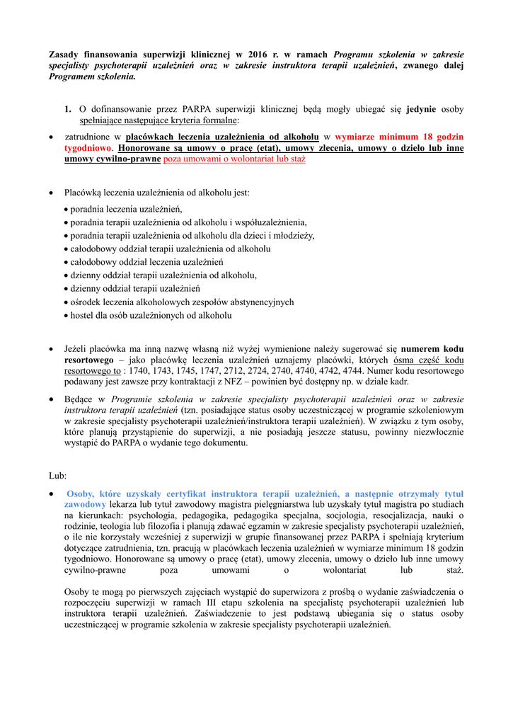Zasady finansowania superwizji klinicznej w 2016 r. w ramach Programu szkolenia w zakresie specjalisty psychoterapii uzależnień oraz w zakresie instruktora terapii uzależnień, zwanego dalej Programem szkolenia. 1. O dofinansowanie przez PARPA superwizji klinicznej będą mogły ubiegać się jedynie osoby spełniające następujące kryteria formalne: zatrudnione w placówkach leczenia uzależnienia od alkoholu w wymiarze minimum 18 godzin tygodniowo. Honorowane są umowy o pracę (etat), umowy zlecenia, umowy o dzieło lub inne umowy cywilno-prawne poza umowami o wolontariat lub staż Placówką leczenia uzależnienia od alkoholu jest: poradnia leczenia uzależnień, poradnia terapii uzależnienia od alkoholu i współuzależnienia, poradnia terapii uzależnienia od alkoholu dla dzieci i młodzieży, całodobowy oddział terapii uzależnienia od alkoholu całodobowy oddział leczenia uzależnień dzienny oddział terapii uzależnienia od alkoholu, dzienny oddział terapii uzależnień ośrodek leczenia alkoholowych zespołów abstynencyjnych hostel dla osób uzależnionych od alkoholu Jeżeli placówka ma inną nazwę własną niż wyżej wymienione należy sugerować się numerem kodu resortowego – jako placówkę leczenia uzależnień uznajemy placówki, których ósma część kodu resortowego to : 1740, 1743, 1745, 1747, 2712, 2724, 2740, 4740, 4742, 4744. Numer kodu resortowego podawany jest zawsze przy kontraktacji z NFZ – powinien być dostępny np. w dziale kadr. Będące w Programie szkolenia w zakresie specjalisty psychoterapii uzależnień oraz w zakresie instruktora terapii uzależnień (tzn. posiadające status osoby uczestniczącej w programie szkoleniowym w zakresie specjalisty psychoterapii uzależnień/instruktora terapii uzależnień). W związku z tym osoby, które planują przystąpienie do superwizji, a nie posiadają jeszcze statusu, powinny niezwłocznie wystąpić do PARPA o wydanie tego dokumentu. Lub: Osoby, które uzyskały certyfikat instruktora terapii uzależnień, a następnie otrzymały tytuł zawodowy lekarza lub tytuł zawodowy magistra pielęgniarstwa lub uzyskały tytuł magistra po studiach na kierunkach: psychologia, pedagogika, pedagogika specjalna, socjologia, resocjalizacja, nauki o rodzinie, teologia lub filozofia i planują zdawać egzamin w zakresie specjalisty psychoterapii uzależnień, o ile nie korzystały wcześniej z superwizji w grupie finansowanej przez PARPA i spełniają kryterium dotyczące zatrudnienia, tzn. pracują w placówkach leczenia uzależnień w wymiarze minimum 18 godzin tygodniowo. Honorowane są umowy o pracę (etat), umowy zlecenia, umowy o dzieło lub inne umowy cywilno-prawne poza umowami o wolontariat lub staż. Osoby te mogą po pierwszych zajęciach wystąpić do superwizora z prośbą o wydanie zaświadczenia o rozpoczęciu superwizji w ramach III etapu szkolenia na specjalistę psychoterapii uzależnień lub instruktora terapii uzależnień. Zaświadczenie to jest podstawą ubiegania się o status osoby uczestniczącej w programie szkolenia w zakresie specjalisty psychoterapii uzależnień. 2. Zgłoszenia na superwizję finansowaną przez Agencję będą przyjmowane na karcie zgłoszeniowej, która ukaże się na stronie internetowej PARPA, w aktualnościach oraz w belce: certyfikacja terapeutów – lista osób uprawnionych do prowadzenia superwizji klinicznej, pod tabelą z adresami superwizorów, w drugiej połowie grudnia 2015 r. Zgłoszenia złożone w innej formie, niż na karcie zgłoszeniowej nie będą rozpatrywane. 3. Razem z kartą zgłoszeniową uczestnik będzie zobowiązany do przesłania/złożenia następujących dokumentów: kserokopii statusu poświadczonej za zgodność z oryginałem, kserokopii zaświadczenia potwierdzającego ukończenie I etapu Programu certyfikacyjnego (szkolenia) poświadczonej za zgodność z oryginałem (osoby, które w chwili składania karty zgłoszeniowej nie ukończyły I etapu Programu szkoleniowego nie będą kwalifikowane do odbywania superwizji), w przypadku osób, które uzyskały certyfikat instruktora terapii uzależnień, a następnie otrzymały tytuł zawodowy lekarza lub tytuł zawodowy magistra pielęgniarstwa lub uzyskały tytuł magistra po studiach na kierunkach: psychologia, pedagogika, pedagogika specjalna, socjologia, resocjalizacja, nauki o rodzinie, teologia lub filozofia i planują zdawać egzamin w zakresie specjalisty psychoterapii uzależnień – kserokopii certyfikatu instruktora terapii uzależnień oraz kopii dyplomu świadczącego o uzyskaniu tytułu zawodowego lekarza lub magistra pielęgniarstwa lub kopii dyplomu magisterskiego po studiach na kierunkach: psychologia, pedagogika, pedagogika specjalna, socjologia, resocjalizacja, nauki o rodzinie, teologia lub filozofia, poświadczonych za zgodność z oryginałem, aktualnego (wydanego w grudniu 2015 r. lub w styczniu 2016 r.) zaświadczenia z miejsca pracy potwierdzającego wykonywanie świadczeń z zakresu psychoterapii/terapii uzależnienia od alkoholu w placówce leczenia uzależnienia od alkoholu w wymiarze nie mniejszym niż 18 godzin tygodniowo (PARPA nie będzie refundowała superwizji wolontariuszom i stażystom). 4. Karty zgłoszeniowe wraz z załącznikami będą przyjmowane za pośrednictwem poczty tradycyjnej od 4 stycznia do 18 stycznia 2016 r. Rozpatrywane będą tylko karty zgłoszeniowe z datą wpływu do Agencji od 4 stycznia do 18 stycznia 2016 roku. 5. Będzie istniała także możliwość składania kart zgłoszeniowych wraz z załącznikami bezpośrednio w sekretariacie PARPA w dniach od 4 stycznia do 18 stycznia 2016 r., w dni robocze w godzinach (8.30 – 16.00). 6. Podczas kwalifikacji decydować będzie kolejność przesyłania/składania kart zgłoszeniowych wraz z załącznikami. 7. W przypadku złożenia lub przesłania do Agencji karty zgłoszeniowej niekompletnie wypełnionej lub nie zawierającej koniecznych załączników kwalifikacja nie będzie m