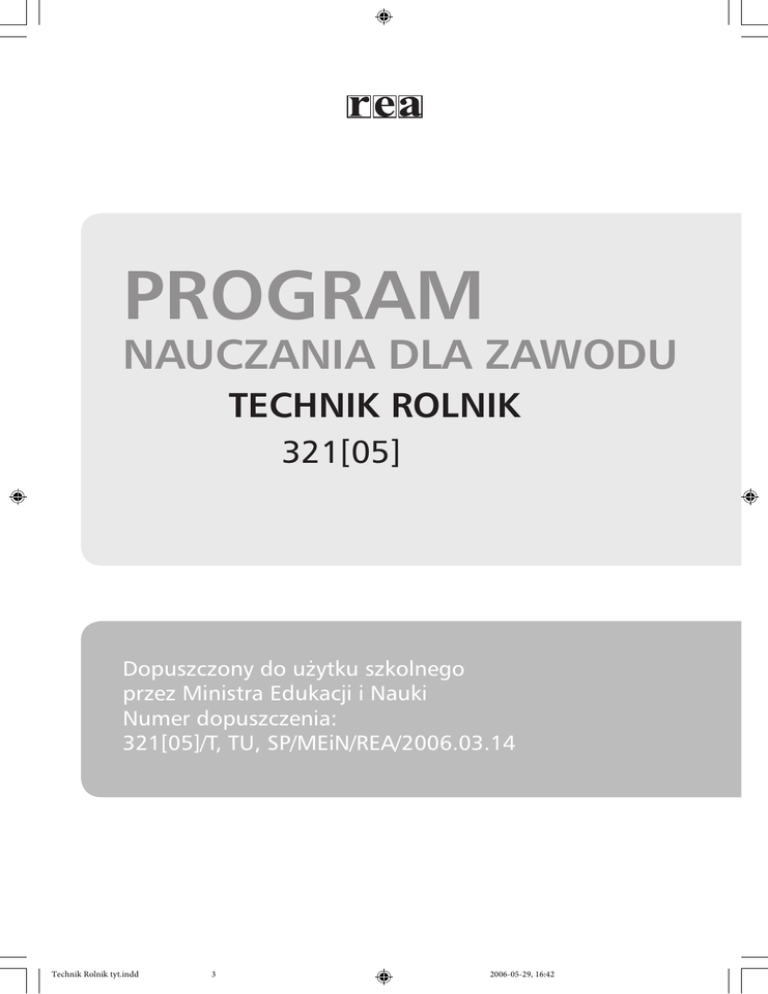 PROGRAM NAUCZANIA DLA ZAWODU TECHNIK ROLNIK 321[05] Dopuszczony do użytku szkolnego przez Ministra Edukacji i Nauki Numer dopuszczenia: 321[05]/T, TU, SP/MEiN/REA/2006.03.14 Technik Rolnik tyt.indd 3 2006-05-29, 16:42 Autorzy Koordynator: mgr inż. Ewa Marciniak-Kulka mgr inż. Andrzej Kulka mgr Małgorzata Pawlonka mgr inż. Zbigniew Pawlonka mgr Irena Budzińska mgr Anna Mironiuk mgr Renata Kacperska Recenzenci prof. dr hab. Franciszek Borówczak dr inż. Ludwika Maria Felińska Projekt okładki: 69 – Studio Reklamy, Olsztyn Redakcja: Małgorzata Janus Redaktor prowadzący: Dorota Mazur-Dulęba Właścicielem praw wydawniczych niniejszego programu jest Wydawnictwo REA s.j., 05-510 Konstancin-Jeziorna, ul. Kościuszki 21 © Wydawnictwo REA s.j. ISBN 83-7141-391-2 Wydawnictwo REA s.j. 01-217 Warszawa, ul. Kolejowa 9/11 tel./fax (0-22) 631-94-23, 632-21-15 http://www.rea-sj.pl e-mail: [email protected] Skład: HAPPY Studio DTP Spis treści: I. Wstęp ..................................................................................................... 7 II. Plany nauczania ..................................................................................... 9 III. Programy nauczania przedmiotów zawodowych IIII. 1. Produkcja roślinna ...................................................................... 15 III. 2. Produkcja zwierzęca ..................................................................... 47 III. 3. Technika w rolnictwie ................................................................... 76 III. 4. Przepisy ruchu drogowego .......................................................... 100 III. 5. Ekonomika rolnictwa .................................................................. 109 III. 6. Zajęcia praktyczne ..................................................................... 142 III. 7. Praktyka zawodowa .................................................................... 163 III. 8. Przedmiot specjalizacyjny ........................................................... 165 I. Wstęp Rolnictwo, jako dział gospodarki narodowej, charakteryzuje się dużą odmiennością warunków produkcji w porównaniu z innymi branżami. Praca odbywa się w układzie dynamicznym, czyli zmieniającym się podczas procesu produkcji zależnie od licznych uwarunkowań. Ta właśnie specyfika decyduje o konieczności wielopłaszczyznowego traktowania kwalifikacji zawodowych technika rolnika. Zgodnie z podstawą programową kształcenia w zawodzie technik rolnik, absolwent szkoły powinien być przygotowany do wykonywania zadań zawodowych związanych z wytwarzaniem i sprzedażą produktów rolniczych, a zwłaszcza do: 1) projektowania organizacji gospodarstwa rolnego; 2) projektowania i organizowania procesów produkcji i pracy w gospodarstwie rolnym; 3) wykonywania zabiegów składających się na technologie produkcji rolniczej; 4) prowadzenia uproszczonej rachunkowości, obliczania opłacalności produkcji rolniczej oraz stosowania zasad marketingu. Absolwent szkoły kształcącej w zawodzie technik rolnik może samodzielnie prowadzić indywidualne gospodarstwo rolne. Może także podejmować pracę w rolniczych przedsiębiorstwach produkcyjnych i usługowych, a także samodzielnie prowadzić działalność gospodarczą. Zawód technik rolnik jest zawodem szerokoprofilowym, umożliwiającym wstępną specjalizację pod koniec okresu kształcenia. Szkoła określa specjalizację, biorąc pod uwagę potrzeby regionalnego rynku pracy i zainteresowania uczniów. Tematyka specjalizacji może dotyczyć: rolnictwa ekologicznego, rynku rolnego, podstaw agrobiznesu, obsługi ruchu turystycznego na wsi, organizacji przetwórstwa spożywczego w gospodarstwie rolnym, podstaw ogrodnictwa, usług technicznych na wsi, marketingu produktów rolniczych, spółdzielczości wiejskiej. Zajęcia specjalizacyjne mogą być również kierunkowym rozszerzeniem wybranych technologii realizowanych w zakresie programu nauczania dla zawodu. Przykładem może być: produkcja mleka na użytkach zielonych, chów krów mamek, ekstensywna produkcja jaj, chów i użytkowanie koni, grupa producencka, produkcja materiału hodowlanego trzody chlewnej, uprawa różnych roślin na nasiona itp. W programie umieszczono 6 przedmiotów: 1) Produkcja roślinna 2) Produkcja zwierzęca 3) Technika w rolnictwie 7 4) Przepisy ruchu drogowego 5) Ekonomika w rolnictwie 6) Praktyczna nauka zawodu Taki podział wydaje daje nauczycielom możliwość swobodnego planowania wynikowego, uwzględniającego zarówno korelacje wewnątrzprzedmiotowe, jak i międzyprzedmiotowe. Ma to kluczowe znaczenie w przypadku kształtowania umiejętności zawodowych, które są właściwe dla zawodu. W takich przypadkach potrzebne jest tworzenie sytuacji dydaktycznych pozwalających na korelacje odnoszące się do czasu realizacji, treści kształcenia i metod kształcenia. Możliwe również staje się stosowanie zintegrowanych metod sprawdzania wiedzy i umiejętności uczniów/słuchaczy. Program o takiej konstrukcji gwarantuje elastyczność pozwalającą na wybór tempa pracy i dostosowanie go do możliwości intelektualnych uczniów. Pewne grupy celów kształcenia mogą być osiągane równolegle, zależnie od przyjętej strategii dotyczącej wyboru metod pracy z uczniem. Nie byłoby to możliwe w sytuacji zaprojektowania wielu przedmiotów. Zastosowane kryteria podziałowe pozwalają wyodrębnić grupy celów kształcenia wyraźnie różniące się specyfiką – produkcja roślinna i produkcja zwierzęca – oraz utrwalające jakość procesu kształcenia zawodowego – technika w rolnictwie, ekonomika i praktyczna nauka zawodu. W programie zamieszczono wymagania programowe, które są szczegółową informacją dla przyszłych uczniów i ich rodziców. Ma to szczególne znaczenie w przypadku nauczycieli rozpoczynających pracę w szkole i nie mających doświadczenia w planowaniu pracy bieżącej. Umieszczenie wymagań usprawni także konstruowanie na