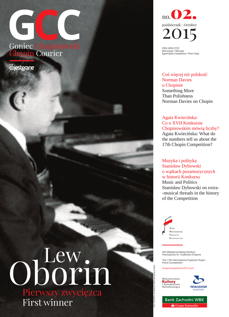 02. no. 2015 październik / October ISSN 2450-2723 Warszawa / Warsaw Egzemplarz bezpłatny / Free Copy Coś więcej niż polskość Norman Davies o Chopinie Something More Than Polishness Norman Davies on Chopin Agata Kwiecińska: Co o XVII Konkursie Chopinowskim mówią liczby? Agata Kwiecińska: What do the numbers tell us about the 17th Chopin Competition? Muzyka i polityka Stanisław Dybowski o wątkach pozamuzycznych w historii Konkursu Music and Politics Stanisław Dybowski on extra ‑musical threads in the history of the Competition Oborin Pierwszy zwycięzca First winner The 17th International Fryderyk Chopin Piano Competition FOT./PHOTO: Archiwum NIFC/Archive of NIFC Lew XVII Międzynarodowy Konkurs Pianistyczny im. Fryderyka Chopina chopincompetition2015.com Wydawca/Publisher: Narodowy Instytut Fryderyka Chopina Redaktor Naczelna/Editor -in-Chief: Agata Kwiecińska Redaktor Prowadząca /Commissioning Editor: Dorota Kozińska Redakcja/Editorial Staff: Magdalena Romańska, Krzysztof Komarnicki Projekt graficzny/Layout: Joanna Cymkiewicz (INFOR IT) Tłumacze/Translators: Cara Thornton, Michał Szostało Skład/DTP: Agora S.A. Korekta/Proofreading: Agora S.A. Druk/Print: Perfekt S.A. Chopin jest pierwszym głosem Polski Muzyka Chopina, tak jak muzyka wszystkich wielkich, trwa. Istnieje jej żywa tradycja, która ewoluuje. Sposób interpretacji Chopina się zmienia. Kolejne poko lenia dostrzegają inne rzeczy. Taka muzyka żyje i ma wpływ na naszą wizję świata. Język polski nie tylko jest trudny, jest nieznany za granicą. W rezultacie Cho pin jest w pewnym sensie pierwszym głosem Polski, który się słyszy na całym świecie. Wiemy, że on nie jest jej jedynym głosem, ale z rozmaitych względów Chopin śpiewa, kiedy inne głosy są niesłyszalne. Ta muzyka ma charakter w pew nym sensie polski, ale to nie jest tak proste, że to jest wytwór polskości. Chopin nie był Polakiem, był pół Polakiem, pół Francuzem, spędził większość swego – niestety – krótkiego życia we Francji, więc miał w sobie coś więcej niż pol skość. Oczywiście, Chopin używał wielu elementów polskich w swojej muzyce, co do tego nie ma wątpliwości. Chciał wrócić do Polski, ale nie mógł. Wydaje mi się, że ten jego ton, ta melancholia wygnańca, bardzo pasuje do temperamentu wielu Polaków, bo oni przeżyli podobne nieszczęścia. Na całym świecie giną pewne wartości, istotne elementy kultury. Moja ostat nia książka Zaginione królestwa jest o tym, że wszystko w życiu się kończy, ale pewne rzeczy mają swoje życie po życiu. Chopin należy do takiej tradycji – po dobnie jak Mickiewicz. Wystawa „Międzynarodowe Konkursy Pianistyczne im. Fryderyka Chopina 1927-2015” Łazienki Królewskie, Galeria Plenerowa 28 września – 16 października Wystawa „Wirtuoz” Muzeum Fryderyka Chopina 2 października 2015 – 31 stycznia 2016 Nadzwyczajny Koncert Oratoryjny w rocznicę śmierci Chopina Mozart: Requiem. Lenneke Ruiten (sopran), Ingeborg Danz (alt), Robert Getchell (tenor), Matthew Brook (bas), Chór i Orkiestra Filharmonii Narodowej, Jacek Kaspszyk (dyrygent) Bazylika św. Krzyża 17 października, 20.00 Norman Davies, członek Komitetu Honorowego XVII Międzynarodowego Konkursu Pianistycznego im. Fryderyka Chopina. Fragment wypowiedzi z filmu pt. „Norman Davies” z cyklu „Portrety Komitetu Honorowego XVII Międzynarodowego Konkursu Pianistycznego im. Fryderyka Chopina”, dostępnego na kanale Chopin Institute na YouTube Międzynarodowa Konferencja Muzykologiczna „Konkurs – czyli muzyka poddana próbie” Regent Warsaw Hotel, Sala Balowa Chopin’s music, just like the music of all of the greats, has stood the test of time. There is an enduring tradition that is evolving, interpretations of Chopin are changing. There are new generations that see something new in it. This music is alive, and affects our perception of the world today. GCC Goniec Chopinowski / Chopin Courier (wybór) Nie bądźmy tacy dumni, że nasz świat jest wieczny. Nie. Wszystko, co widzi my dokoła, trwa tylko pewien czas, a później odejdzie w siną dal. Chopin is the first Polish voice 2 Wydarzenia towarzyszące The Polish language is not only difficult, but also unknown abroad. In effect, Chopin is the first Polish voice to be heard around the world. We know he is not the only significant Polish voice out there; but for some reason, while his voice continues to reverberate, others remain unheard. And so his music is of Polish character, but it is not that simple – to say that it is a product of Polishness. Chopin was not just Polish – he was half Polish, half French, and spent most of his sadly short life in France. He was more than just Polish. But it is true that he used many Polish motifs in his music – this is beyond any doubt. Also, as a man in exile, he wanted to return to Poland, but could not. I think that the tone and melancholy of his exile suit the temperament of many Poles, because they have also suffered a similar misfortune. All over the world there are values, important things, elements of culture which are becoming a thing of the past. My most recent book, Vanished Kingdoms, is about the fact that everything must come to an end but that some things have a life after life. Chopin is part of this tradition, just as Mickiewicz is. We shouldn’t be so proud that our world is eternal. Everything around us will be here for some time, and then it will sink into oblivion. Norman Davies, Member of the 17th Fryderyk Chopin International Piano Competition Honorary Committee. Fragment of a statement from the film Norman Davies from the series Portraits of the Honorary Committee of the 17th Fryderyk Chopin International Piano Competition, available on the Chopin Institute channel on YouTube. 22-23 października Accompanying Events (A Selection) Exhibition: The Fryderyk Chopin International Piano Competitions, 1927–2015 Royal Łazienki Museum, Open-Air Gallery 28