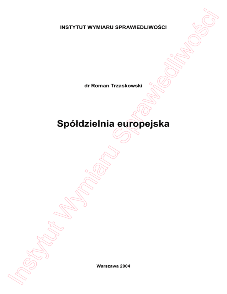 raw dr Roman Trzaskowski ied ci liw o INSTYTUT WYMIARU SPRAWIEDLIWO CI Ins tyt ut W ym i aru Sp Spó dzielnia europejska Warszawa 2004 ci Spis tre ci Wprowadzenie ..................................................................................................... 1 II. To samo liw o I. ruchu spó dzielczego i jego promocja ............................................... 3 1. Warto ci i zasady ruchu spó dzielczego .......................................................... 3 1.1. Deklaracja To samo ci Spó dzielczej....................................................... 4 ied 1.2. Cechy charakterystyczne spó dzielni w wietle Komunikatu Komisji dla Rady i Parlamentu Europejskiego, Europejskiego Komitetu Ekonomiczno-Spo ecznego oraz Komitetu Regionów z dnia 23 lutego 2004 r. o promowaniu spó dzielni w Europie (COM (2004) 18) ............. 11 2. Praktyczne znaczenie spó dzielni w Europie i w wiecie ............................... 12 raw 3. Próba popularyzacji ruchu spó dzielczego ..................................................... 13 III. Charakterystyka Rozporz dzenia....................................................................... 16 1. Cele regulacji ................................................................................................. 16 2. Stosunek do ustawodawstwa krajowego i zakaz dyskryminacji ..................... 17 Sp 2.1. Problem implementacji ........................................................................... 17 2.2. Prawo w ciwe ...................................................................................... 18 3. Podstawowe rozwi zania prawne .................................................................. 21 3.1. Spó dzielnia europejska - podstawowe elementy konstrukcyjne............. 22 aru 3.2. Tworzenie spó dzielni ............................................................................. 23 3.3. Kapita spó dzielni ................................................................................... 26 Zabezpieczenie warto ci minimalnej i realnej oraz zmiany wysoko ci.................................................................................. 26 3.3.2. Udzia y ...................................................................................... 27 ym i 3.3.1. 3.4. Odpowiedzialno za zobowi zania spó dzielni...................................... 28 3.5. Siedziba i jej przeniesienie...................................................................... 29 3.5.1. Przeniesienie siedziby .............................................................. 29 ut W 3.5.2. Okre lenie siedziby................................................................... 29 3.6. Statut ...................................................................................................... 31 3.7. Cz onkostwo w spó dzielni ...................................................................... 32 Uzyskanie cz onkostwa ............................................................. 32 3.7.2. Utrata cz onkostwa.................................................................... 33 3.7.3. Rozliczenia zwi zane z wyst pieniem oraz wykluczeniem ....... 34 3.7.4. Prawa cz onków ........................................................................ 35 Ins tyt 3.7.1. Prawo g osu........................................................................ 35 Prawo do informacji ............................................................ 36 Prawo do dywidendy........................................................... 37 ci 3.8. Organy spó dzielni .................................................................................. 37 System dualistyczny ................................................................. 37 liw o 3.8.1. Organ zarz dzaj cy............................................................ 37 Organ nadzorczy ................................................................ 38 3.8.2. System monistyczny ................................................................. 39 3.8.3. Zasady wspólne ........................................................................ 40 ied Kadencja, uczestnictwo w organach osób prawnych i odpowiedzialno cz onków organów................................. 40 Kompetencje organów SCE................................................ 40 Walne zgromadzenie ................................................................ 42 W ciwo ......................................................................... 42 raw 3.8.4. Zwo ywanie i przebieg walnego zgromadzenia................... 42 Podejmowanie uchwa ........................................................ 43 Zgromadzenia sektorowe i zgromadzenia sekcji ................ 44 Sp 3.9. Stosunki maj tkowe w spó dzielni........................................................... 45 Wystawienie papierów warto ciowych ...................................... 45 3.9.2. Przeznaczanie zysku ................................................................ 46 3.9.3. Podzia aktywów po rozwi zaniu spó dzielni ............................. 47 3.9.4. Bilans roczny i bilans skonsolidowany ...................................... 48 aru 3.9.1. 3.10. Rozwi zanie i przekszta cenie spó dzielni ............................................. 48 3.10.1. Przekszta cenie SCE w zwyk spó dzielni .............................. 48 3.10.2. Rozwi zanie SCE ..................................................................... 49 ym i IV. Dyrektywa Rady 2003/72/WE z dnia 22 lipca 2003 r. uzupe niaj ca statut spó dzielni europejskiej w odniesieniu do uczestnictwa pracowników (wzmianka)......................................................................................................... 50 1. Znaczenie Dyrektywy dla utworzenia SCE .................................................... 50 ut W 2. Stosunek do prawa krajowego ....................................................................... 51 2.1. Obowi zek implementacji ....................................................................... 51 2.2. Pro