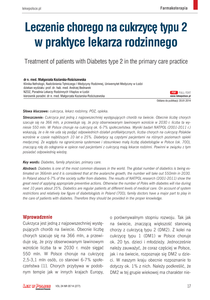 Farmakoterapia lekwpolsce.pl Leczenie chorego na cukrzycę typu 2 w praktyce lekarza rodzinnego Treatment of patients with Diabetes type 2 in the primary care practice dr n. med. Małgorzata Koziarska-Rościszewska Klinika Nefrologii, Nadciśnienia Tętniczego I Medycyny Rodzinnej, Uniwersytet Medyczny w Łodzi dziekan wydziału: prof. dr. hab. med. Andrzej Bednarek NZOZ, Poradnia Lekarzy Rodzinnych Vitaplus w Łodzi kierownik poradni: dr n. med. Małgorzata Koziarska-Rościszewska PDF FULL-TEXT www.lekwpolsce.pl Oddano do publikacji: 20.01.2014 Słowa kluczowe: cukrzyca, lekarz rodzinny, POZ, opieka. Streszczenie: Cukrzyca jest jedną z najpowszechniej występujących chorób na świecie. Obecnie liczbę chorych szacuje się na 366 mln, a przewiduje się, że przy obserwowanym lawinowym wzroście w 2030 r. liczba ta wyniesie 550 mln. W Polsce choruje na cukrzycę ok. 6-7% społeczeństwa. Wyniki badań NATPOL (2001-2011 r.) wskazują, że o ile nie uda się podjąć odpowiednich działań profilaktycznych, liczba chorych na cukrzycę Polaków wzrośnie w czasie najbliższych 10 lat o 25%. Diabetycy są częstymi pacjentami na różnych poziomach opieki medycznej. Ze względu na ograniczenia systemowe i stosunkowo małą liczbę diabetologów w Polsce (ok. 700), znaczącą rolę do odegrania w opiece nad pacjentami z cukrzycą mają lekarze rodzinni. Powinni w związku z tym posiadać odpowiednią wiedzę. Key words: Diabetes, family physician, primary care. Abstract: Diabetes is one of the most common diseases in the world. The global number of diabetics is being estimated on 366mln and it is considered that at the avalanche growth, the number will take out 550mln in 2030. In Poland about 6-7% of the society suffer from diabetes. The results of NATPOL research (2001-2011) show the great need of applying appropriate preventive actions. Otherwise the number of Poles with diabetes will rise during next 10 years about 25%. Diabetics are regular patients at different levels of medical care. On account of system restrictions and relatively low figure of diabetologists in Poland (700), family doctors have a major part to play in the care of patients with diabetes. Therefore they should be provided in the proper knowledge. Wprowadzenie Cukrzyca jest jedną z najpowszechniej występujących chorób na świecie. Obecnie liczbę chorych szacuje się na 366 mln, a przewiduje się, że przy obserwowanym lawinowym wzroście liczba ta w 2030 r. może sięgać 550 mln. W Polsce choruje na cukrzycę 2,5-3,1 mln osób, co stanowi 6-7% społeczeństwa [1]. Chorych przybywa w podobnym tempie jak w innych krajach Europy, VOL 24 NR 05’14 (277) o porównywalnym stopniu rozwoju. Tak jak na świecie, znaczącą większość stanowią chorzy z cukrzycą typu 2 (DM2). Z kolei na cukrzycę typu 1 (DM1) w Polsce choruje ok. 20 tys. dzieci i młodzieży. Jednocześnie należy zauważyć, że coraz częściej w Polsce, jak i na świecie, rozpoznaje się DM2 u dzieci. W naszym kraju obecnie rozpoznanie to dotyczy ok. 1% z nich. Należy podkreślić, że DM2 w tej grupie wiekowej ma charakter nie17 Farmakoterapia odwracalny (!) [1]. Prognozy dla Polski dotyczące statystyki cukrzycy są równie zatrważające jak w innych krajach. Wyniki badań NATPOL (2001-2011 r.) [2,3,4] wskazują, że o ile nie uda się wypracować i stosować powszechnie odpowiednich działań profilaktycznych (jak chociażby w zakresie zdrowego stylu życia), również i w naszym kraju staniemy wobec problemu narastającej epidemii. Liczba chorych wzrośnie bowiem w czasie najbliższych 10 lat o 25%. Zjawisko to wynika także z faktu wydłużenia się przeciętnego czasu życia i tym samym zwiększenia się liczby osób starszych, a także ze wzrostu liczby osób z nadwagą i otyłością. Należy zauważyć, że u osób > 60. r.ż. co piąta osoba choruje na cukrzycę, a > 80 r.ż. aż 40%, przy czym w większości są to kobiety [1]. Chorzy na cukrzycę są częstymi pacjentami zarówno w gabinetach lekarzy rodzinnych/ /podstawowej opieki zdrowotnej (POZ), jak i specjalistycznych – diabetologicznych, kardiologicznych, neurologicznych, chirurgicznych, okulistycznych (zależnie od pojawiających się problemów i powikłań). Ze względu na ograniczenia systemowe i stosunkowo małą liczbę diabetologów w Polsce (ok. 700), znaczącą rolę do odegrania w opiece nad pacjentami z cukrzycą mają lekarze rodzinni. Rolę tę docenia środowisko diabetologów, czego wyrazem jest różnego typu współpraca z lekarzami rodzinnymi, w tym także związana z tworzeniem odpowiednich zaleceń i wytycznych postępowania [5]. Ważne jest, aby lekarze opiekujący się chorymi na cukrzycę oraz osobami z czynnikami ryzyka tej groźnej choroby, wdrażali (pomimo różnych ograniczeń wynikających z polityki zdrowotnej) najnowsze rekomendacje, ze szczególnym uwzględnieniem działań profilaktycznych. 18 lekwpolsce.pl Zalecenia W świetle wyników światowych badań z ostatnich lat (ACCORD, VADT, ADVANCE) [6,11] szczególnie istotna jest właściwa, intensywna terapia osób ze świeżo wykrytą cukrzycą. Stwierdzono bowiem, że najlepsze efekty wynikające z modyfikacji stylu życia i leczenia farmakologicznego można osiągnąć w tej właśnie grupie chorych, gdy nie doszło jeszcze do rozwoju powikłań. Uważa się, że pierwsze lata leczenia cukrzycy mają decydujące znaczenie dla losów chorego [6-11]. Jednocześnie w tych samych badaniach wykazano, odchodząc od dotychczasowych poglądów, że podejmowanie intensywnego leczenia chorych na cukrzycę powikłaną angiopatią (po przebytym udarze, zawale serca lub amputacji) nie tylko nie daje korzyści choremu, a wręcz wiąże się ze skróceniem czasu przeżycia (!) [6-11]. Na uwagę zasługują badania amerykańskie z 2012 r. wskazujące także na największą korzyść ekonomiczną wynikającą z badań przesiewowych osób z grup wysokiego ryzyka cukrzycy: z BMI>35 kg/m2, RR skurczowym ≥ 130 mm