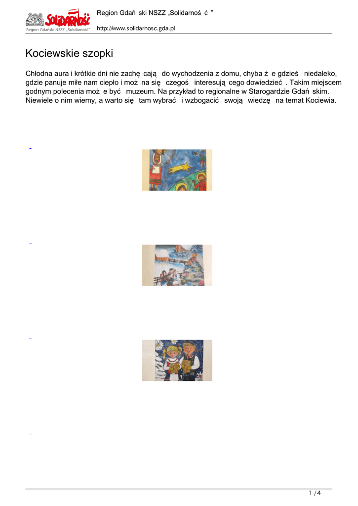 Region Gda ski NSZZ „Solidarno http://www.solidarnosc.gda.pl Kociewskie szopki Chłodna aura i krótkie dni nie zach caj do wychodzenia z domu, chyba e gdzie niedaleko, gdzie panuje miłe nam ciepło i mo na si czego interesuj cego dowiedzie . Takim miejscem godnym polecenia mo e by muzeum. Na przykład to regionalne w Starogardzie Gda skim. Niewiele o nim wiemy, a warto si tam wybra i wzbogaci swoj wiedz na temat Kociewia. 1/4 Region Gda ski NSZZ „Solidarno http://www.solidarnosc.gda.pl 2/4 Region Gda ski NSZZ „Solidarno http://www.solidarnosc.gda.pl Od 22 lat na Kociewiu organizowany jest konkurs na najpi kniejsz szopk bo onarodzeniow Bior w nim udział dzieci ze szkół podstawowych i gimnazjów, młodzie , osoby niepełnosprawne, jak i doro li, ludowi arty ci. Obowi zuje zasada tworzenia formy przestrzennej, trwałej, ale z uwzgl dnieniem charakterystycznych elementów dla Kociewia. Na konkurs zwi zany z niedawno prze ywanymi wi tami Bo ego Narodzenia zgłoszono 98 szopek i 700 kartek pocztowych. Wiele z nich to prawie arcydzieła. Tematem przewodnim stał si betlejemski łóbek, a wi c Matka Boska, Dzieci tko Jezus i wi ty Józef. Aczkolwiek w szopkach pojawiły si te zwierz ta, pasterze oraz inne postacie, jak chocia by wi ty Mikołaj czy muzykanci z akordeonem, fletem, diabelskimi skrzypcami. W wielu z nich wykorzystano takie materiały, jak kora drzew, brzozowe erdki, szyszki, trzcina, siano, mech. Inne, nawi zuj c do tradycji, uwzgl dniły wzory malowanych kwiatów, kociewsk kolorystyk 3/4 . Region Gda ski NSZZ „Solidarno http://www.solidarnosc.gda.pl mniej barwn ni na Kaszubach i bardziej wpadaj c w br zy, a nawet elementy tamtejszego stroju. Tak wi c Matka Boska ma kociewsk kerej , czyli spódnic , fartuch, a nawet stanik z chójank , inaczej serdak, albo kaftanik z choink . Nawet anioł dm cy w tr b ma kociewski fartuch, w innych rejonach Polski zwany zapask . Na niektórych szopkach pojawiły si napisy, niby to łaci skie, ale z akcentem gwary kociewskiej, a mo e kaszubskiej. S te szopki z lukrowanych pierników, z gliny, wikliny… Oprócz szopek konkurs rozpisano równie na kartki wi teczne. Jedna z nich zrobiła na mnie szczególne wra enie. Jest na niej wi ta Rodzina, gwiazda betlejemska, jarz bina i anioł w typowym e skim kociewskim stroju. Czerwona spódnica z modrymi lamówkami, biały fartuch z kieszeni , kaftanik, a do tego czepiec w formie złotego nimbu wyszywanego czerwonymi koralami, a na nogach czarne trzewiki, stój niemal taki sam, jaki nosz członkowie kociewskiej kapeli. Kompozycja, a tak e układ postaci, nie mówi c ju o barwach, skojarzyły mi si z malarstwem Marca Chagalla, znakomitego artysty yj cego na przełomie XIX i XX wieku, reprezentuj cego nurt sztuki zwanej kubizmem. Zapewne nic nie byłoby w tym dziwnego, gdyby nie fakt, e ow kartk wykonała uczennica szkoły podstawowej. Sk d u niej taka pomysłowo czy by prawdziwy talent? Notabene na kilka innych pocztówek te zwróciłam uwag , bo poziom ich wykonania jest wysoki. Niestety, czas Bo ego Narodzenia ju si zako czył. I chocia wraz ze wi tem Matki Boskiej Gromnicznej (przypadaj cym na 2 lutego) znikn ły ostatnie choinki, a szopki eksponowane w starogardzkim ko ciele pod wezwaniem w. Wojciecha wróciły do wła cicieli, to na długo pozostan w pami ci. Tekst i zdj cia Maria Giedz 4/4 Powered by TCPDF (www.tcpdf.org) ,
