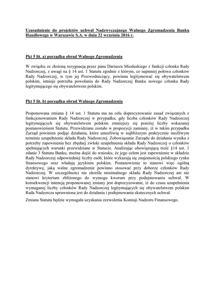 Uzasadnienie do projektów uchwał Nadzwyczajnego Walnego Zgromadzenia Banku Handlowego w Warszawie S.A. w dniu 22 września 2016 r. Pkt 5 lit. a) porządku obrad Walnego Zgromadzenia W związku ze złożoną rezygnacją przez pana Dariusza Mioduskiego z funkcji członka Rady Nadzorczej, z uwagi na § 14 ust. 1 Statutu zgodnie z którym, co najmniej połowa członków Rady Nadzorczej, w tym jej Przewodniczący, powinna legitymować się obywatelstwem polskim, istnieje potrzeba powołania do Rady Nadzorczej Banku nowego członka Rady legitymującego się obywatelstwem polskim. Pkt 5 lit. b) porządku obrad Walnego Zgromadzenia Proponowana zmiana § 14 ust. 1 Statutu ma na celu doprecyzowanie zasad związanych z funkcjonowaniem Rady Nadzorczej w przypadku, gdy liczba członków Rady Nadzorczej legitymujących się obywatelstwem polskim zmniejszy się poniżej liczby wskazanej postanowieniem Statutu. Przewidziane zostało w propozycji zamiany, iż w takim przypadku Zarząd powinien podjąć działania, które umożliwią w najbliższym praktycznie możliwym terminie uzupełnienie składu Rady Nadzorczej. Zobowiązanie Zarządu do działania wynika z potrzeby zapewnienia bez zbędnej zwłoki uzupełnienia składu Rady Nadzorczej o członków spełniających warunki przewidziane w Statucie. Analizując obowiązującą treść §14 ust. 1 zdanie 3 Statutu Banku, można dojść do wniosku, że jego celem jest zapewnienie w składzie Rady Nadzorczej odpowiedniej liczby osób, które wykazują się znajomością polskiego rynku finansowego oraz władają językiem polskim. Postanowienie to stanowi więc ogólną dyrektywę, jaką walne zgromadzenie powinno stosować przy doborze członków Rady Nadzorczej. W szczególności nie określa minimalnego składu Rady Nadzorczej ani nie stanowi kryterium zbliżonego do wymogu kworum przy podejmowaniu uchwał. W konsekwencji intencją proponowanej zmiany jest doprecyzowanie, iż do czasu uzupełnienia wymaganej liczby członków Rady Nadzorczej legitymujących się obywatelstwem polskim Rada Nadzorcza uprawniona jest do działania i podejmowania skutecznych uchwał. Zmiana Statutu będzie wymagała uzyskania zezwolenia Komisji Nadzoru Finansowego.
