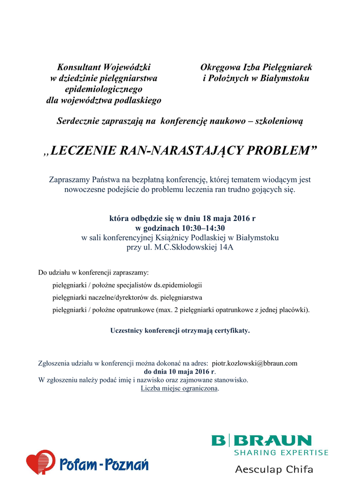 Konsultant Wojewódzki w dziedzinie pielęgniarstwa epidemiologicznego dla województwa podlaskiego Okręgowa Izba Pielęgniarek i Położnych w Białymstoku Serdecznie zapraszają na konferencję naukowo – szkoleniową „LECZENIE RAN-NARASTAJĄCY PROBLEM” Zapraszamy Państwa na bezpłatną konferencję, której tematem wiodącym jest nowoczesne podejście do problemu leczenia ran trudno gojących się. która odbędzie się w dniu 18 maja 2016 r w godzinach 10:30–14:30 w sali konferencyjnej Książnicy Podlaskiej w Białymstoku przy ul. M.C.Skłodowskiej 14A Do udziału w konferencji zapraszamy: pielęgniarki / położne specjalistów ds.epidemiologii pielęgniarki naczelne/dyrektorów ds. pielęgniarstwa pielęgniarki / położne opatrunkowe (max. 2 pielęgniarki opatrunkowe z jednej placówki). Uczestnicy konferencji otrzymają certyfikaty. Zgłoszenia udziału w konferencji można dokonać na adres: [email protected] do dnia 10 maja 2016 r. W zgłoszeniu należy podać imię i nazwisko oraz zajmowane stanowisko. Liczba miejsc ograniczona. Program: 10:00 - 10:30 Rejestracja uczestników konferencji Zarządzanie ryzykiem w leczeniu ran. mgr Maria Budnik – Szymoniuk, Katedra Pielęgniarstwa i Położnictwa, Zakład Pielęgniarstwa Społecznego Colegium Medicum w Bydgoszczy, Prezes Polskiego Towarzystwa Pielęgniarstwa Infuzyjnego Leczenie ran przewlekłych w warunkach ambulatoryjnych- doświadczenia własne Agata Leszczyńska Nowe opatrunki do leczenia ran przewlekłych 10:30 – 12:30 Dyskusja 12:30 – 13.00 Przerwa kawowa „Wynalazki” w leczeniu ran – NPWT. dr n. med. Marek Czajkowski, Kl. Kardiochirurgii SPSK – 4 w Lublinie Rana ostra, zainfekowana, przewlekła – studium przypadku . mgr Maria Budnik – Szymoniuk, Katedra Pielęgniarstwa i Położnictwa, 13:00 – 14:30 Zakład Pielęgniarstwa Społecznego Colegium Medicum w Bydgoszczy, Prezes Polskiego Towarzystwa Pielęgniarstwa Infuzyjnego Dyskusja Wręczenie certyfikatów 14:30 Lunch