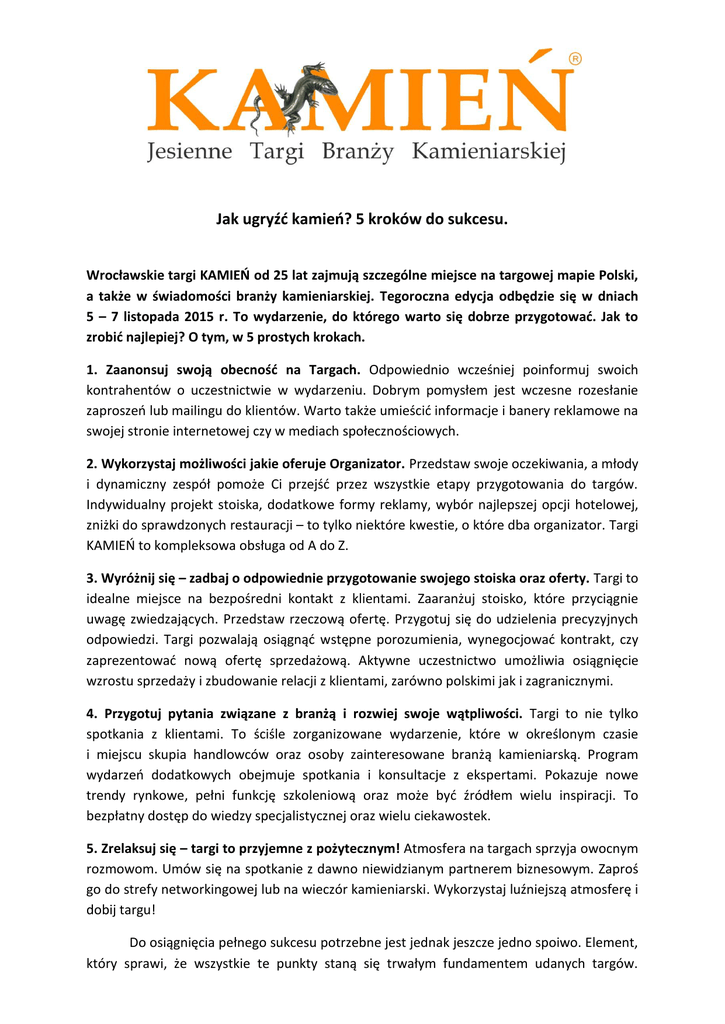 Jak ugryźć kamień? 5 kroków do sukcesu. Wrocławskie targi KAMIEŃ od 25 lat zajmują szczególne miejsce na targowej mapie Polski, a także w świadomości branży kamieniarskiej. Tegoroczna edycja odbędzie się w dniach 5 – 7 listopada 2015 r. To wydarzenie, do którego warto się dobrze przygotować. Jak to zrobić najlepiej? O tym, w 5 prostych krokach. 1. Zaanonsuj swoją obecność na Targach. Odpowiednio wcześniej poinformuj swoich kontrahentów o uczestnictwie w wydarzeniu. Dobrym pomysłem jest wczesne rozesłanie zaproszeń lub mailingu do klientów. Warto także umieścić informacje i banery reklamowe na swojej stronie internetowej czy w mediach społecznościowych. 2. Wykorzystaj możliwości jakie oferuje Organizator. Przedstaw swoje oczekiwania, a młody i dynamiczny zespół pomoże Ci przejść przez wszystkie etapy przygotowania do targów. Indywidualny projekt stoiska, dodatkowe formy reklamy, wybór najlepszej opcji hotelowej, zniżki do sprawdzonych restauracji – to tylko niektóre kwestie, o które dba organizator. Targi KAMIEŃ to kompleksowa obsługa od A do Z. 3. Wyróżnij się – zadbaj o odpowiednie przygotowanie swojego stoiska oraz oferty. Targi to idealne miejsce na bezpośredni kontakt z klientami. Zaaranżuj stoisko, które przyciągnie uwagę zwiedzających. Przedstaw rzeczową ofertę. Przygotuj się do udzielenia precyzyjnych odpowiedzi. Targi pozwalają osiągnąć wstępne porozumienia, wynegocjować kontrakt, czy zaprezentować nową ofertę sprzedażową. Aktywne uczestnictwo umożliwia osiągnięcie wzrostu sprzedaży i zbudowanie relacji z klientami, zarówno polskimi jak i zagranicznymi. 4. Przygotuj pytania związane z branżą i rozwiej swoje wątpliwości. Targi to nie tylko spotkania z klientami. To ściśle zorganizowane wydarzenie, które w określonym czasie i miejscu skupia handlowców oraz osoby zainteresowane branżą kamieniarską. Program wydarzeń dodatkowych obejmuje spotkania i konsultacje z ekspertami. Pokazuje nowe trendy rynkowe, pełni funkcję szkoleniową oraz może być źródłem wielu inspiracji. To bezpłatny dostęp do wiedzy specjalistycznej oraz wielu ciekawostek. 5. Zrelaksuj się – targi to przyjemne z pożytecznym! Atmosfera na targach sprzyja owocnym rozmowom. Umów się na spotkanie z dawno niewidzianym partnerem biznesowym. Zaproś go do strefy networkingowej lub na wieczór kamieniarski. Wykorzystaj luźniejszą atmosferę i dobij targu! Do osiągnięcia pełnego sukcesu potrzebne jest jednak jeszcze jedno spoiwo. Element, który sprawi, że wszystkie te punkty staną się trwałym fundamentem udanych targów. Ostatnia rzecz łącząca aspekty wymienione powyżej. Najważniejsi zawsze byli, są i będą LUDZIE, którzy tworzą to wydarzenie. To właśnie oni są jednym z najważniejszych powodów, dla których KAMIEŃ wrócił na swoje miejsce – do Wrocławia. Tutaj ma swoją historię, tutaj jest jego serce i dusza. Można wytykać błędy i potknięcia, jednak nigdy nie zabierze się wrocławskim targom tego, czym mogą się poszczycić – historii, tradycji, a przede wszystkim tego, że organizator od zawsze wsłuchuje się w potrzeby zarówno wystawców jak i zwiedzających. Młody i energiczny zespół wprowadza innowacyjne pomysły i szuka najlepszych rozwiązań. Jedno jest pewne – targi kamieniarskie wracają tam, gdzie powinny – do miejsca z sercem i duszą. Do miejsca, gdzie zaczyna się człowiek, który w biznesie jest najważniejszy. Powodzenia i do zobaczenia na targach KAMIEŃ we Wrocławiu! ORGANIZATOR: Geoservice – Christi sp. z o.o. tel. +48 71 343 21 04, fax +48 71 372 44 19 e-mail: [email protected] WIĘCEJ INFORMACJI NA: www.targikamien.pl www.geoservice.pl www.facebook.com/TargiKamien Informacja prasowa, wrzesień 2015 r.