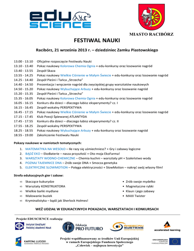 MIASTO RACIBÓRZ FESTIWAL NAUKI Racibórz, 21 września 2013 r. – dziedziniec Zamku Piastowskiego 13.00 - 13.10 13.10 - 13.40 13.40 - 13.55 13.55 - 14.25 14.25 - 14.40 14.40 - 14.50 14.50 - 15.20 15.20 - 15.35 15.35 - 16.05 16.05 - 16.15 16.15 - 16.45 16.45 - 17.15 17.15 - 17.45 17.45 - 17.55 17.55 - 18.25 18.25 - 18.55 18.55 - 19.00 Oficjalne rozpoczęcie Festiwalu Nauki Pokaz naukowy Kolorowa Chemia Ognia + edu-konkursy oraz losowanie nagród Zespół Skaza Pokaz naukowy Wielkie Ciśnienie w Małym Świecie + edu-konkursy oraz losowanie nagród Zespół Pieśni i Tańca „Strzecha” Prezentacja i wręczenie nagród dla zwycięskiej grupy warsztatów naukowych Pokaz naukowy Wybuchające Arbuzy + edu-konkursy oraz losowanie nagród Zespół Pieśni i Tańca „Strzecha” Pokaz naukowy Kolorowa Chemia Ognia + edu-konkursy oraz losowanie nagród Konkurs dla dzieci – dlaczego lubisz eksperymenty? cz. I Zespół wokalny PERSPEKTYWA Pokaz naukowy Wielkie Ciśnienie w Małym Świecie + edu-konkursy oraz losowanie nagród Klub Poezji Śpiewanej ATLANTYDA Konkurs dla dzieci – dlaczego lubisz eksperymenty? cz. II Zespół wokalny PERSPEKTYWA Pokaz naukowy Wybuchające Arbuzy + edu-konkursy oraz losowanie nagród Zakończenie Festiwalu Nauki Pokazy naukowe w namiotach tematycznych: 1. 2. 3. 4. 5. MATEMATYKA NA WESOŁO – Ile razy się uśmiechniesz? + Gry i zabawy logiczne BĄDŹ EKO – EkoBaterie – nasza przyszłość + Oto moja EkoFarma! WARSZTATY WODNO-CHEMICZNE – Chemia kuchni – warsztaty pH + Szaleństwo wody POZNAJ TAJEMNICE DNA – Zrób swoje DNA + Smocza genetyka ELEKTRYCZNE SLOWMOTION – Potęga elektryczności + SlowMotion – nakręć swój własny film! Strefa edukacyjnych gier i zabaw: • • • • • Skaczące kukurydze Warsztaty KONSTRUKTORA Wielkie bańki mydlane Malowanie buziek Kryminalistyka – bądź jak Sherlock Holmes! • • • • Zrób swoje mydełko Magnetyczne rybki Klaun i jego zabawy MAXI Twister WEŹ UDZIAŁ W EDUKACYJNYCH POKAZACH, WARSZTATACH I KONKURSACH Projekt EDUSCIENCE realizują: Projekt współfinansowany ze środków Unii Europejskiej w ramach Europejskiego Funduszu Społecznego „Człowiek – najlepsza inwestycja”