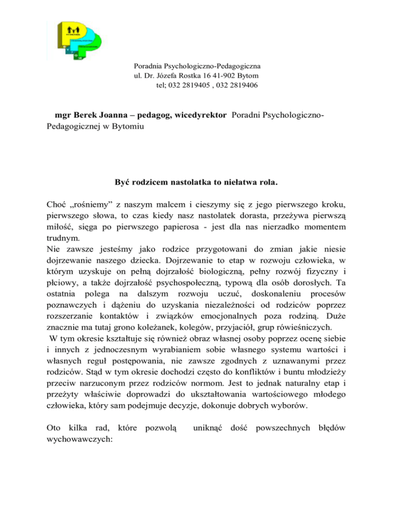 Poradnia Psychologiczno-Pedagogiczna ul. Dr. Józefa Rostka 16 41-902 Bytom tel; 032 2819405 , 032 2819406 mgr Berek Joanna – pedagog, wicedyrektor Poradni PsychologicznoPedagogicznej w Bytomiu Być rodzicem nastolatka to niełatwa rola. Choć „rośniemy” z naszym malcem i cieszymy się z jego pierwszego kroku, pierwszego słowa, to czas kiedy nasz nastolatek dorasta, przeżywa pierwszą miłość, sięga po pierwszego papierosa - jest dla nas nierzadko momentem trudnym. Nie zawsze jesteśmy jako rodzice przygotowani do zmian jakie niesie dojrzewanie naszego dziecka. Dojrzewanie to etap w rozwoju człowieka, w którym uzyskuje on pełną dojrzałość biologiczną, pełny rozwój fizyczny i płciowy, a także dojrzałość psychospołeczną, typową dla osób dorosłych. Ta ostatnia polega na dalszym rozwoju uczuć, doskonaleniu procesów poznawczych i dążeniu do uzyskania niezależności od rodziców poprzez rozszerzanie kontaktów i związków emocjonalnych poza rodziną. Duże znacznie ma tutaj grono koleżanek, kolegów, przyjaciół, grup rówieśniczych. W tym okresie kształtuje się również obraz własnej osoby poprzez ocenę siebie i innych z jednoczesnym wyrabianiem sobie własnego systemu wartości i własnych reguł postępowania, nie zawsze zgodnych z uznawanymi przez rodziców. Stąd w tym okresie dochodzi często do konfliktów i buntu młodzieży przeciw narzuconym przez rodziców normom. Jest to jednak naturalny etap i przeżyty właściwie doprowadzi do ukształtowania wartościowego młodego człowieka, który sam podejmuje decyzje, dokonuje dobrych wyborów. Oto kilka rad, które pozwolą wychowawczych: uniknąć dość powszechnych błędów Poradnia Psychologiczno-Pedagogiczna ul. Dr. Józefa Rostka 16 41-902 Bytom tel; 032 2819405 , 032 2819406 Unikajcie nadmiernej surowości. Dzieci chciałyby mieć więcej swobody, pozwalajcie im na to stopniowo, wyznaczając jednak pewne granice; pozwólcie im samym ustalić rozkład zajęć, zrealizować jakieś plany wakacyjne, wybierać sobie przyjaciół, chodzić z chłopcem czy dziewczyną, jeśli już do tego dojrzeli i jeżeli możecie mieć do nich zaufanie. Umówcie się, że jeżeli jadą gdzieś sami, zadzwonią po przybyciu na miejsce, by powiedzieć : „O.K., wszystko w porządku”, albo : „Przyjedźcie po nas, mamy kłopoty”. Młodzi muszą wiedzieć, że moglibyście się niepokoić i że mogą liczyć na was w każdej sytuacji. Nadmierna surowość może doprowadzić do zbędnej próby sił, a nawet do zerwania, i to przecież w okresie, kiedy dzieci bardziej niż kar potrzebują pomocy. Wysłuchajcie tego, co chcą wam powiedzieć. Pewnie was już nudzą te szkolne opowieści o nauczycielach, kolegach, grupach rockowych, o rodzajach muzyki młodzieżowej.... ale trzeba zdobyć się na wysiłek, nie udawać tylko, że się słucha, zainteresować się tym, co dzieci mówią, brać pod uwagę ich opinie. Młodzi skarżą się czasem, że pozwalamy im mówić tylko po to, żeby ich natychmiast osądzić. Zachęcajcie ich do podejmowania decyzji. Kiedy trzeba dokonać jakiegoś wyboru, stawiajcie im pytanie: jak decydujesz? Przypierajcie ich do muru, kiedy tylko to jest możliwe. Wyniki będą zaskakujące: im więcej samodzielności im pozostawimy, tym szybciej pozbędą się kompleksu debiutanta. Pytajcie ich zdanie. Uwielbiają to i bardzo im pochlebia, jeśli cenimy sobie ich sąd. Dziewczyna może doradzić matce, jak się malować czy ubrać, a ojcu pomóc w wyborze prezentu- i kontakt nawiązuje się sam. Nawiązuje się nić porozumienia i pozwala zniwelować dystans między wami; z kolei rozmowa na równej stopie wzmaga poczucie zaufania. Poradnia Psychologiczno-Pedagogiczna ul. Dr. Józefa Rostka 16 41-902 Bytom tel; 032 2819405 , 032 2819406 Bez przerwy dodawajcie im odwagi. Życzcie im dobrego dnia i szczęścia, jeśli boją się akurat klasówki z matematyki czy fizyki. Powiedzcie, że nie muszą chorować ze strachu, jeżeli się systematycznie uczyli; nie ma sensu wygłaszać przestróg w rodzaju: „tylko mi nie przynieś jedynki!” Powiedzcie im raczej, że u siebie w pracy też macie czasem sprawdzian, że macie jakąś robotę do oddania i że chcielibyście, żeby spotkała się z uznaniem. W ten sposób dzieci rozumieją, że różnica między nimi a wami nie jest znowu taka duża i że można pewne sprawy przezywać podobnie. Umiejcie przyznać się do błędu. Nie jesteśmy aniołami i jeśli nasze dzieci jeszcze o tym nie wiedzą, odkryją to w najbliższym czasie. Byłoby zresztą okropne trwać w przekonaniu, że zna się absolutnie najlepszą metodę wychowania dzieci. Codziennie popełniamy błędy i tracimy przeróżne okazje. Postarajmy się umieć przyznać, że są to tylko nasze błędy, a nie straty nie do odrobienia. Najlepszym sposobem zbliżenia się do własnych dzieci i włączenia ich do ogólnoludzkiej wspólnoty ludzi omylnych będzie widoczna nasza chęć poprawy, powstrzymywania się od złości, pochopnych sądów, niesprawiedliwych i ostrych wypowiedzi, wystrzeganie się braku zainteresowania czy skłonności do pedanterii. Bądźcie obecni. Nawet jeśli dzieci z nami nie rozmawiają i zamykają się w swoim pokoju, lubią odczuwać naszą obecność. Świadomość, że jesteśmy blisko, podtrzymuje ich na duchu. Nie brońcie się przed objawami czułości, których czasami dzieci od nas żądają. Czułość, nawet trochę niezdarna jest bardzo potrzebna. Bibliografia: Marie – Francoise Padioleau „Nastolatki czyli co dzieje się z ciałem i duszą, gdy ma się 13 – 18 lat ”.