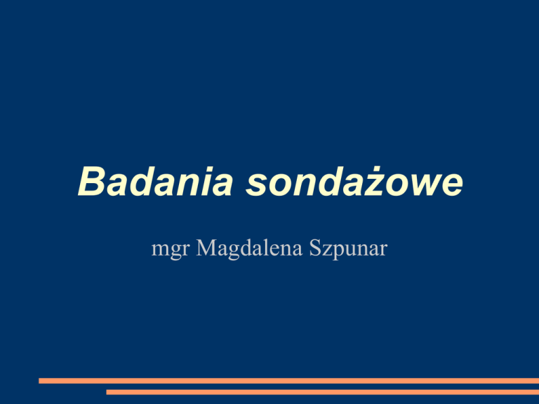Badania sondażowe mgr Magdalena Szpunar Metody zbierania danych sondażowych ● Ankieta pocztowa ● Wywiad bezpośredni ● Wywiad telefoniczny Tematy do badań sondażowych ● ● najlepsza metoda zbierania danych w celu opisania populacji zbyt dużej, by ją obserwować bezpośrednio dzięki starannemu doborowi losowemu możemy zakładać, że cechy naszych respondentów odzwierciedlają cechy szerszej populacji Ankieta pocztowa ● ● ● ● ● ZALETY niski koszt obniżenie błędu stronniczości większa anonimowość udzielanie przemyślanych odpowiedzi i możliwość konsultacji dostępność ● ● ● ● WADY wymaga prostych pytań brak możliwości sondowania utrata kontroli nad tym, kto udziela odpowiedzi niski odsetek odpowiedzi 20 - 40% Wywiad osobisty ● ● wywiad wg. ustrukturowanego planu: liczba zadawanych pyta oraz sposób ich formułowania są identyczne dla wszystkich respondentów wywiad zogniskowany: prowadzony wg. planu 1. odbywa się z osobami, które mają określone doświadczenia 2. odwołuje się do sytuacji, które były analizowane przed rozpoczęciem wywiadu 3. przeprowadzany zgodnie z planem 4. Skupia się na doświadczeniach badanych osób Wywiad osobisty c.d. ● wywiad nieukierukowany (swobodny): badacz nie kieruje się planem, nie zadaje pytań wg. ustalonej kolejności Wywiad osobisty WADY ZALETY ● ● ● ● elastyczność kontrolowanie sytuacji, w której prowadzony jest wywiad wyższy odsetek otrzymanych odpowiedzi zbieranie dodatkowych informacji ● ● ● wyższe koszty stronniczość osoby prowadzącej wywiad brak anonimowości Zasady prowadzenia wywiadu ● ● ● ● ● powiedz respondentowi kim jesteś i kogo reprezentujesz powiedz respondentowi, co robisz, tak, aby wzbudzić jego zainteresowanie powiedz respondentowi, w jaki sposób został wybrany dostosuj swoje postępowanie do sytuacji stwórz atmosferę zaufania i zrozumienia Sondowanie ● ● ● osoba prowadząca wywiad stymuluje do dyskusji i otrzymywania większej ilości informacji motywuje respondentów do poszerzania, wyjaśniania własnej odpowiedzi im wywiad jest mniej ustrukturowany, tym ważniejszą rolę pełni sondowanie Wywiad telefoniczny ● ● ● Przeciętne koszty Krótki czas, duża liczba respondentów Kontrola poprawności zadawania pytań i poprawność rejestrowania danych ● ● ● Możliwość odmowy odpowiedzi na pytania „przerywanie” wywiadu Mniej informacji Porównanie metod sondażowych Źródło: C. Frankfort-Nachmias, D. Nachmias, Metody badawcze w naukach społecznych Zadawanie pytań ● ● ● ● ● ● stwierdzenia i pytania (pomocna skala Likerta) pytania otwarte i zamknięte pytania jednoznaczne pytania podwójne respondenci muszą być w stanie udzielić odpowiedzi pytania krótkie, bez form przeczących