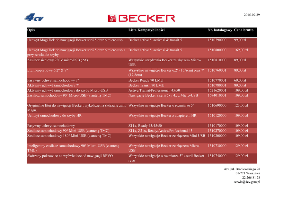 2015-09-29 Opis Lista Kompatybilności Nr. katalogowy Cena brutto Uchwyt MagClick do nawigacji Becker serii 5 oraz 6 micro-usb Becker active.5, active.6 & transit.5 1510790000 99,00 zł Uchwyt MagClick do nawigacji Becker serii 5 oraz 6 micro-usb z Becker active.5, active.6 & transit.5 przyssawką do szyby Zasilacz sieciowy 230V microUSB (2A) Wszystkie urządzenia Becker ze złączem MicroUSB Etui neoprenowe 6.2" & 7" Wszystkie nawigacje Becker 6.2" (15,8cm) oraz 7" (17,8cm) Pasywny uchwyt samochodowy 7" Becker Ready 70 LMU Aktywny uchwyt samochodowy 7" Becker Transit 70 LMU Aktywny uchwyt samochodowy do szyby Micro-USB Active/Transit/Professional 45/50 Zasilacz samochodowy 90° Micro-USB (z anteną TMC) Nawigacje Becker z serii 5x i 4x z Micro-USB 1510800000 169,00 zł 1510810000 89,00 zł 1510760001 89,00 zł 1510770001 1510780001 1521620001 1674010001 69,00 zł 89,00 zł 109,00 zł 109,00 zł Oryginalne Etui do nawigacji Becker, wykończenia skórzane zam. Wszystkie nawigacje Becker o rozmiarze 5" Magn. Uchwyt samochodowy do szyby HR Wszystkie nawigacje Becker z adapterem HR 1510690000 123,00 zł 1510120000 109,00 zł Pasywny uchwyt samochodowy Zasilacz samochodowy 90° Mini-USB (z anteną TMC) Zasilacz samochodowy 180° Mini-USB (z anteną TMC) Z11x, Ready 43/45/50 1510170000 Z11x, Z21x, Ready/Active/Professional 43 1510270000 Wszystkie nawigacje Becker ze złączem Mini-USB 1510200000 109,00 zł 109,00 zł 109,00 zł Inteligentny zasilacz samochodowy 90° Micro-USB (z anteną TMC) Skórzany pokrowiec na wyświetlacz od nawigacji REVO Wszystkie nawigacje Becker ze złączem Micro1510730000 USB Wszystkie nawigacje o rozmiarze 5" z serii Becker 1510740000 revo 129,00 zł 129,00 zł 4cv | ul. Broniewskiego 28 01-771 Warszawa 22 266 81 78 [email protected]
