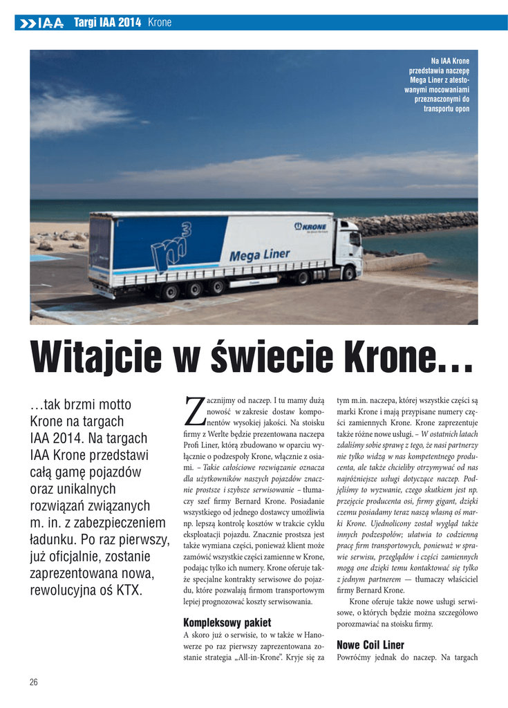 Targi IAA 2014 Krone Na IAA Krone przedstawia naczepę Mega Liner z atestowanymi mocowaniami przeznaczonymi do transportu opon Witajcie w świecie Krone… …tak brzmi motto Krone na targach IAA 2014. Na targach IAA Krone przedstawi całą gamę pojazdów oraz unikalnych rozwiązań związanych m. in. z zabezpieczeniem ładunku. Po raz pierwszy, już oficjalnie, zostanie zaprezentowana nowa, rewolucyjna oś KTX. Z acznijmy od naczep. I tu mamy dużą nowość w zakresie dostaw komponentów wysokiej jakości. Na stoisku firmy z Werlte będzie prezentowana naczepa Profi Liner, którą zbudowano w oparciu wyłącznie o podzespoły Krone, włącznie z osiami. – Takie całościowe rozwiązanie oznacza dla użytkowników naszych pojazdów znacznie prostsze i szybsze serwisowanie – tłumaczy szef firmy Bernard Krone. Posiadanie wszystkiego od jednego dostawcy umożliwia np. lepszą kontrolę kosztów w trakcie cyklu eksploatacji pojazdu. Znacznie prostsza jest także wymiana części, ponieważ klient może zamówić wszystkie części zamienne w Krone, podając tylko ich numery. Krone oferuje także specjalne kontrakty serwisowe do pojazdu, które pozwalają firmom transportowym lepiej prognozować koszty serwisowania. Kompleksowy pakiet A skoro już o serwisie, to w także w Hanowerze po raz pierwszy zaprezentowana zostanie strategia „All-in-Krone”. Kryje się za 26 tym m.in. naczepa, której wszystkie części są marki Krone i mają przypisane numery części zamiennych Krone. Krone zaprezentuje także różne nowe usługi. – W ostatnich latach zdaliśmy sobie sprawę z tego, że nasi partnerzy nie tylko widzą w nas kompetentnego producenta, ale także chcieliby otrzymywać od nas najróżniejsze usługi dotyczące naczep. Podjęliśmy to wyzwanie, czego skutkiem jest np. przejęcie producenta osi, firmy gigant, dzięki czemu posiadamy teraz naszą własną oś marki Krone. Ujednolicony został wygląd także innych podzespołów; ułatwia to codzienną pracę firm transportowych, ponieważ w sprawie serwisu, przeglądów i części zamiennych mogą one dzięki temu kontaktować się tylko z jednym partnerem — tłumaczy właściciel firmy Bernard Krone. Krone oferuje także nowe usługi serwisowe, o których będzie można szczegółowo porozmawiać na stoisku firmy. Nowe Coil Liner Powróćmy jednak do naczep. Na targach IAA Krone przedstawi Coil Liner w lżejszej wersji, o masie własnej wynoszącej zaledwie 5,85 t. Producent wychodzi w ten sposób naprzeciw zapotrzebowaniu firm transportowych na maksymalną ładowność naczepy podczas użytkowania ciężkich ciągników z silnikiem EURO 6. Kanał na zwoje ma długość 7236 mm i seryjnie wyposażony jest w cztery pary schowków na kłonice i dwie podpory zabezpieczające do zwojów. Ponadto w naczepie Coil z firanką przesuwną montowana jest standardowo rama zewnętrzna Multi Lock (z około 130 punktami mocowania po każdej stronie) oraz 8 par pierścieni mocujących do ciężkich ładunków w strefie ramy zewnętrznej. Natomiast trzy schowki na kłonice, które umieszczone są za sworzniem królewskim poprzecznie do kierunku jazdy, pozwalają na skuteczne unieruchomienie materiałów podłużnych. Obsługę ułatwia drewniana, lekka osłona muldy. Podłoga z płyt warstwowych ma grubość 30 mm, jest pokryta sklejką wodoodporną i wytrzymuje wjazd wózka widłowego o obciążeniu na oś do 5460 kg (norma CSC). Zarówno ściana czołowa, jak i drzwi kontenera wykonane są z lekkiego metalu. Nad stabilnością zachowania Coil Liner w trakcie jazdy czuwa system RSS, który stanowi standardowe wyposażenie wszystkich naczep Coil. Poza wersją ultra lekką na targach w Hanowerze Krone przedstawi także naczepę Cool Liner w wersji High Security. W chłodni wbudowanych jest wiele udogodnień, które przydają się kierowcy i firmie transportowej w codziennej pracy. Naczepa wyposażona jest w obszerny pakiet funkcji telematyki, funkcję monitorowania ciśnienia w ogumieniu, wspomagania podjazdu do rampy oraz rozbudowany system zabezpieczeń nadwozia chłodni. Drzwi zabezpieczone są przed włamaniem najskuteczniejszym systemem Door Protect High Security. Rygluje on je automatycznie za pomocą 8 blokad. Drzwi można otworzyć dopiero wtedy, gdy dyspozytor wyda odpowiednie zezwolenie za pośrednictwem telematyki i kierowca wprowadzi poprawny kod bezpieczeństwa. System Door Protect High Security to nie tylko blokada drzwi tylnych, ale także elektroniczne monitorowanie dachu i ścian bocznych. Każda próba otwarcia drzwi tylnych bez kodu może także wywoływać głośny alarm akustyczny. Cool Liner High Security to elastyczny i wszechstronny pojazd z najskuteczniejszymi zabezpieczeniami i nowoczesnym wyposażeniem. Prawdziwa wielkość — także podczas transportu opon Na IAA Krone przedstawia naczepę Mega Liner z atestowanymi mocowaniami przeznaczonymi do transportu opon. Podstawą systemu MultiTyre jest specjalnie stworzona do tego celu dwuścienna plandeka boczna z pięcioma wbudowanymi, pionowymi pro- filami aluminiowymi w czterech bocznych polach kłonic. Dodatkowo z każdej strony na całej długości pojazdu montuje się po dwie specjalne liny. Dzięki temu pracochłonne mocowanie na krzyż w przestrzeni ładunkowej nie jest już konieczne. Liny naciąga się wygodnie za pomocą hydraulicznych pomp ręcznych. System Multi Tyre firmy Krone został atestowany przez TÜV Nord jako mocowanie przeznaczone do transportu opon. Oprócz specjalnego wyposażenia do transportu opon Mega Liner odznacza się 27 Targi IAA 2014 Krone Na targach IAA Krone przedstawi Coil Liner w lżejszej wersji, o masie własnej wynoszącej zaledwie 5,85 t także innymi praktycznymi właściwościami. Jego przestrzeń ładunkowa wynosi 100 m³. Pojazd wyposażony jest w hydrauliczny dach podnoszony o 500 mm, co znacznie skraca czas załadunku i rozładunku, a także w wielokrotnie nagradzaną ramę zewnętrzną Multi Lock. Budowa Mega Liner spełnia