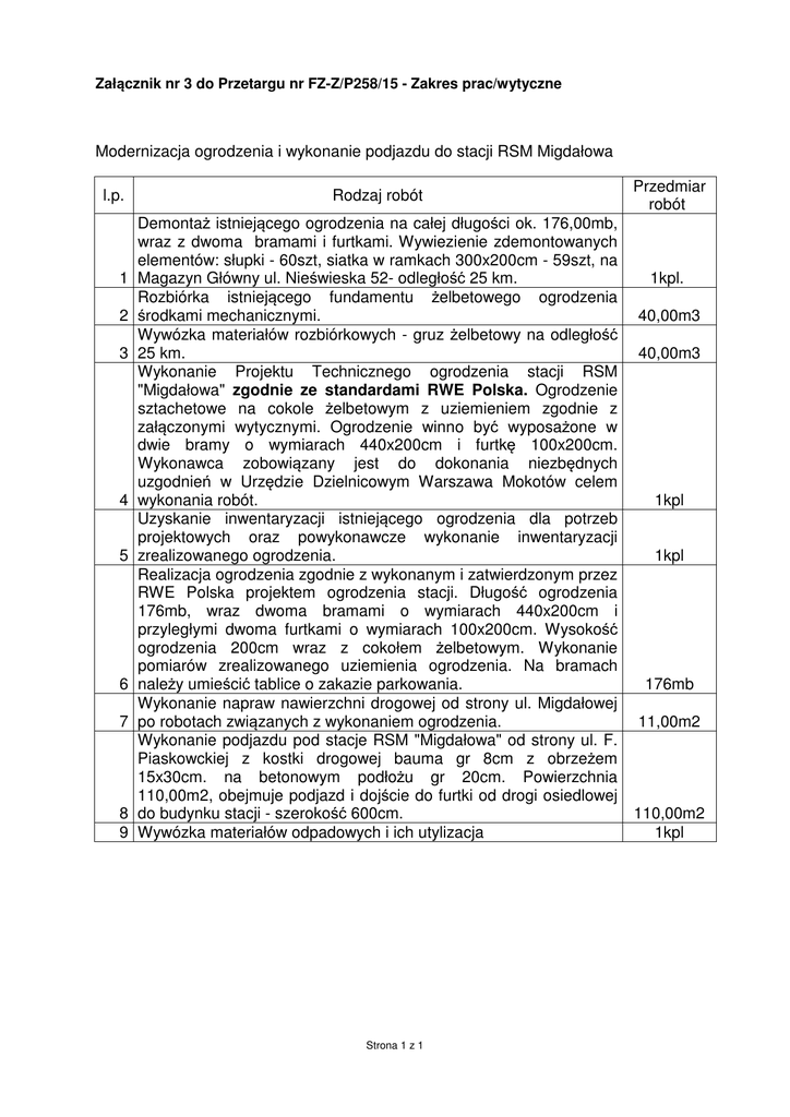 Załącznik nr 3 do Przetargu nr FZ-Z/P258/15 - Zakres prac/wytyczne Modernizacja ogrodzenia i wykonanie podjazdu do stacji RSM Migdałowa l.p. 1 2 3 4 5 6 7 8 9 Rodzaj robót Demontaż istniejącego ogrodzenia na całej długości ok. 176,00mb, wraz z dwoma bramami i furtkami. Wywiezienie zdemontowanych elementów: słupki - 60szt, siatka w ramkach 300x200cm - 59szt, na Magazyn Główny ul. Nieświeska 52- odległość 25 km. Rozbiórka istniejącego fundamentu żelbetowego ogrodzenia środkami mechanicznymi. Wywózka materiałów rozbiórkowych - gruz żelbetowy na odległość 25 km. Wykonanie Projektu Technicznego ogrodzenia stacji RSM "Migdałowa" zgodnie ze standardami RWE Polska. Ogrodzenie sztachetowe na cokole żelbetowym z uziemieniem zgodnie z załączonymi wytycznymi. Ogrodzenie winno być wyposażone w dwie bramy o wymiarach 440x200cm i furtkę 100x200cm. Wykonawca zobowiązany jest do dokonania niezbędnych uzgodnień w Urzędzie Dzielnicowym Warszawa Mokotów celem wykonania robót. Uzyskanie inwentaryzacji istniejącego ogrodzenia dla potrzeb projektowych oraz powykonawcze wykonanie inwentaryzacji zrealizowanego ogrodzenia. Realizacja ogrodzenia zgodnie z wykonanym i zatwierdzonym przez RWE Polska projektem ogrodzenia stacji. Długość ogrodzenia 176mb, wraz dwoma bramami o wymiarach 440x200cm i przyległymi dwoma furtkami o wymiarach 100x200cm. Wysokość ogrodzenia 200cm wraz z cokołem żelbetowym. Wykonanie pomiarów zrealizowanego uziemienia ogrodzenia. Na bramach należy umieścić tablice o zakazie parkowania. Wykonanie napraw nawierzchni drogowej od strony ul. Migdałowej po robotach związanych z wykonaniem ogrodzenia. Wykonanie podjazdu pod stacje RSM "Migdałowa" od strony ul. F. Piaskowckiej z kostki drogowej bauma gr 8cm z obrzeżem 15x30cm. na betonowym podłożu gr 20cm. Powierzchnia 110,00m2, obejmuje podjazd i dojście do furtki od drogi osiedlowej do budynku stacji - szerokość 600cm. Wywózka materiałów odpadowych i ich utylizacja Strona 1 z 1 Przedmiar robót 1kpl. 40,00m3 40,00m3 1kpl 1kpl 176mb 11,00m2 110,00m2 1kpl