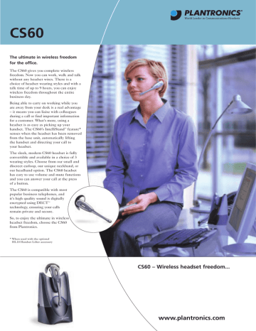 CS60 The ultimate in wireless freedom for the office. The CS60 gives you complete wireless freedom. Now you can work, walk and talk without any headset wires. There is a choice of headset wearing styles and with a talk time of up to 9 hours, you can enjoy wireless freedom throughout the entire business day. Being able to carry on working while you are away from your desk is a real advantage – it means you can liaise with colleagues during a call or find important information for a customer. What’s more, using a headset is as easy as picking up your handset. The CS60’s IntelliStand™ feature* senses when the headset has been removed from the base unit, automatically lifting the handset and directing your call to your headset. The sleek, modern CS60 headset is fully convertible and available in a choice of 3 wearing styles. Choose from our small and discreet earloop, our unique neckband, or our headband option. The CS60 headset has easy to use volume and mute functions and you can answer your call at the press of a button. The CS60 is compatible with most popular business telephones, and it’s high quality sound is digitally encrypted using DECT™ technology, ensuring your calls remain private and secure. So, to enjoy the ultimate in wireless headset freedom, choose the CS60 from Plantronics. * When used with the optional HL10 Handset Lifter accessory CS60 – Wireless headset freedom... www.plantronics.com CS60 Key Features Technical Data • Totally wireless solution – no headset cables Base Unit Technology DECT™ 1.8GHz Fully convertible with 3 wearing styles Operating Range 100m in free space, up to 50m in a typical office Transmit Volume Control 14dB +/- 0.5dB • • • 3 Base unit LED Indicators Power, Talk mode, Headset charging IntelliStand™ On/Off 2 position switch - enable/disable the IntelliStand™ feature • Earloop Neckband Headband Headset • Up to 100m range – in a typical office, up to 50m Headset weight Headset LED Indicator In-use indicator • 9 hrs talk time and with fast recharge Talk-time 9 hours Recharge time 1hr gives 5hrs talk-time, full charge achieved after 3hrs • IntelliStand™ makes answering a call as easy as picking up a handset (requires HL10 Lifter) Standby time 60hrs Out of Range warning Audible tone in headset Receive Volume Control 14dB +/- 0.5dB Volume control so you can set a comfortable listening level Mute Control Momentary on/off - mute transmit to listener Battery Lithium-ion Polymer • • Mute button so you can privately consult with colleagues • Talk button so you can easily answer and end your calls • Compatible with most business telephone systems • HL10 Lifter compatible for automatic handset control • DECT™ technology for secure, high quality audio 27.5g (over-the-ear) Specification subject to change Regional Telephone Numbers: Plantronics Ltd Wootton Bassett, UK 0800 410014 +44 (0)1793 842200 Plantronics Sarl Noisy-le-Grand, France No Indigo: 0825 0825 99 +33 1 41 67 4141 Plantronics B.V. Hoofddorp, Nederland (0)0800 PLANTRONICS 0800 7526876 (NL) 00800 75268766 (BE/LUX) Plantronics Acoustics Italia Srl Milano, Italia Numero Verde: 800 950934 +39 02951 1900 Plantronics GmbH Hürth, Deutschland 0800 9323400 +49 22 33 3990 Österreich: 0800 242500 Schweiz: 0800 932 340 Plantronics Iberia, S.L. Madrid, España 902 41 51 91 +34 91 640 47 44 © 2003 Plantronics, Inc. All rights reserved. Plantronics, the logo design, Plantronics and the logo design combined and IntelliStand are trademarks or registered trademarks of Plantronics, Inc. DECT is a trademark of ETSI. UK05/03 Plantronics Middle East, Eastern Europe, Africa and India +44 (0)1793 842443 Nordic Region Finland: 0201 550 550 Sverige: 031 28 95 00 Danmark: 44 35 05 35 Norge: 23 17 3770