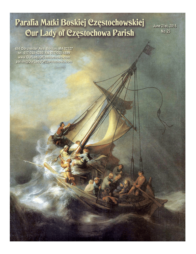 BIURO PARAFIALNE / PARISH OFFICE Tel: 617-268-4355; Fax: 617-268-4599 Monday - Friday - 8:00 am - 2:00 pm Saturday: 10:00 am - 12:00 pm Evenings and weekends - by appointment only. PORZĄDEK MSZY ŚWIĘTYCH MASS SCHEDULE Mon. - Wed. 7:00 am (English); 8:00 am (Polish) Thursday 7:00 am (English) 7:00 pm (Polish) Friday 7:00 am (English) 6:00 pm - 7:00 pm - Adoracja Najśw. Sakr. - Koronka Spowiedź - Adoration, Divine Mercy Chaplet, Confession 7:00 pm (Polish) Saturday 8:00 am (Polish) 4:00 pm (English) 7:00 pm (Polish) Sunday 8:00 am (Polish) 9:30 am (English) 11:00 am (Polish) Holydays - as announced SPOWIEDŹ / CONFESSIONS Friday 6:00 pm and every day 30 min. before Masses. CHRZEST / BAPTISM By arrangement with the priest. Instruction for parents and godparents is required. SAKRAMENT MAŁŻEŃSTWA / MARRIAGE Please, make arrangement with the parish office at least six months in advance. Instruction is required. SAKRAMENT CHORYCH/SACRAMENT OF THE SICK Parishioners who are seriously ill should call the office to arrange for a priest to visit and administer the Sacraments. ŻYCIE JEST DAREM OD BOGA Jeżeli odkryłaś, że pod Twym sercem poczęło się życie, przyjdź do nas sama lub z najbliższą osobą i podziel się tą wspaniałą nowiną. Będziemy Ci błogosławić, a jeśli trzeba - służyć pomocą. Nie lękaj się! - Ojcowie franciszkanie PASTORAL STAFF - FRANCISCAN FRIARS OJCOWIE FRANCISZKANIE (OFM Conv.) Fr. Jan Łempicki OFMConv. - pastor Fr. Józef Brzozowski OFMConv. - guardian & parochial vicar Fr. Aloysius Minyong Hong OFMConv. - in residence KATECHECI / CATECHISTS Diakon Paweł Sawiak - bierzmowanie; Urszula Boryczka - kl. 0 Elżbieta Sokołowska - kl. 0; Danuta Surowiec-Ramos - kl. 2; Zofia Fiedorczyk - kl. 3; Monika Danek - kl. 4; Anna Maziarz - kl. 5; Piotr Goszczynski - kl. 6; Danuta Daniels - kl. 6; Eugeniusz Bramowski - kl. 7; Alicja Szewczyk - zastępstwa; Beata Kozak - zastępstwa; Małgorzata Sokołowski - zastępstwa; Iwona Gajczak - koordynatorka PRACOWNICY PARAFII / OFFICE STAFF Secretary & Religious Education Coordinator - Mrs. Iwona Gajczak Bookkeeper & Office Assistant - Ms. Connie Bielawski RADA PARAFIALNA / PARISH COUNCIL Mr. Szymon Biegański, Mr. Grzegorz Boryczka, Mr. Eugeniusz Bramowski, Mr. Czesław Kilian, Mr. Jan Kozak, Ms. Maryann Sadowski, Mr. Zbigniew Saletnik, Ms. Danuta Urbaniak, Mrs. Lucy Willis, Mrs. Władzia Wygonowska RADA FINANSOWA / FINANCE COUNCIL Ms. Constance Bielawski, Mr. Grzegorz Boryczka, Mr. Maks Gradziuk, Mr. Rafał Jabłonka, Mr. Richard Rolak, Mr. Wiesław Wierzbowski SŁUŻBA MUZYCZNA / MUSIC MINISTRY Organist & Psalmist: Mrs. Marta Saletnik ZAKRYSTIA/SACRISTAN – KWIATY/FLOWERS Mrs. Beata Kozak & Mrs. Renata Marshall Misją Parafii Matki Bożej Częstochowskiej jest dawanie świadectwa wiary rzymsko-katolickiej i polskiego dziedzictwa. Ofiarnie i nieustannie służymy Bogu i sobie nawzajem zachowując i dzieląc się naszymi polskimi tradycjami w otwarciu się na wszystkich ludzi. Parafię obsługują Ojcowie Franciszkanie. The mission of the Parish of Our Lady of Czestochowa is to bear witness to our Roman Catholic faith and our Polish heritage. We strive to continue to serve God and each other, celebrating and sharing our Polish traditions, welcoming and reaching out to all people. The parish is served by Conventual Franciscan Friars. LIFE IS A GIFT FROM GOD If you discovered that a new life began under your heart, come to us alone or with someone you love, and share this wonderful news. We will bless you, and - if necessary - offer you help. Do not be afraid! - Franciscan Fathers ACTIVITIES & ORGANIZATIONS Sala św. Jana Pawła II — St. John Paul II Hall Kontakt w sprawie wynajmu sali: tel: 617-268-4355 W sprawie sprzętu audio-wizualnego tel. 617-922-3691 Contact for renting the hall: tel: 617-268-4355 For audio-visual equipment tel. 617-922-3691 (Mariusz) Ministranci / Altar Servers - Eugeniusz Bramowski Spotkania w pierwsze niedziele miesiąca w sali świętego Jana Pawła II o godz. 10:00 am (781-871-2991) Fundacja Kultury Polskiej - Polish Cultural Foundation, Inc. - Mr. Andrzej Pronczuk - tel. 617-859-9910 Polska Szkoła Sobotnia - Polish Saturday School - Mr. Jan Kozak - tel. 617-464-2485 Chór Parafialny i Chórek Dziecięcy Promyki św. Jana Pawła II - Parish Choir & Children Choir - Mrs. Marta Saletnik, tel. kom. 857-212-7962 Stowarzyszenie Weteranów Armii Polskiej - SWAP #37 Mr. Wincenty Wiktorowski - tel. 617-288-1649 Grupa AA - Stanisław, tel. 508 283 4262 Sala pod kościołem. 2 Spotkania odbywają się w każdy czwartek o godz. 7:00 pm Krakowiak - Wednesdays at 7:30 pm - St. John Paul II hall www.krakowiak.org,: Eric Pierce: Tel. 508-320-2344 Żywy Różaniec / Rosary Society - Mrs. Genowefa Lisek tel. 617-436-5779 Siostry Matki Bożej Miłosierdzia Sisters of Our Lady of Mercy: tel. 617-288-1202 Polski Amatorski Teatr w Bostonie / Polish Theater - Mrs. Małgorzata Tutko: tel. 617-325-2208 Harcerze / Polish Scouts - The meetings will be conducted in Polish for young boys and girls. Contact information: Mateusz Wozny, tel. 347-749-5867, email: [email protected] Klub Polski Polish American Citizens Club - Mr. Christopher Lisek Club: 617-436-2786; Cell: 617-436-2686 In the Storm "Do you not yet have faith?" Our Lord's question in today's Gospel frames the Sunday liturgies for the remainder of the year, which the Church calls "Ordinary Time." In the weeks ahead, the Church's liturgy will have us journeying with Jesus and His disciples, reliving their experience of His words and deeds, coming to know and believe in Him as they did. Notice that today's Psalm almost provides an outline for the Gospel. We sing of sailors caught in a storm; in their desperation, they call to the Lord and He rescues them. Mark's Gospel today also intends us to hear a strong echo of the story of the prophet Jonah. He, too, was found asleep on a boat when a life-threatening storm broke out that caused his fellow travelers to p