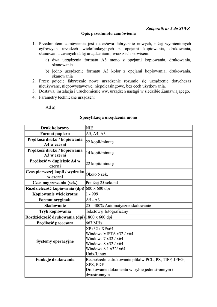 Załącznik nr 5 do SIWZ Opis przedmiotu zamówienia 1. Przedmiotem zamówienia jest dzierżawa fabrycznie nowych, niżej wymienionych cyfrowych urządzeń wielofunkcyjnych z opcjami kopiowania, drukowania, skanowania zwanych dalej urządzeniami, wraz z ich serwisem: a) dwa urządzenia formatu A3 mono z opcjami kopiowania, drukowania, skanowania b) jedno urządzenie formatu A3 kolor z opcjami kopiowania, drukowania, skanowania 2. Przez pojęcie fabrycznie nowe urządzenie rozumie się urządzenie dotychczas nieużywane, niepowystawowe, niepoleasingowe, bez cech użytkowania. 3. Dostawa, instalacja i uruchomienie ww. urządzeń nastąpi w siedzibie Zamawiającego. 4. Parametry techniczne urządzeń: Ad a): Specyfikacja urządzenia mono Druk kolorowy NIE Format papieru A5, A4, A3 Prędkość druku / kopiowania 22 kopii/minutę A4 w czerni Prędkość druku / kopiowania 14 kopii/minutę A3 w czerni Prędkość w dupleksie A4 w 22 kopii/minutę czerni Czas pierwszej kopii / wydruku Około 5 sek. w czerni Czas nagrzewania (sek.) Poniżej 25 sekund Rozdzielczość kopiowania (dpi) 600 x 600 dpi Kopiowanie wielokrotne 1 - 999 Format oryginału A5 - A3 Skalowanie 25 - 400% Automatyczne skalowanie Tryb kopiowania Tekstowy, fotograficzny Rozdzielczość drukowania (dpi) 1800 x 600 dpi Prędkość procesora 667 MHz XPx32 / XPx64 Windows VISTA x32 / x64 Windows 7 x32 / x64 Systemy operacyjne Windows 8 x32 / x64 Windows 8.1 x32/ x64 Unix/Linux Funkcje drukowania Bezpośrednie drukowanie plików PCL, PS, TIFF, JPEG, XPS, PDF Drukowanie dokumentu w trybie jednostronnym i dwustronnym Programowanie zadań Kolor/Mono do 70 skanów/minutę (300 dpi przez DF) Prędkość skanowania w czerni Kolor/Mono do 42 skanów/minutę (600 dpi przez DF) Rozdzielczość skanowania (dpi) Maks.: 600 x 600 dpi Scan-to-eMail Scan-to-FTP Tryby skanowania Scan-to-SMB Scan-to-Box (wymagany dysk twardy) Scan-to-USB Formaty plików JPEG; TIFF; PDF; XPS Miejsca docelowe skanowania (pojedyńczo + grupowo), wsparcie LDAP Ilość skrzynek użytkownika 999 Dotykowy kolorowy panel TAK, z komunikatami w języku polskim sterujący LCD Możliwość dodawania skrzynek użytkowników z Rodzaje skrzynek autoryzacją haseł Ponowny wydruk, łączenie, pobieranie, wysyłanie (do Funkcjonalność skrzynek wiadomości e-mail, FTP, SMB), kopiowanie między użytkownika skrzynkami Standardowa pamięć systemu 2048 MB (MB) Dysk twardy (GB) 250 GB Standardowe interfejsy 10Base-T/100Base-T/1000Base-T Ethernet, USB 2.0 TCP/IP (IPv4 / IPv6), IPX/SPX, NetBEUI, Protokoły sieciowe SMB, LPD, IPP, SNMP, HTTP Automatyczny podajnik Automatycznie odwracający dokumentów A6-A3, Dostosowany rozmiar papieru (90-297 x 139.7Rozmiar papieru 431.8 mm) Gramatura papieru (g/m²) 60-210 g/m² Pojemność papieru (arkusze) 1150 arkuszy Sortowanie elektroniczne TAK Taca 1: 500 arkuszy, A5 - A3, 60 - 90 g/m² Standardowe podajniki papieru Taca 2: 500 arkuszy, A5 - A3, 60 - 90 g/m² Podajnik ręczny: 150 arkuszy, A6-A3, 60 - 210 g/m² Automatyczny dupleks A5 - A3, 60 - 90 g/m² Broszura Możliwość wydruku broszur Pojemność tacy odbiorczej na 70 arkuszy broszury Pobór energii 220-240 V / 50/60Hz, Mniej niż 1.5 KW Szafka/stolik pod urządzenie TAK 999 kont użytkowników; obsługa Active Directory Konta użytkowników (login + hasło + e-mail + katalog smb) Definiowanie dostępu funkcji użytkownika Ad b): Specyfikacja urządzenia kolor Druk kolorowy TAK Druk mono TAK Format papieru A5, A4, A3 Prędkość druku / kopiowania 22 str./min. A4 w czerni Prędkość druku / kopiowania 22 str./min. A4 w kolorze Prędkość druku / kopiowania 14 str./min. A3 w czerni Prędkość druku / kopiowania 14 str./min. A4 w kolorze Prędkość w dupleksie A4 w 22 str./min. czerni Prędkość w dupleksie A4 w 22 str./min. kolorze Czas pierwszej kopii / wydruku Około 7 sek. w czerni Czas pierwszej kopii / wydruku Około 8 sek. w kolorze Około 20 sek. Czas nagrzewania (sek.) Rozdzielczość kopiowania (dpi) 600 x 600 Kopiowanie wielokrotne 1-999 Format oryginału A5-A3 Skalowanie 25-400% w odstępach automatyczne skalowanie Tryb kopiowania Tekstowy, fotograficzny Rozdzielczość drukowania 1,800 x 600 (dpi) 1,200 x 1,200 Prędkość procesora 800 MHz PCL6 (XL 3.0) PCL 5c Język opisu strony PostScript 3 (CPSI 3016) XPS Windows XP (32/64) Windows VISTA (32/64) Windows 7 (32/64) Windows 8 (32/64) Windows 8.1 (32/64) Systemy operacyjne Windows Server 2003 (32/64) Windows Server 2008 (32/64) Windows Server 2008 R2 (64) Windows Server 2012 (64) Unix, Linux Bezpośredni druk plików PCL, PS, TIFF, XPS, PDF oraz Funkcje drukowania zaszyfrowanych plików PDF i OOXML (docx, xlsx, pptx); programowanie zadań; nakładanie; znak wodny Prędkość skanowania w Do 80 oryginałów/min. z DF-624 kolorze Do 160 oryginałów/min. z DF-701 Do 80 oryginałów/min. z DF-624 Prędkość skanowania w czerni Do 160 oryginałów/min. z DF-701 Rozdzielczość skanowania Maks.: 600 x 600 (dpi) Skanowania na adres e-mail Skanowanie do SMB Skanowanie do FTP Tryby skanowania Skanowanie do skrzynki (wymagany dysk twardy) Skanowanie do USB Skanowanie sieciowe TWAIN Formaty plików JPEG; TIFF; PDF; XPS Miejsca docelowe skanowania 2100 (pojedynczo + grupowo); obsługa LDAP Możliwość dodawania skrzynek użytkowników z Rodzaje skrzynek autoryzacją haseł Rodzaje skrzynek Bezpieczne drukowanie systemowych Druk szyfrowanych plików PDF Ponowny wydruk, łączenie, pobieranie, wysyłanie (do Funkcjonalność skrzynek wiadomości e-mail, FTP, SMB), kopiowanie między użytkownika skrzynkami Standardowa pamięć systemu 2 048 (MB) Standardowy dysk twardy 250 (GB) Dotykowy kolorowy panel TAK, z komunikatami w języku polskim sterujący LCD 10-Base-T/100-Base-T/1,000-Base-T Ethernet Standardowe interfejsy USB 2.0 TCP/IP (IPv4 / IPv6); IPX/SPX; NetBEUI; SMB; LPD; IPP; Protokoły sieciowe SNMP; HTTP Automatyczny podajnik Automatycznie odwracający dokumentów A6-SRA3, własny format papieru; Rozmiar papieru papier banerowy m