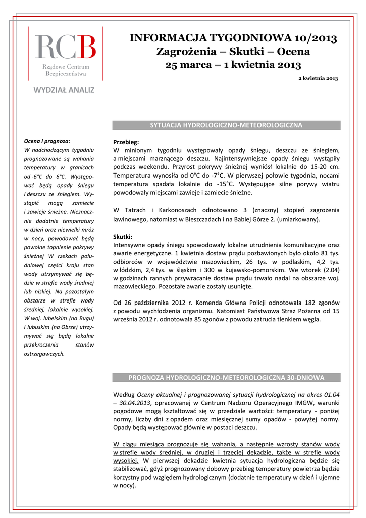INFORMACJA TYGODNIOWA 10/2013 Zagrożenia – Skutki – Ocena 25 marca – 1 kwietnia 2013 2 kwietnia 2013 WYDZIAŁ ANALIZ SYTUACJA HYDROLOGICZNO-METEOROLOGICZNA Ocena i prognoza: W nadchodzącym tygodniu prognozowane są wahania temperatury w granicach od -6°C do 6°C. Występowad będą opady śniegu i deszczu ze śniegiem. Wystąpid mogą zamiecie i zawieje śnieżne. Nieznacznie dodatnie temperatury w dzieo oraz niewielki mróz w nocy, powodowad będą powolne topnienie pokrywy śnieżnej W rzekach południowej części kraju stan wody utrzymywad się będzie w strefie wody średniej lub niskiej. Na pozostałym obszarze w strefie wody średniej, lokalnie wysokiej. W woj. lubelskim (na Bugu) i lubuskim (na Obrze) utrzymywad się będą lokalne przekroczenia stanów ostrzegawczych. Przebieg: W minionym tygodniu występowały opady śniegu, deszczu ze śniegiem, a miejscami marznącego deszczu. Najintensywniejsze opady śniegu wystąpiły podczas weekendu. Przyrost pokrywy śnieżnej wyniósł lokalnie do 15-20 cm. Temperatura wynosiła od 0°C do -7°C. W pierwszej połowie tygodnia, nocami temperatura spadała lokalnie do -15°C. Występujące silne porywy wiatru powodowały miejscami zawieje i zamiecie śnieżne. W Tatrach i Karkonoszach odnotowano 3 (znaczny) stopieo zagrożenia lawinowego, natomiast w Bieszczadach i na Babiej Górze 2. (umiarkowany). Skutki: Intensywne opady śniegu spowodowały lokalne utrudnienia komunikacyjne oraz awarie energetyczne. 1 kwietnia dostaw prądu pozbawionych było około 81 tys. odbiorców w województwie mazowieckim, 26 tys. w podlaskim, 4,2 tys. w łódzkim, 2,4 tys. w śląskim i 300 w kujawsko-pomorskim. We wtorek (2.04) w godzinach rannych przywracanie dostaw prądu trwało nadal na obszarze woj. mazowieckiego. Pozostałe awarie zostały usunięte. Od 26 października 2012 r. Komenda Główna Policji odnotowała 182 zgonów z powodu wychłodzenia organizmu. Natomiast Paostwowa Straż Pożarna od 15 września 2012 r. odnotowała 85 zgonów z powodu zatrucia tlenkiem węgla. PROGNOZA HYDROLOGICZNO-METEOROLOGICZNA 30-DNIOWA Według Oceny aktualnej i prognozowanej sytuacji hydrologicznej na okres 01.04 – 30.04.2013, opracowanej w Centrum Nadzoru Operacyjnego IMGW, warunki pogodowe mogą kształtowad się w przedziale wartości: temperatury - poniżej normy, liczby dni z opadem oraz miesięcznej sumy opadów - powyżej normy. Opady będą występowad głównie w postaci deszczu. W ciągu miesiąca prognozuje się wahania, a następnie wzrosty stanów wody w strefie wody średniej, w drugiej i trzeciej dekadzie, także w strefie wody wysokiej. W pierwszej dekadzie kwietnia sytuacja hydrologiczna będzie się stabilizowad, gdyż prognozowany dobowy przebieg temperatury powietrza będzie korzystny pod względem hydrologicznym (dodatnie temperatury w dzieo i ujemne w nocy). INFORMACJA TYGODNIOWA 25.3 – 1.4. 2013 Warunki atmosferyczne, które wystąpią po 10 kwietnia, spowodują topnienie pokrywy śnieżnej i wzrosty stanów wody, lokalnie powyżej stanów ostrzegawczych i alarmowych. Początkowo niewielkie wzrosty obserwowane będą w dorzeczu górnej Odry, następnie większe w dorzeczu górnej Wisły. Możliwe jest wystąpienie lokalnych podtopieo. Pod koniec miesiąca wezbranie roztopowo-opadowe będzie przemieszczad się wzdłuż Wisły i Odry. W ujściowych odcinkach rzek Przymorza, a także w ujściowym odcinku Wisły i Odry oraz na Żuławach Wiślanych, Zalewie Wiślanym i Szczecioskim istnieje niewielka możliwośd większych wzrostów stanów wody w wyniku silnego wiatru z północy. STRAJK GENERALNY NA GÓRNYM ŚLĄSKU (26 MARCA) Ocena: W wiecach i marszach w miastach regionu Śląska oraz w pikietach poparcia dla strajkujących przed Urzędami Wojewódzkimi na terenie całego kraju zgromadziło się ok. 8 tys. osób. Skala strajku była znacznie mniejsza niż wynikało z zapowiedzi związkowców. Przebieg: 26 marca br. odbył się strajk generalny na Górnym Śląsku zorganizowany przez NSZZ Solidarnośd, OPZZ, Forum Związków Zawodowych i WZZ Sierpieo 80. W godzinach 3.15-4.15 opóźniono wyjazd 48 tramwajów i 42 autobusów miejskich. W godzinach 8.00-10.00 wstrzymano ruch 51 pociągów pasażerskich (z zagrożonych 132), w tym 8 pociągów Intercity (opóźnionych łącznie 500 minut), 4 pociągów Przewozów Regionalnych (opóźnionych łącznie 351 minut) i 39 pociągów Kolei Śląskich (opóźnionych łącznie 2351 minut). Koleje Śląskie uruchomiły komunikację zastępczą - 26 autobusów. W godzinach 7.00-10.00 częściowo wstrzymany został ruch 35 pociągów towarowych. Przywrócenie pełnego rozkładu jazdy trwało do godzin popołudniowych. Na dworcach informowano podróżnych o opóźnieniach w ruchu kolejowym oraz wydawano gorące napoje. Skutki: W czasie strajku nie doszło do zagrożenia bezpieczeostwa protestujących oraz osób postronnych. Protest nie spowodował istotnych utrudnieo komunikacyjnych. Ze względu na wczesną porę zakooczenia strajku w komunikacji miejskiej, dojazd do szkół i miejsc pracy nie był utrudniony. Dwugodzinny przestój pracy w zakładach górniczych, energetycznych, ciepłowniczych oraz koksowniczych nie spowodował przerw w dostawach prądu i ciepła. W placówkach oświatowych zapewniono dzieciom opiekę. Służba zdrowia funkcjonowała bez zakłóceo. Rządowe Centrum Bezpieczeostwa na bieżąco monitorowało sytuację. Przeprowadzono dwie wideokonferencje z przedstawicielami Śląskiego Urzędu Wojewódzkiego. NAJWIĘKSZY CYBERATAK W HISTORII INTERNETU Ocena: Cyberataki stają się coraz częstszym narzędziem walki nie tylko między firmami, ale również między krajami. Częśd ekspertów opisała ostatnie zdarzenie jako największy cyberatak w historii. Przebieg: W minionym tygodniu trwały ataki typu DDoS (Distributed Denial of Service) na serwery należące do organizacji Spamhaus, która prowadzi listę znanych dostawców Internetu oraz domen, które służą do generowani