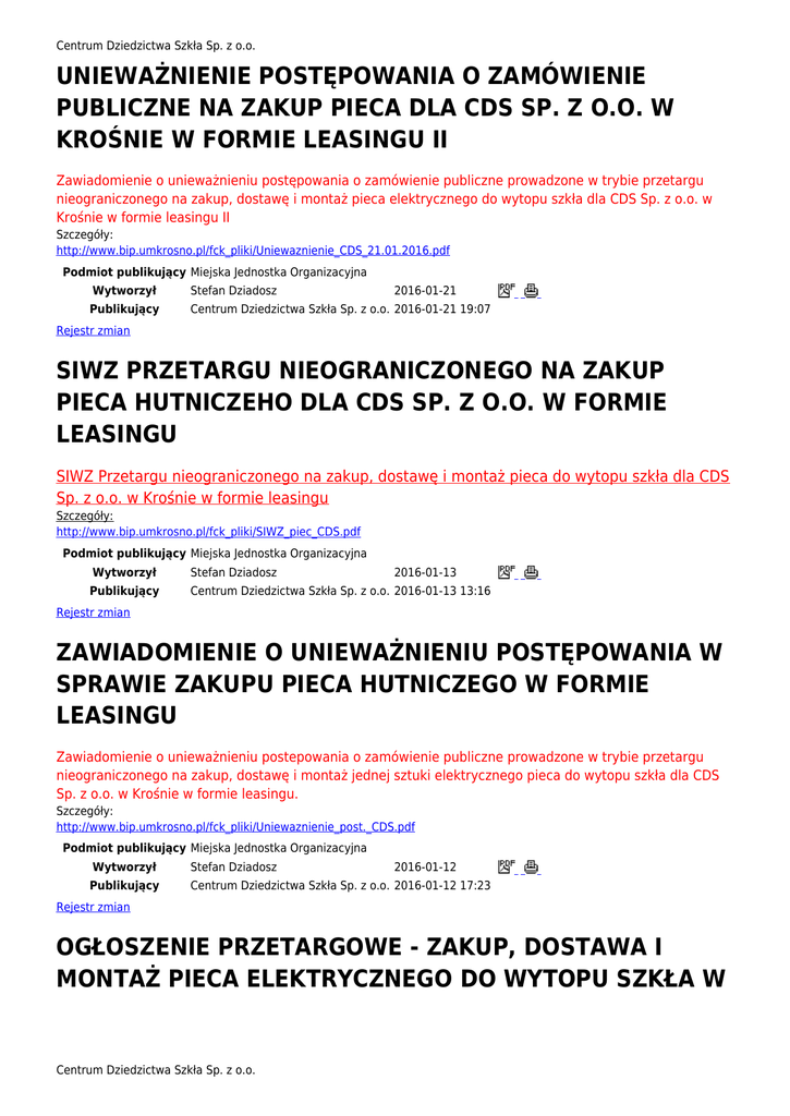 Centrum Dziedzictwa Szkła Sp. z o.o. UNIEWAŻNIENIE POSTĘPOWANIA O ZAMÓWIENIE PUBLICZNE NA ZAKUP PIECA DLA CDS SP. Z O.O. W KROŚNIE W FORMIE LEASINGU II Zawiadomienie o unieważnieniu postępowania o zamówienie publiczne prowadzone w trybie przetargu nieograniczonego na zakup, dostawę i montaż pieca elektrycznego do wytopu szkła dla CDS Sp. z o.o. w Krośnie w formie leasingu II Szczegóły: http://www.bip.umkrosno.pl/fck_pliki/Uniewaznienie_CDS_21.01.2016.pdf Podmiot publikujący Miejska Jednostka Organizacyjna Wytworzył Stefan Dziadosz 2016-01-21 Publikujący Centrum Dziedzictwa Szkła Sp. z o.o. 2016-01-21 19:07 Rejestr zmian SIWZ PRZETARGU NIEOGRANICZONEGO NA ZAKUP PIECA HUTNICZEHO DLA CDS SP. Z O.O. W FORMIE LEASINGU SIWZ Przetargu nieograniczonego na zakup, dostawę i montaż pieca do wytopu szkła dla CDS Sp. z o.o. w Krośnie w formie leasingu Szczegóły: http://www.bip.umkrosno.pl/fck_pliki/SIWZ_piec_CDS.pdf Podmiot publikujący Miejska Jednostka Organizacyjna Wytworzył Stefan Dziadosz 2016-01-13 Publikujący Centrum Dziedzictwa Szkła Sp. z o.o. 2016-01-13 13:16 Rejestr zmian ZAWIADOMIENIE O UNIEWAŻNIENIU POSTĘPOWANIA W SPRAWIE ZAKUPU PIECA HUTNICZEGO W FORMIE LEASINGU Zawiadomienie o unieważnieniu postepowania o zamówienie publiczne prowadzone w trybie przetargu nieograniczonego na zakup, dostawę i montaż jednej sztuki elektrycznego pieca do wytopu szkła dla CDS Sp. z o.o. w Krośnie w formie leasingu. Szczegóły: http://www.bip.umkrosno.pl/fck_pliki/Uniewaznienie_post._CDS.pdf Podmiot publikujący Miejska Jednostka Organizacyjna Wytworzył Stefan Dziadosz Publikujący Centrum Dziedzictwa Szkła Sp. z o.o. 2016-01-12 17:23 2016-01-12 Rejestr zmian OGŁOSZENIE PRZETARGOWE - ZAKUP, DOSTAWA I MONTAŻ PIECA ELEKTRYCZNEGO DO WYTOPU SZKŁA W Centrum Dziedzictwa Szkła Sp. z o.o. Centrum Dziedzictwa Szkła Sp. z o.o. FORMIE LEASINGU PRZETARG NIEOGRANICZONY ZAKUP, DOSTAWA I MONTAŻ PIECA ELEKTRYCZNEGO DO WYTOPU SZKŁA DLA CDS SP. Z O.O. W KROŚNIE W FORMIE LEASINGU Szczegóły: http://www.bip.umkrosno.pl/fck_pliki/Piec_3.pdf Podmiot publikujący Miejska Jednostka Organizacyjna Wytworzył Stefan Dziadosz Publikujący Centrum Dziedzictwa Szkła Sp. z o.o. 2015-12-16 13:11 2015-12-16 Rejestr zmian ZAPYTANIE OFERTOWE NA USŁUGĘ SERWISOWANIA SYSTEMU SYGNALIZACJI POŻAROWEJ ZAPYTANIE OFEROWE NA USŁUGĘ SERWISOWANIA SYSTEMU SYGNALIZACJI POŻAROWEJ Szczegóły: http://www.bip.umkrosno.pl/fck_pliki/(1)ZAPYTANIE_OFERTOWE_NA_USLUGE_SERWISOWANIA_SYSTEMU_SYGNALIZACJI_POZA ROWEJ1.pdf Podmiot publikujący Miejska Jednostka Organizacyjna Wytworzył Stefan Dziadosz Publikujący Centrum Dziedzictwa Szkła Sp. z o.o. 2015-11-20 12:32 2015-11-20 Rejestr zmian ZAWIADOMIENIE O UNIEWAŻNIENIU POSTĘPOWANIA ZAWIADOMIENIE O UNIEWAŻNIENIU POSTEPOWANIA W SPRAWIE ZAKUPU PIECA 27.10.2015 Szczegóły: http://www.bip.umkrosno.pl/fck_pliki/27.10.2015cds.pdf Podmiot publikujący Miejska Jednostka Organizacyjna Wytworzył Stefan Dziadosz Publikujący Centrum Dziedzictwa Szkła Sp. z o.o. 2015-11-10 13:28 2015-11-10 Modyfikacja Centrum Dziedzictwa Szkła Sp. z o.o. 2015-11-18 15:37 Rejestr zmian ZAWIADOMIENIE O UNIEWAŻNIENIU POSTĘPOWANIA ZAWIADOMIENIE O UNIEWAŻNIENIU POSTĘPOWANIA W SPRAWIE ZAKUPU PIECA 10.11.2015 Szczegóły: http://www.bip.umkrosno.pl/fck_pliki/10.11.2015cds.pdf Podmiot publikujący Miejska Jednostka Organizacyjna Wytworzył Stefan Dziadosz Publikujący Centrum Dziedzictwa Szkła Sp. z o.o. 2015-11-10 13:25 2015-11-10 Modyfikacja Centrum Dziedzictwa Szkła Sp. z o.o. 2015-11-18 15:35 Rejestr zmian II OGŁOSZENIE O ZAMÓWIENIU - DOSTAWY Przedmiotem zamówienia jest zakup, dostawa i montaż jednej sztuki elektrycznego pieca do wytopu szkła dla Centrum Dziedzictwa Szkła Sp. z o.o. w Krośnie Centrum Dziedzictwa Szkła Sp. z o.o. Centrum Dziedzictwa Szkła Sp. z o.o. Szczegóły: http://www.bip.umkrosno.pl/fck_pliki/PIEC_2.pdf http://www.bip.umkrosno.pl/fck_pliki/ogloszenie_piec_2.pdf Podmiot publikujący Miejska Jednostka Organizacyjna Wytworzył Stefan Dziadosz Publikujący Centrum Dziedzictwa Szkła Sp. z o.o. 2015-10-29 14:04 2015-10-29 Rejestr zmian OGŁOSZENIE O ZAMÓWIENIU - DOSTAWY Przedmiotem zamówienia jest zakup, dostawa i montaż jednej sztuki elektrycznego pieca do wytopu szkła dla Centrum Dziedzictwa Szkła Sp. z o.o. w Krosnie. MODYFIKACJA: http://www.bip.umkrosno.pl/fck_pliki/CDS_modyfikacja.pdf http://bip.umkrosno.pl/fck_pliki/Przetarg_19.10.2015_CDS.pdf Podmiot publikujący Miejska Jednostka Organizacyjna Wytworzył Stefan Dziadosz 2015-10-19 Publikujący Centrum Dziedzictwa Szkła Sp. z o.o. 2015-10-19 15:31 Modyfikacja Centrum Dziedzictwa Szkła Sp. z o.o. 2015-10-22 16:55 Rejestr zmian OGŁOSZENIE Centrum Dziedzictwa Szkła Sp. zo.o. w Krośnie informuje,że ulega przedłużeniu do 31 sierpnia 2015 r. termin składania ofert na usługę serwisowania systemu klimatyzacji i wentylacji. Podmiot publikujący Miejska Jednostka Organizacyjna Wytworzył Stefan Dziadosz 2015-08-13 Publikujący Centrum Dziedzictwa Szkła Sp. z o.o. 2015-08-13 10:47 Rejestr zmian OGŁOSZENIE !!! Zaproszenie do złożenia oferty cenowej na serwis urządzeń dźwigowych: http://www.bip.umkrosno.pl/fck_pliki/zapytanie_ofertowe_winda_schody.pdf Zapytanie ofertowe na usługę serwisowania systemu klimatyzacji i wentylacji: http://www.bip.umkrosno.pl/fck_pliki/zapytanie_serwis_klimatyzacja.pdf Centrum Dziedzictwa Szkła Sp. z o.o. Centrum Dziedzictwa Szkła Sp. z o.o. Podmiot publikujący Miejska Jednostka Organizacyjna Wytworzył Stefan Dziadosz Publikujący Centrum Dziedzictwa Szkła Sp. z o.o. 2015-07-17 13:13 2015-07-17 Rejestr zmian RZiS, BILANS za 2014 rok RACHUNEK ZYSKÓW I STRAT za 2014 rok ; Centrum Dziedzictwa Szkła Sp. z o.o. w Krośnie http://www.bip.umkrosno.pl/fck_pliki/RZiS_2014_cds.pdf BILANS za 2014 rok ; Centrum Dziedzictwa Szkła Sp. z o.o. w Krośnie http://www.bip.umkrosno.pl/fck_pliki/Bilans_2014_cds.pdf Podmiot publikujący Miejska Jednostka Organizacyjna Wytworzy