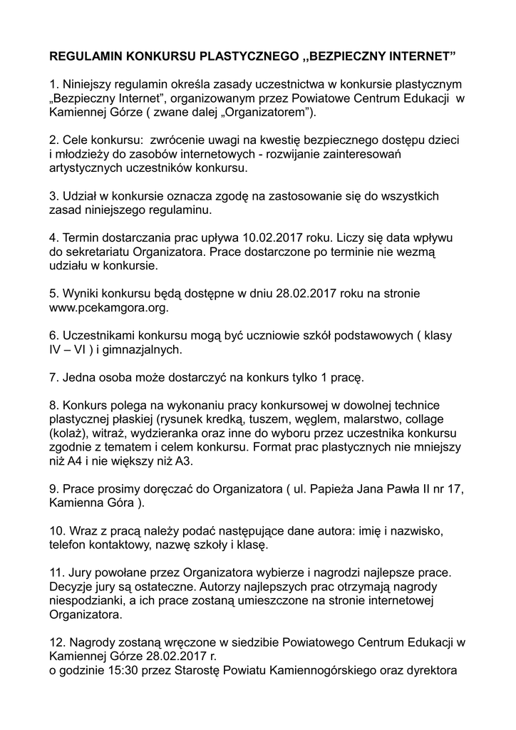 REGULAMIN KONKURSU PLASTYCZNEGO ,,BEZPIECZNY INTERNET” 1. Niniejszy regulamin określa zasady uczestnictwa w konkursie plastycznym „Bezpieczny Internet”, organizowanym przez Powiatowe Centrum Edukacji w Kamiennej Górze ( zwane dalej „Organizatorem”). 2. Cele konkursu: zwrócenie uwagi na kwestię bezpiecznego dostępu dzieci i młodzieży do zasobów internetowych - rozwijanie zainteresowań artystycznych uczestników konkursu. 3. Udział w konkursie oznacza zgodę na zastosowanie się do wszystkich zasad niniejszego regulaminu. 4. Termin dostarczania prac upływa 10.02.2017 roku. Liczy się data wpływu do sekretariatu Organizatora. Prace dostarczone po terminie nie wezmą udziału w konkursie. 5. Wyniki konkursu będą dostępne w dniu 28.02.2017 roku na stronie www.pcekamgora.org. 6. Uczestnikami konkursu mogą być uczniowie szkół podstawowych ( klasy IV – VI ) i gimnazjalnych. 7. Jedna osoba może dostarczyć na konkurs tylko 1 pracę. 8. Konkurs polega na wykonaniu pracy konkursowej w dowolnej technice plastycznej płaskiej (rysunek kredką, tuszem, węglem, malarstwo, collage (kolaż), witraż, wydzieranka oraz inne do wyboru przez uczestnika konkursu zgodnie z tematem i celem konkursu. Format prac plastycznych nie mniejszy niż A4 i nie większy niż A3. 9. Prace prosimy doręczać do Organizatora ( ul. Papieża Jana Pawła II nr 17, Kamienna Góra ). 10. Wraz z pracą należy podać następujące dane autora: imię i nazwisko, telefon kontaktowy, nazwę szkoły i klasę. 11. Jury powołane przez Organizatora wybierze i nagrodzi najlepsze prace. Decyzje jury są ostateczne. Autorzy najlepszych prac otrzymają nagrody niespodzianki, a ich prace zostaną umieszczone na stronie internetowej Organizatora. 12. Nagrody zostaną wręczone w siedzibie Powiatowego Centrum Edukacji w Kamiennej Górze 28.02.2017 r. o godzinie 15:30 przez Starostę Powiatu Kamiennogórskiego oraz dyrektora PCE. 13. Nagrody nie podlegają zamianie na inne lub na ich równowartość pieniężną. 14. Zgłoszenie pracy do konkursu jest równoważne z wyrażeniem zgody na gromadzenie i przetwarzanie przez Organizatora na potrzeby konkursu danych osobowych, zgodnie z ustawą z dnia 29.08.1997 „O ochronie danych osobowych” ( Dz. U. nr 133, poz. 883). 15. Udział w konkursie jest jednoznaczny z udzieleniem prawa przez przedstawiciela ustawowego dziecka ( np. rodzic, opiekun ) do nieodpłatnego wykorzystywania prac w następujących polach eksploatacji: druku w dowolnej liczbie publikacji i w dowolnym nakładzie, używania ich w Internecie oraz w innych formach utrwaleń, nadających się do rozpowszechniania w ramach działań Organizatora na terenie powiatu i po za nim, bez ograniczeń czasowych i terytorialnych. 16. Przesłane prace nie będą zwracane. Z chwilą nadesłania prace przechodzą na własność Organizatora, który przejmuje autorskie prawa majątkowe do nadesłanych prac. 17. Organizator zastrzega sobie prawo zmian niniejszego regulaminu w każdym czasie bez podania przyczyny przy zastosowaniu odpowiednich form informacji i zawiadomień uczestników konkursu. 18. Zmiany w regulaminie nie mogą naruszyć praw nabytych przez uczestników konkursu. 19. Organizator nie ponosi odpowiedzialności za podanie przez uczestnika niewłaściwych lub nieprawdziwych danych dotyczących adresu lub innych danych uniemożliwiających lub opóźniających wręczenie przez Organizatora nagród w związku z prowadzeniem konkursu. 20. Niniejszy regulamin jest jedynym dokumentem mającym wiążącą moc prawną w zakresie realizacji konkursu.