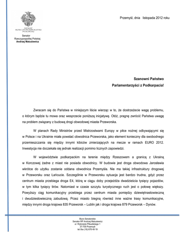 Przemyśl, dnia listopada 2012 roku Senator Rzeczypospolitej Polskiej Andrzej Matusiewicz Szanowni Państwo Parlamentarzyści z Podkarpacia! Zwracam się do Państwa w niniejszym liście wierząc w to, że dostrzeżecie wagę problemu, o którym będzie tu mowa oraz wesprzecie poniższą inicjatywę. Otóż, pragnę zwrócić Państwa uwagę na problem związany z budową drogi obwodowej miasta Przeworska. W planach Rady Ministrów przed Mistrzostwami Europy w piłce nożnej odbywającymi się w Polsce i na Ukrainie miała powstać obwodnica Przeworska, jako element konieczny dla swobodnego przemieszczania się między innymi kibiców zmierzających na mecze w ramach EURO 2012. Inwestycja nie doczekała się jednak realizacji pomimo licznych zapowiedzi. W województwie podkarpackim na terenie między Rzeszowem a granicą z Ukrainą w Korczowej żadne z miast nie posiada obwodnicy. W budowie jest droga obwodowa Jarosławia wkrótce do użytku zostanie oddana obwodnica Przemyśla. Nie ma takiej infrastruktury drogowej w Przeworsku oraz Łańcucie. Szczególnie w Przeworsku sytuacja jest bardzo trudna, gdyż przez centrum miasta przebiega droga E4, którą w ciągu doby przejeżdża dwadzieścia tysięcy pojazdów, w tym kilka tysięcy tirów. Natomiast w czasie szczytu turystycznego ruch jest o połowę większy. Powyższy ciąg komunikacyjny przebiega przez centrum miasta pomiędzy dziewiętnastowieczną i dwudziestowieczną zabudową. Przez miasto biegną również inne ważne trasy komunikacyjne, między innymi droga krajowa 835 Przeworsk – Lublin jak i droga krajowa 879 Przeworsk – Dynów. Biuro Senatorskie Senator RP Andrzej Matusiewicz ul. Wybrzeże Piłsudskiego 1 37-700 Przemyśl tel./fax (16) 678 49 19 Natężenie ruchu kołowego na trasach tranzytowych prowadzących przez Przeworsk systematycznie wzrasta, co jest niezmiernie uciążliwe i powoduje rosnące niezadowolenie zarówno mieszkańców, jak również uczestników ruchu drogowego. Przejazd przez Przeworsk w godzinach szczytu zarówno porannego, jak i popołudniowego na trasie liczącej niecałe 5 km zajmuje niemal 40 – 50 minut. To stanowczo za długo. Miasto jest niemal ciągle zakorkowane, szczególnie przez pojazdy tranzytowe. W związku z pierwotnymi planami rządu, odnośnie zaplanowanej budowy obwodnicy, przed EURO 2012 Gmina Miejska Przeworsk przygotowała dokumentację techniczną, która kosztowała jednostkę samorządową 1 milion złotych. Ważna jest decyzja środowiskowa (termin ważności do grudnia 2013 roku). Jest to niewątpliwie ogromna kwota, która została wyasygnowana przez władze miasta. Koszt całej inwestycji wynosi 84 mln złotych. W związku z decyzją o przesunięciu w czasie realizacji inwestycji budowy drogi obwodowej Przeworska w dniu 15 marca bieżącego roku zgłosiłem interwencję w niniejszej sprawie, w oparciu o art. 20 ust. 1 ustawy z dnia 9 maja 1996 roku o wykonywaniu mandatu posła i senatora, skierowaną do Ministra Transportu, Budownictwa i Gospodarki Morskiej. W odpowiedzi otrzymanej z Ministerstwa uzasadniono, że realizacja inwestycji uzależniona jest między innymi od środków finansowych dostępnych dla Polski w ramach Wieloletnich Ram Finansowych Unii Europejskiej w latach 2014-2020. Brak środków finansowych w budżecie państwa na rok 2013 przeznaczonych na obwodnicę Przeworska spowoduje utratę ważności wymienionej decyzji środowiskowej i potrzebę późniejszej, kosztownej aktualizacji. Problem budowy obwodnicy Przeworska dostrzegają również przedstawiciele lokalnych mediów, które w licznych reportażach i relacjach dziennikarskich opisują niniejszą sprawę. Mam tutaj na myśli: TVP Rzeszów, „Gazetę Jarosławską” oraz „Życie Podkarpackie”. W związku z nie włączeniem budowy obwodnicy Przeworska do rządowego projektu budżetu na rok 2013 odbył się w Przeworsku, między innymi z mojej inicjatywy, ostrzegawczy protest, który polegał na godzinnym blokowaniu drogi ekspresowej E4. W manifestacji wzięli udział oprócz licznie zgromadzonych mieszkańców, również przedstawiciele powiatu jak i władz miasta. Zwracam się tym samym do Państwa, jako Parlamentarzystów z Podkarpacia o przeanalizowanie istniejącej sytuacji. Proszę o podjęcie działań mających na celu wprowadzenie zmian w budżecie na rok 2013. Powyższa kwota konieczna dla realizacji przedsięwzięcia wynosi 40 mln złotych. Niniejsza inwestycja jest potrzebna zarówno mieszkańcom miasta, jak i wszystkim uczestnikom ruchu drogowego. Konieczne jest zdecydowane przyśpieszenie rozpoczęcia realizacji wyżej wymienionej inwestycji, która jest bardzo ważna dla miasta Przeworska, powiatu przeworskiego jak i całego Podkarpacia. Liczę na Państwa aktywność. Pracujmy wspólnie dla dobra Podkarpacia, jest to przecież nasza wspólna sprawa. Andrzej Matusiewicz Senator RP Załączniki: 1. Wystąpienie do Ministerstwa Transportu Budownictwa i Gospodarki Morskiej w sprawie budowy drogi obwodowej miasta Przeworska, 2. Odpowiedź MTBiGM w sprawie interwencji dotyczącej obwodnicy Przeworska, 3. Program Budowy Dróg Krajowych na lata 2011-2015 zatwierdzony przez Radę Ministrów (część dotycząca drogi obwodowej miasta Przeworska). Otrzymują: 1. Parlamentarzyści z Podkarpacia, 2. Pan Tadeusz Kiełbowicz – Przewodniczący Rady Powiatu Przeworskiego, 3. Pan Zbigniew Kiszka - Starosta Powiatu Przeworskiego, 4. Pan Andrzej Rozpotyński – Przewodniczący Rady Miasta Przeworska, 5. Pani Maria Dubrawska - Lichtarska – Burmistrz Miasta Przeworska, 6. Media lokalne: TVP Rzeszów, „Życie Podkarpackie” „Gazeta Jarosławska”, 7. a/a.