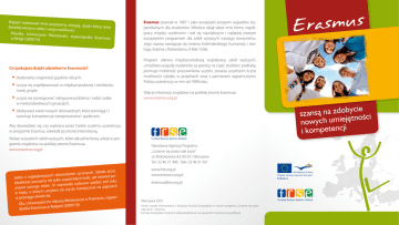 Wyjazd naładował mnie pozytywną energią, dzięk i której teraz bardziej wierzę w siebie i swoje możliwości. Klaudia, Uniwersytet Wa rszawski, stypendystka Erasmusa w Belgii (2009/10) Co zyskujesz dzięki udziałowi w Erasmusie? doskonalisz znajomość języków obcych, uczysz się współpracować w międzynarodowej i wielokulturowej grupie, uczysz się rozwiązywać nietypowe problemy i radzić sobie w niestandardowych sytuacjach, Erasmus powstał w 1987 r. jako europejski program wyjazdów stypendialnych dla studentów. Wkrótce objął także inne formy współpracy między uczelniami i stał się największym i najlepiej znanym europejskim programem dla szkół wyższych naszego kontynentu. Jego nazwa nawiązuje do imienia holenderskiego humanisty i teologa, Erazma z Rotterdamu (1466-1536). Program ułatwia międzynarodową współpracę szkół wyższych, umożliwia wyjazdy studentów za granicę na część studiów i praktykę, promuje mobilność pracowników uczelni, stwarza uczelniom liczne możliwości udziału w projektach wraz z partnerami zagranicznymi. Polska uczestniczy w nim od 1998 roku. Więcej informacji znajdziesz na polskiej stronie Erasmusa: www.erasmus.org.pl. bycie szansą na zdo ności t ję ie m u h c y now i kompetencji zdobywasz wiele nowych doświadczeń, które pomogą Ci rozwinąć kompetencje interpersonalne i społeczne. Aby dowiedzieć się, czy wybrana przez Ciebie uczelnia uczestniczy w programie Erasmus, odwiedź jej stronę internetową. Wykaz wszystkich szkół wyższych, które aktualnie biorą udział w programie znajdziesz na polskiej stronie Erasmusa: www.erasmus.org.pl. Szkoła życia. dczeń życiowych. ia św do h yc jsz ie eż poJedno z najpiękn ch ludzi, ale równi ły ia an sp w o lk ty e ia ni zić pół roku Możliwość poznan dę cudowne spęd aw pr na To e. bi sie ciach znania samego oretycznie na zaję te to ys cz się m ła uczy w kraju, o którym lat. h , stypenw przeciągu dwóc ewicza w Poznaniu ki ic M a am Ad . im Ola, Uniwersytet Bułgarii (2009/10) dystka Erasmusa w Narodowa Agencja Programu „Uczenie się przez całe życie” ul. Mokotowska 43, 00-551 Warszawa Tel.: 22 46 31 360; faks: 22 46 31 021 www.frse.org.pl www.erasmus.org.pl [email protected] Warszawa 2010 Ulotka została sfinansowana z funduszy Komisji Europejskiej w ramach programu „Uczenie się przez całe życie” – Erasmus. Komisja Europejska nie ponosi odpowiedzialności za zawartość merytoryczną publikacji. Twoje kompetencje w Europie Wybór kierunku studiów i uczelni, na której będziesz studiować, to jedne z ważniejszych życiowych decyzji. Jednak to, czego nauczysz się w trakcie studiów, nie będzie ograniczało się do jednej dyscypliny naukowej. W zglobalizowanym świecie i w warunkach błyskawicznie zmieniających się technologii, proces uczenia się nigdy właściwie się nie kończy. Przez całe życie zdobywamy wiedzę, doskonalimy umiejętności, co pozwala nam m.in. na stałe utrzymywanie zatrudnienia. Równie ważne jest rozwijanie własnych zainteresowań, pasji i ambicji oraz umiejętność aktywnego udziału w życiu społeczności lokalnej, swojego kraju czy wspólnoty międzynarodowej. Państwa członkowskie UE uznały, że w zjednoczonej Europie każdy obywatel powinien posiadać następujące kompetencje kluczowe: 1. umiejętność porozumiewania się w języku ojczystym, 2. umiejętność porozumiewania się w językach obcych, 3. kompetencje matematyczne i podstawowe kompetencje Erasmus szansą na zdobycie nowych umiejętności i kompetencji Dlaczego warto wybrać uczelnię, która uczestniczy w Erasmusie? Jednym z programów umożliwiających studentom udział w wymianie międzynarodowej jest Erasmus. Polska uczestniczy w nim od 1998 r. Przez 12 lat z szansy wyjazdu za granicę skorzystało już ponad 90 tysięcy polskich studentów. Ponad 200 szkół wyższych w Polsce wysyła studentów na stypendia Erasmusa do zagranicznych ośrodków akademickich, przedsiębiorstw i instytucji. Obecnie w programie aktywnych jest ponad 3000 uczelni ze wszystkich uczestniczących krajów. Dzięki Erasmusowi uczelnia poszerza swoją sieć zagranicznych kontaktów i stwarza swoim studentom większe szanse na wszechstronny rozwój. zełamać świat, pozwala pr na zy oc ra ie w ot y wi człowiek Wyjazd erasmusow nty. Dzięki wyjazdo zo ry ho za er sz Po . i sobie bariery i strach wierzyć, że poradz a yn cz za y, sz ej ni y, sil ent powinien czuje się pewniejsz którego każdy stud z , m ra og pr to st lepiej w życiu. Je aniu, skorzystać. kiewicza w Pozn ic M a am Ad . im tet Bartosz, Uniwersy (2009/10) usa w Niemczech m as Er a st dy en yp st wziąć udział w wymianie studentów, czyli zrealizować część swojego kształcenia w zagranicznej szkole wyższej, studiować razem z zagranicznymi studentami przyjeżdżającymi w ramach programu Erasmus do Twojej uczelni, wyjechać na zagraniczną praktykę związaną z kierunkiem studiów, uczestniczyć w zajęciach prowadzonych przez wykładowców z innych krajów, którzy przyjechali na wymianę do Twojej uczelni, wziąć udział w kursie intensywnym Erasmusa, czyli w zajęciach przygotowanych przez specjalistów z różnych krajów dla międzynarodowej grupy studentów, pracować w organizacjach studenckich działających na rzecz integracji studentów zagranicznych ze środowiskiem lokalnym. naukowo-techniczne, 4. kompetencje informatyczne, 5. umiejętność uczenia się, 6. kompetencje społeczne i obywatelskie, 7. inicjatywność i przedsiębiorczość, 8. świadomość i ekspresja kulturalna. Wiele z tych kompetencji można nabyć, biorąc udział w międzynarodowej wymianie studentów organizowanej przez uczelnie. Dlatego wybierając szkołę wyższą, sprawdź, czy oferuje ona możliwość wyjazdu za granicę w celu odbycia części studiów lub praktyki. Studiując w takiej uczelni, możesz: Kraje uczestniczące w Erasmusie w roku 2011/12 Wyjazd na stypendi um to same k