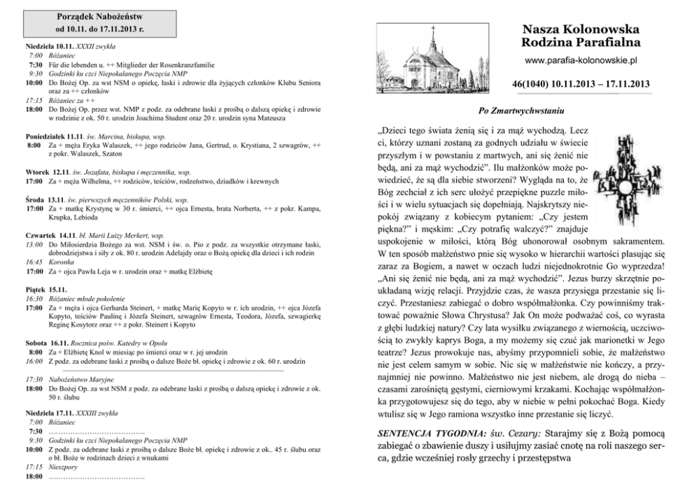 Porządek Nabożeństw od 10.11. do 17.11.2013 r. Niedziela 10.11. XXXII zwykła 7:00 Różaniec 7:30 Für die lebenden u. ++ Mitglieder der Rosenkranzfamilie 9:30 Godzinki ku czci Niepokalanego Poczęcia NMP 10:00 Do Bożej Op. za wst NSM o opiekę, łaski i zdrowie dla żyjących członków Klubu Seniora oraz za ++ członków 17:15 Różaniec za ++ 18:00 Do Bożej Op. przez wst. NMP z podz. za odebrane łaski z prośbą o dalszą opiekę i zdrowie w rodzinie z ok. 50 r. urodzin Joachima Student oraz 20 r. urodzin syna Mateusza Poniedziałek 11.11. św. Marcina, biskupa, wsp. 8:00 Za + męża Eryka Walaszek, ++ jego rodziców Jana, Gertrud, o. Krystiana, 2 szwagrów, ++ z pokr. Walaszek, Szaton Wtorek 12.11. św. Jozafata, biskupa i męczennika, wsp. 17:00 Za + męża Wilhelma, ++ rodziców, teściów, rodzeństwo, dziadków i krewnych Środa 13.11. św. pierwszych męczenników Polski, wsp. 17:00 Za + matkę Krystynę w 30 r. śmierci, ++ ojca Ernesta, brata Norberta, ++ z pokr. Kampa, Krupka, Lebioda Czwartek 14.11. bł. Marii Luizy Merkert, wsp. 13:00 Do Miłosierdzia Bożego za wst. NSM i św. o. Pio z podz. za wszystkie otrzymane łaski, dobrodziejstwa i siły z ok. 80 r. urodzin Adelajdy oraz o Bożą opiekę dla dzieci i ich rodzin 16:45 Koronka 17:00 Za + ojca Pawła Leja w r. urodzin oraz + matkę Elżbietę Piątek 15.11. 16:30 Różaniec młode pokolenie 17:00 Za + męża i ojca Gerharda Steinert, + matkę Marię Kopyto w r. ich urodzin, ++ ojca Józefa Kopyto, teściów Paulinę i Józefa Steinert, szwagrów Ernesta, Teodora, Józefa, szwagierkę Reginę Kosytorz oraz ++ z pokr. Steinert i Kopyto Sobota 16.11. Rocznica pośw. Katedry w Opolu 8:00 Za + Elżbietę Knol w miesiąc po śmierci oraz w r. jej urodzin 16:00 Z podz. za odebrane łaski z prośbą o dalsze Boże bł. opiekę i zdrowie z ok. 60 r. urodzin —–————–——————–—————–—————————–––—— 17:30 Nabożeństwo Maryjne 18:00 Do Bożej Op. za wst NSM z podz. za odebrane łaski z prośbą o dalszą opiekę i zdrowie z ok. 50 r. ślubu Niedziela 17.11. XXXIII zwykła 7:00 Różaniec 7:30 …………………………………. 9:30 Godzinki ku czci Niepokalanego Poczęcia NMP 10:00 Z podz. za odebrane łaski z prośbą o dalsze Boże bł. opiekę i zdrowie z ok.. 45 r. ślubu oraz o bł. Boże w rodzinach dzieci z wnukami 17:15 Nieszpory 18:00 …………………………………. Nasza Kolonowska Rodzina Parafialna www.parafia-kolonowskie.pl 46(1040) 10.11.2013 – 17.11.2013 Po Zmartwychwstaniu „Dzieci tego świata żenią się i za mąż wychodzą. Lecz ci, którzy uznani zostaną za godnych udziału w świecie przyszłym i w powstaniu z martwych, ani się żenić nie będą, ani za mąż wychodzić”. Ilu małżonków może powiedzieć, że są dla siebie stworzeni? Wygląda na to, że Bóg zechciał z ich serc ułożyć przepiękne puzzle miłości i w wielu sytuacjach się dopełniają. Najskrytszy niepokój związany z kobiecym pytaniem: „Czy jestem piękna?” i męskim: „Czy potrafię walczyć?” znajduje uspokojenie w miłości, którą Bóg uhonorował osobnym sakramentem. W ten sposób małżeństwo pnie się wysoko w hierarchii wartości plasując się zaraz za Bogiem, a nawet w oczach ludzi niejednokrotnie Go wyprzedza! „Ani się żenić nie będą, ani za mąż wychodzić”. Jezus burzy skrzętnie poukładaną wizję relacji. Przyjdzie czas, że wasza przysięga przestanie się liczyć. Przestaniesz zabiegać o dobro współmałżonka. Czy powinniśmy traktować poważnie Słowa Chrystusa? Jak On może podważać coś, co wyrasta z głębi ludzkiej natury? Czy lata wysiłku związanego z wiernością, uczciwością to zwykły kaprys Boga, a my możemy się czuć jak marionetki w Jego teatrze? Jezus prowokuje nas, abyśmy przypomnieli sobie, że małżeństwo nie jest celem samym w sobie. Nic się w małżeństwie nie kończy, a przynajmniej nie powinno. Małżeństwo nie jest niebem, ale drogą do nieba – czasami zarośniętą gęstymi, cierniowymi krzakami. Kochając współmałżonka przygotowujesz się do tego, aby w niebie w pełni pokochać Boga. Kiedy wtulisz się w Jego ramiona wszystko inne przestanie się liczyć. SENTENCJA TYGODNIA: św. Cezary: Starajmy się z Bożą pomocą zabiegać o zbawienie duszy i usiłujmy zasiać cnotę na roli naszego serca, gdzie wcześniej rosły grzechy i przestępstwa 46/2013 ZAPROSZENIE W dniach od 7 do 9 lutego, planujemy pobyt w ośrodku nad Turawą. Program: * Piątek 07.02. * Sobota 08.02. * Niedziela 09.02. 17:00 przyjazd 8:00 śniadanie 9:00 śniadanie 18:30 kolacja 9:00 Msza i konferencja 11:00 Msza i konferencja 20:00 Msza i konferencja, cały dzień na odpoczynek, spacery 13:00 obiad spotkanie, rozmowy 17:00 Nabożeństwo i konferencja wyjazd do domu 19:00 karnawałowa zabawa taneczna Takie spotkanie, to coś dla ciała i ducha. Ośrodek położony jest nad brzegiem Jeziora Turawskiego. Będzie czas na spacery, odpoczynek, Msze i spotkania religijne oraz zabawę karnawałową. Zaproszenie kierowane jest dla każdego, młodzieży, par, małżeństw i rodzin oraz osób samotnych. Młodych i starszych. Można jechać w gronie znajomych (z parafii lub spoza). Dojazd we własnym zakresie. Koszt 190 zł. od osoby. W tej cenie pełne wyżywienie, noclegi, zabawa. Ze względu na rezerwację całego ośrodka dla naszej grupy, prośba! aby decydować się i zgłaszać do 30 listopada (u ks. Piotra, w zakrystii lub telefonicznie 77 4611167). ——————————–——————————————–——— Uwaga Rodzice! Zależy Wam na lepszych relacjach z dziećmi? Chcecie mieć większe kompetencje w zakresie wychowania? Znajdźcie czas na to spotkanie! Publiczne Gimnazjum i PSP nr 1 w Kolonowskiem zaprasza na spotkanie, które otwiera cykl dyskusyjny pod nazwą „Rozmowy o wychowaniu” Spotkania będą prowadzone przez osoby zajmujące się na co dzień spraw