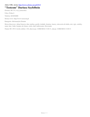 Adres URL strony http://www.efirmy.net.pl/2915 "Testcom" Dariusz Szyfelbein Otomin, 80-174, woj. pomorskie Ulica: Polna 6 Telefon: 663656888 Strona www: http://www.testcom.pl Kategorie: Informatyka Otomin Słowa kluczowe: sklep firmowy dmc mulina, guziki, dodatki, tkaniny, kanwy, akcesoria do haftu, nici, igly, ozdoby, sutaż, łaty i łatki, bergere de france, riolis, haft, haftowanie, filcowanie Numer ID: 2915, liczba odsłon: 128, aktywacja: 22/06/2010 13:48:31, edycja: 22/06/2010 13:48:31 Strona 1 / 1