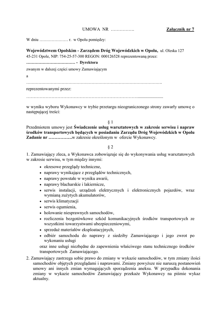 UMOWA NR ……………. Załącznik nr 7 W dniu ………………… r. w Opolu pomiędzy: Województwem Opolskim - Zarządem Dróg Wojewódzkich w Opolu, ul. Oleska 127 45-231 Opole, NIP: 754-25-57-300 REGON: 000126528 reprezentowaną przez: ……………………………… - Dyrektora zwanym w dalszej części umowy Zamawiającym a ………………………………………………………………………………………. reprezentowanymi przez: …………………………………………………………………....................... w wyniku wyboru Wykonawcy w trybie przetargu nieograniczonego strony zawarły umowę o następującej treści: §1 Przedmiotem umowy jest Świadczenie usług warsztatowych w zakresie serwisu i napraw środków transportowych będących w posiadaniu Zarządu Dróg Wojewódzkich w Opolu Zadanie nr …………….w zakresie określonym w ofercie Wykonawcy. §2 1. Zamawiający zleca, a Wykonawca zobowiązuje się do wykonywania usług warsztatowych w zakresie serwisu, w tym między innymi: okresowe przeglądy techniczne, naprawy wynikające z przeglądów technicznych, naprawy powstałe w wyniku awarii, naprawy blacharskie i lakiernicze, serwis instalacji, urządzeń elektrycznych i elektronicznych pojazdów, wraz wymianą zużytych akumulatorów, serwis klimatyzacji serwis ogumienia, holowanie niesprawnych samochodów, rozliczenia bezgotówkowe szkód komunikacyjnych środków transportowych ze wszystkimi towarzystwami ubezpieczeniowymi, sprzedaż materiałów eksploatacyjnych, odbiór samochodu do naprawy z siedziby Zamawiającego i jego zwrot po wykonaniu usługi oraz inne usługi niezbędne do zapewnienia właściwego stanu technicznego środków transportowych Zamawiającego. 2. Zamawiający zastrzega sobie prawo do zmiany w wykazie samochodów, w tym zmiany ilości samochodów objętych przeglądami i naprawami. Zmiany powyższe nie naruszą postanowień umowy ani innych zmian wymagających sporządzenia aneksu. W przypadku dokonania zmiany w wykazie samochodów Zamawiający przekaże Wykonawcy na piśmie wykaz aktualny. 3. Umowa została zawarta na czas określony od daty zawarcia– 31.12.2018 z zastrzeżeniem § 9. 4. Wykonawca oświadcza, że posiada wymagane uprawnienia do wykonania prac określonych w umowie, a także odpowiednią wiedzę, doświadczenie w tym zakresie i zobowiązuje się do wykonania przedmiotu umowy zgodnie ze sztuką i wiedzą techniczną. 5. Samochody będą naprawiane, poddawane przeglądom w warsztacie /stacji obsługi/ Wykonawcy mieszczącym się w ……………………………………………………………. 6. Wykonawca oświadcza, że w trakcie realizacji zamówienia, zatrudnia na podstawie umowy o pracę osoby wykonujące czynności wskazane w ust. 1 oraz w ofercie cenowej. Warunek ten dotyczy również Podwykonawcy. 7. W trakcie realizacji zamówienia Zamawiający uprawniony jest do wykonywania czynności kontrolnych wobec Wykonawcy odnośnie spełniania przez Wykonawcę lub Podwykonawcę wymogu zatrudnienia na podstawie umowy o pracę osób wykonujących wskazane w ust. 6 czynności. Zamawiający uprawniony jest w szczególności do: a) żądania oświadczeń i dokumentów w zakresie potwierdzenia spełniania ww. wymogów i dokonywania ich oceny, b) żądania wyjaśnień w przypadku wątpliwości w zakresie potwierdzenia spełniania ww. wymogów, c) przeprowadzania kontroli na miejscu wykonywania świadczenia. 8. W trakcie realizacji zamówienia na każde wezwanie Zamawiającego w wyznaczonym w tym wezwaniu terminie Wykonawca przedłoży Zamawiającemu wskazane poniżej dowody w celu potwierdzenia spełnienia wymogu zatrudnienia na podstawie umowy o pracę przez Wykonawcę lub Podwykonawcę osób wykonujących wskazane w ust. 6 czynności w trakcie realizacji zamówienia: oświadczenie wykonawcy lub podwykonawcy o zatrudnieniu na podstawie umowy o pracę osób wykonujących czynności, których dotyczy wezwanie Zamawiającego. Oświadczenie to powinno zawierać w szczególności: dokładne określenie podmiotu składającego oświadczenie, datę złożenia oświadczenia, wskazanie, że objęte wezwaniem czynności wykonują osoby zatrudnione na podstawie umowy o pracę wraz ze wskazaniem liczby tych osób, rodzaju umowy o pracę i wymiaru etatu oraz podpis osoby uprawnionej do złożenia oświadczenia w imieniu Wykonawcy lub Podwykonawcy; poświadczoną za zgodność z oryginałem odpowiednio przez Wykonawcę lub Podwykonawcę kopię umowy/umów o pracę osób wykonujących w trakcie realizacji zamówienia czynności, których dotyczy ww. oświadczenie wykonawcy lub podwykonawcy (wraz z dokumentem regulującym zakres obowiązków, jeżeli został sporządzony). Kopia umowy/umów powinna zostać zanonimizowana w sposób zapewniający ochronę danych osobowych pracowników, zgodnie z przepisami ustawy z dnia 29 sierpnia 1997 r. o ochronie danych osobowych (tj. w szczególności1 bez imion, nazwisk, adresów, nr PESEL pracowników). Informacje takie jak: data zawarcia umowy, rodzaj umowy o pracę i wymiar etatu powinny być możliwe do zidentyfikowania; Wyliczenie ma charakter przykładowy. Umowa o pracę może zawierać również inne dane, które podlegają anonimizacji. Każda umowa powinna zostać przeanalizowana przez składającego pod kątem przepisów ustawy z dnia 29 sierpnia 1997 r. o ochronie danych osobowych; zakres anonimizacji umowy musi być zgodny z przepisami ww. ustawy. 1 zaświadczenie właściwego oddziału ZUS, potwierdzające opłacanie przez wykonawcę lub podwykonawcę składek na ubezpieczenia społeczne i zdrowotne z tytułu zatrudnienia na podstawie umów o pracę za ostatni okres rozliczeniowy; poświadczoną za zgodność z oryginałem odpowiednio przez wykonawcę lub podwykonawcę kopię dowodu potwierdzającego zgłoszenie pracownika przez pracodawcę do ubezpieczeń, zanonimizowaną w sposób zapewniający ochronę danych osobowych pracowników, zgodnie z 