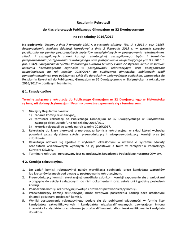 Regulamin Rekrutacji do klas pierwszych Publicznego Gimnazjum nr 32 Dwujęzycznego na rok szkolny 2016/2017 Na podstawie: Ustawy z dnia 7 września 1991 r. o systemie oświaty (Dz. U. z 2015 r. poz. 2156), Rozporządzenia Ministra Edukacji Narodowej z dnia 2 listopada 2015 r. w sprawie sposobu przeliczania na punkty poszczególnych kryteriów uwzględnianych w postępowaniu rekrutacyjnym, składu i szczegółowych zadao komisji rekrutacyjnej, szczegółowego trybu i terminów przeprowadzania postępowania rekrutacyjnego oraz postępowania uzupełniającego (Dz.U.z 2015 r. poz. 1942), Zarządzenia nr 5/2016 Podlaskiego Kuratora Oświaty z dnia 27 stycznia 2016 r. w sprawie ustalenia harmonogramu czynności w postępowaniu rekrutacyjnym oraz postępowaniu uzupełniającym na rok szkolny 2016/2017 do publicznych gimnazjów, publicznych szkół ponadgimnazjalnych oraz publicznych szkół dla dorosłych w województwie podlaskim, wprowadza się Regulamin Rekrutacji do Publicznego Gimnazjum nr 32 Dwujęzycznego w Białymstoku na rok szkolny 2016/2017 w poniższym brzmieniu: § 1. Zasady ogólne Terminy związane z rekrutacją do Publicznego Gimnazjum nr 32 Dwujęzycznego w Białymstoku są inne, niż do innych gimnazjum! Prosimy o uważne zapoznanie się z terminarzem. 1. 2. 3. 4. Niniejszy Regulamin określa: 1) zadania komisji rekrutacyjnej, 2) terminarz rekrutacji do Publicznego Gimnazjum nr 32 Dwujęzycznego w Białymstoku, zwanego dalej „szkołą”, na rok szkolny 2016/2017, 3) kryteria rekrutacji do szkoły na rok szkolny 2016/2017. Rekrutację do klasy pierwszej przeprowadza komisja rekrutacyjna, w skład której wchodzą powołani przez dyrektora szkoły: przewodniczący i wiceprzewodniczący komisji oraz jej członkowie. Rekrutacja odbywa się zgodnie z kryteriami określonymi w ustawie o systemie oświaty oraz aktach wykonawczych wydanych na jej podstawie a także w zarządzeniu Podlaskiego Kuratora Oświaty. Terminarz rekrutacji opracowany jest na podstawie Zarządzenia Podlaskiego Kuratora Oświaty. § 2. Komisja rekrutacyjna. 1. 2. 3. 4. 5. Do zadao komisji rekrutacyjnej należy weryfikacja spełniania przez kandydata warunków lub kryteriów branych pod uwagę w postępowaniu rekrutacyjnym. Przewodniczący komisji rekrutacyjnej umożliwia członkom komisji zapoznanie się z wnioskami o przyjęcie do szkoły i załączonymi do nich dokumentami oraz ustala dni i godziny posiedzeo komisji. Posiedzenia komisji rekrutacyjnej zwołuje i prowadzi przewodniczący komisji. Przewodniczący komisji rekrutacyjnej może zwoływad posiedzenia komisji poza ustalonymi dniami i godzinami posiedzeo komisji. Wyniki postępowania rekrutacyjnego podaje się do publicznej wiadomości w formie listy kandydatów zakwalifikowanych i kandydatów niezakwalifikowanych, zawierającej imiona i nazwiska kandydatów oraz informację o zakwalifikowaniu albo niezakwalifikowaniu kandydata do szkoły. 6. 7. 8. 9. 10. 11. 12. 13. 14. 15. 16. 17. Komisja rekrutacyjna przyjmuje kandydata do szkoły, jeżeli w wyniku postępowania rekrutacyjnego kandydat został zakwalifikowany oraz złożył wymagane dokumenty. Komisja rekrutacyjna podaje do publicznej wiadomości listę kandydatów przyjętych i kandydatów nieprzyjętych do szkoły. Lista zawiera imiona i nazwiska kandydatów przyjętych i kandydatów nieprzyjętych lub informację o liczbie wolnych miejsc. Listy, o których mowa w ust. 5 i 7, podaje się do publicznej wiadomości poprzez umieszczenie w widocznym miejscu w siedzibie szkoły. Listy zawierają imiona i nazwiska kandydatów uszeregowane w kolejności alfabetycznej oraz najniższą liczbę punktów, która uprawnia do przyjęcia. Dzieo podania do publicznej wiadomości listy, o której mowa w ust. 7, jest określany w formie adnotacji umieszczonej na tej liście, opatrzonej podpisem przewodniczącego komisji rekrutacyjnej. W terminie 7 dni od dnia podania do publicznej wiadomości listy kandydatów przyjętych i kandydatów nieprzyjętych, rodzic kandydata może wystąpid do komisji rekrutacyjnej z wnioskiem o sporządzenie uzasadnienia odmowy przyjęcia kandydata do szkoły. Uzasadnienie sporządza się w terminie 5 dni od dnia wystąpienia przez rodzica kandydata lub kandydata pełnoletniego z wnioskiem, o którym mowa w ust. 10. Uzasadnienie zawiera przyczyny odmowy przyjęcia, w tym najniższą liczbę punktów, która uprawniała do przyjęcia, oraz liczbę punktów, którą kandydat uzyskał w postępowaniu rekrutacyjnym. Rodzic kandydata może wnieśd do dyrektora szkoły odwołanie od rozstrzygnięcia komisji rekrutacyjnej, w terminie 7 dni od dnia otrzymania uzasadnienia. Dyrektor szkoły rozpatruje odwołanie od rozstrzygnięcia komisji rekrutacyjnej w terminie 7 dni od dnia otrzymania odwołania. Na rozstrzygnięcie dyrektora szkoły służy skarga do sądu administracyjnego. Jeżeli po przeprowadzeniu postępowania rekrutacyjnego szkoła nadal dysponuje wolnymi miejscami, dyrektor szkoły przeprowadza postępowanie uzupełniające. Postępowanie uzupełniające powinno zakooczyd się do kooca sierpnia roku szkolnego poprzedzającego rok szkolny, na który jest przeprowadzane postępowanie rekrutacyjne. Do postępowania uzupełniającego przepisy niniejszego paragrafu stosuje się odpowiednio. Dane osobowe kandydatów zgromadzone w celach postępowania rekrutacyjnego oraz dokumentacja postępowania rekrutacyjnego są przechowywane nie dłużej niż do kooca okresu, w którym uczeo uczęszcza do szkoły. Dane osobowe kandydatów nieprzyjętych zgromadzone w celach postępowania rekrutacyjnego są przechowywane w szkole przez okres roku, chyba że na rozstrzygnięcie dyrektora szkoły została wniesiona skarga do sądu administracyjnego i postępowanie nie zostało zakooczone prawomocnym wyrokiem. § 3. Terminarz rekrutacji. Terminy związane z rekrutacją do Publicznego Gimnazjum nr 32 Dwujęzycznego w Białymstoku są inne, niż do innych gimnazjów! Prosimy o uważne zapoznanie się z ter