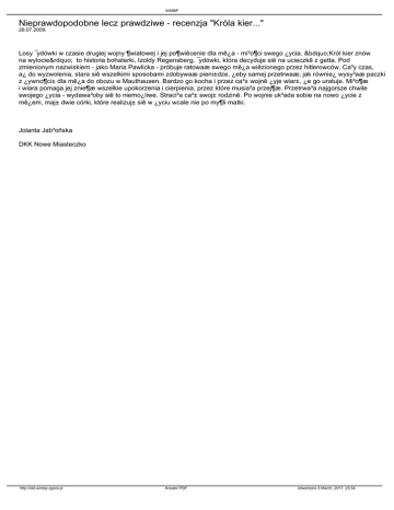 WiMBP Nieprawdopodobne lecz prawdziwe - recenzja "Króla kier..." 28.07.2009. Losy ¯ydówki w czasie drugiej wojny ¶wiatowej i jej po¶wiêcenie dla mê¿a - mi³o¶ci swego ¿ycia. „Król kier znów na wylocie” to historia bohaterki, Izoldy Regensberg, ¯ydówki, która decyduje siê na ucieczkê z getta. Pod zmienionym nazwiskiem - jako Maria Pawlicka - próbuje ratowaæ swego mê¿a wiêzionego przez hitlerowców. Ca³y czas, a¿ do wyzwolenia, stara siê wszelkimi sposobami zdobywaæ pieni±dze, ¿eby samej przetrwaæ; jak równie¿ wysy³aæ paczki z ¿ywno¶ci± dla mê¿a do obozu w Mauthausen. Bardzo go kocha i przez ca³± wojnê ¿yje wiar±, ¿e go uratuje. Mi³o¶æ i wiara pomaga jej znie¶æ wszelkie upokorzenia i cierpienia, przez które musia³a przej¶æ. Przetrwa³a najgorsze chwile swojego ¿ycia - wydawa³oby siê to niemo¿liwe. Straci³a ca³± swoj± rodzinê. Po wojnie uk³ada sobie na nowo ¿ycie z mê¿em, maj± dwie córki, które realizuj± siê w ¿yciu wcale nie po my¶li matki. Jolanta Jab³oñska DKK Nowe Miasteczko http://old.wimbp.zgora.pl Kreator PDF Utworzono 3 March, 2017, 23:34