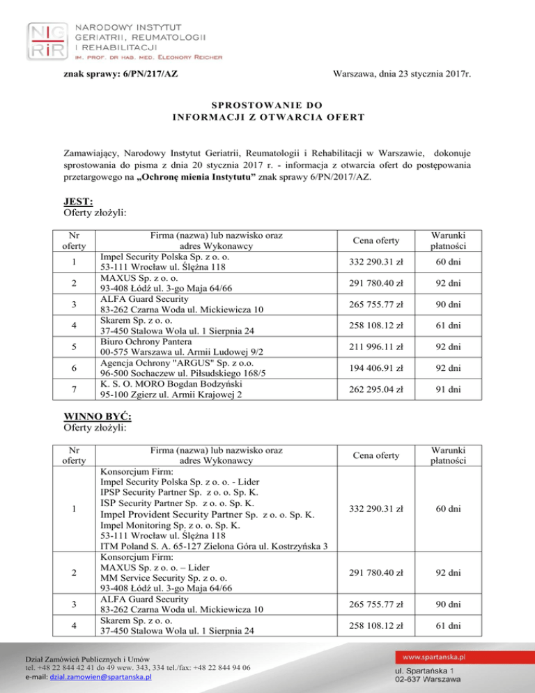 znak sprawy: 6/PN/217/AZ Warszawa, dnia 23 stycznia 2017r. SPROSTOWANIE DO INFORMACJI Z O TWARCIA OFERT Zamawiający, Narodowy Instytut Geriatrii, Reumatologii i Rehabilitacji w Warszawie, dokonuje sprostowania do pisma z dnia 20 stycznia 2017 r. - informacja z otwarcia ofert do postępowania przetargowego na „Ochronę mienia Instytutu” znak sprawy 6/PN/2017/AZ. JEST: Oferty złożyli: Nr oferty 1 2 3 4 5 6 7 Firma (nazwa) lub nazwisko oraz adres Wykonawcy Impel Security Polska Sp. z o. o. 53-111 Wrocław ul. Ślężna 118 MAXUS Sp. z o. o. 93-408 Łódź ul. 3-go Maja 64/66 ALFA Guard Security 83-262 Czarna Woda ul. Mickiewicza 10 Skarem Sp. z o. o. 37-450 Stalowa Wola ul. 1 Sierpnia 24 Biuro Ochrony Pantera 00-575 Warszawa ul. Armii Ludowej 9/2 Agencja Ochrony "ARGUS" Sp. z o.o. 96-500 Sochaczew ul. Piłsudskiego 168/5 K. S. O. MORO Bogdan Bodzyński 95-100 Zgierz ul. Armii Krajowej 2 Cena oferty Warunki płatności 332 290.31 zł 60 dni 291 780.40 zł 92 dni 265 755.77 zł 90 dni 258 108.12 zł 61 dni 211 996.11 zł 92 dni 194 406.91 zł 92 dni 262 295.04 zł 91 dni Cena oferty Warunki płatności 332 290.31 zł 60 dni 291 780.40 zł 92 dni 265 755.77 zł 90 dni 258 108.12 zł 61 dni WINNO BYĆ: Oferty złożyli: Nr oferty 1 2 3 4 Firma (nazwa) lub nazwisko oraz adres Wykonawcy Konsorcjum Firm: Impel Security Polska Sp. z o. o. - Lider IPSP Security Partner Sp. z o. o. Sp. K. ISP Security Partner Sp. z o. o. Sp. K. Impel Provident Security Partner Sp. z o. o. Sp. K. Impel Monitoring Sp. z o. o. Sp. K. 53-111 Wrocław ul. Ślężna 118 ITM Poland S. A. 65-127 Zielona Góra ul. Kostrzyńska 3 Konsorcjum Firm: MAXUS Sp. z o. o. – Lider MM Service Security Sp. z o. o. 93-408 Łódź ul. 3-go Maja 64/66 ALFA Guard Security 83-262 Czarna Woda ul. Mickiewicza 10 Skarem Sp. z o. o. 37-450 Stalowa Wola ul. 1 Sierpnia 24 Dział Zamówień Publicznych i Umów tel. +48 22 844 42 41 do 49 wew. 343, 334 tel./fax: +48 22 844 94 06 e-mail: [email protected] 5 6 7 Biuro Ochrony Pantera 00-575 Warszawa ul. Armii Ludowej 9/2 Agencja Ochrony "ARGUS" Sp. z o.o. 96-500 Sochaczew ul. Piłsudskiego 168/5 K. S. O. MORO Bogdan Bodzyński 95-100 Zgierz ul. Armii Krajowej 2 211 996.11 zł 92 dni 262 295.04 zł 92 dni 194 406.91 zł 91 dni Zatwierdził: Z-ca Dyrektora ds. Techniczno – Administracyjnych Cezary Rzemek Dział Zamówień Publicznych i Umów tel. +48 22 844 42 41 do 49 wew. 343, 334 tel./fax: +48 22 844 94 06 e-mail: [email protected]