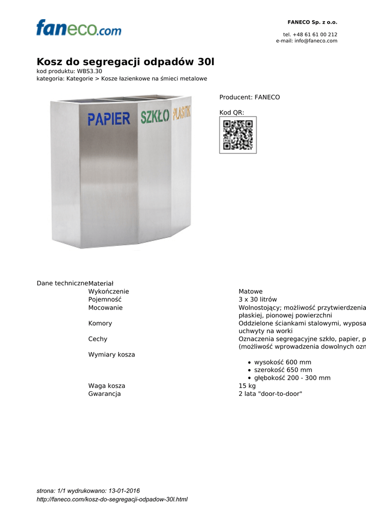 FANECO Sp. z o.o. tel. +48 61 61 00 212 e-mail: [email protected] Kosz do segregacji odpadów 30l kod produktu: WBS3.30 kategoria: Kategorie > Kosze łazienkowe na śmieci metalowe Producent: FANECO Kod QR: Dane techniczneMateriał Wykończenie Pojemność Mocowanie Komory Cechy Matowe 3 x 30 litrów Wolnostojący; możliwość przytwierdzenia płaskiej, pionowej powierzchni Oddzielone ściankami stalowymi, wyposa uchwyty na worki Oznaczenia segregacyjne szkło, papier, p (możliwość wprowadzenia dowolnych ozn Wymiary kosza Waga kosza Gwarancja strona: 1/1 wydrukowano: 13-01-2016 http://faneco.com/kosz-do-segregacji-odpadow-30l.html wysokość 600 mm szerokość 650 mm głębokość 200 - 300 mm 15 kg 2 lata "door-to-door"