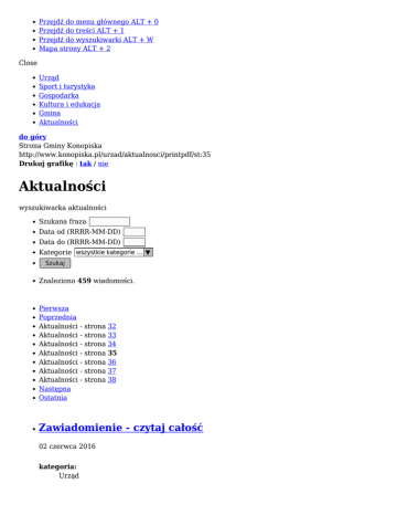 Przejdź do menu głównego ALT + 0 Przejdź do treści ALT + 1 Przejdź do wyszukiwarki ALT + W Mapa strony ALT + 2 Close Urząd Sport i turystyka Gospodarka Kultura i edukacja Gmina Aktualności do góry Strona Gminy Konopiska http://www.konopiska.pl/urzad/aktualnosci/printpdf/st:35 Drukuj grafikę : tak / nie Aktualności wyszukiwarka aktualności Szukana fraza Data od (RRRR-MM-DD) Data do (RRRR-MM-DD) Kategorie wszystkie kategorie ... ▼ Szukaj Znaleziono 459 wiadomości. Pierwsza Poprzednia Aktualności - strona 32 Aktualności - strona 33 Aktualności - strona 34 Aktualności - strona 35 Aktualności - strona 36 Aktualności - strona 37 Aktualności - strona 38 Następna Ostatnia Zawiadomienie - czytaj całość 02 czerwca 2016 kategoria: Urząd Na podstawie art. 20 ust. 1 ustawy o samorządzie gminnym z dnia 8 marca 1990 r. (Dz. U. z 2016 poz. 446) zawiadamiam, że dnia: 3 czerwca 2016 r. (piątek) o godz. 9.00 w sali konferencyjnej Urzędu Gminy w Konopiskach odbędzie się: XXII sesja Rady Gminy Konopiska Zawiadomienie Zawiadomienie - czytaj całość SUKCES UCZENNICY Z SP W JAMKACH-KORZONKU - czytaj całość 30 maja 2016 kategoria: Kultura i Edukacja W dniu 22 maja 2016 r. w Auli Ojca Kordeckiego na Jasnej Górze odbyła się gala Ogólnopolskiego Festiwalu Twórczości Maryjnej „Sancta Maria”. SUKCES UCZENNICY Z SP W JAMKACH-KORZONKU SUKCES UCZENNICY Z SP W JAMKACH-KORZONKU - czytaj całość Święta Rodziny w Publicznym Przedszkolu w Konopiskach czytaj całość 30 maja 2016 kategoria: Kultura i Edukacja W dniu 24 i 25 maja 2016r. w Publicznym Przedszkolu w Konopiskach odbyły się uroczystości Święta Rodziny. Wszystkie grupy zaprezentowały ciekawe programy artystyczne, na które złożyły się wiersze, piosenki, inscenizacje i układy taneczne. Święta Rodziny w Publicznym Przedszkolu w Konopi Święta Rodziny w Publicznym Przedszkolu w Konopiskach - czytaj całość XV Dni Gminy Konopiska 2016 - czytaj całość 30 maja 2016 kategoria: Kultura i Edukacja XV Dni Gminy Konopiska zorganizowane w dniach 21 i 22 maja miały w tym roku szczególny charakter. Było to święto wszystkich mieszkańców naszej społeczności połączone z Jubileuszem 70lecia Klubu GLKS „LOT” Konopiska. XV Dni Gminy Konopiska 2016 XV Dni Gminy Konopiska 2016 - czytaj całość Ogłoszenie - czytaj całość 29 maja 2016 kategoria: Urząd Urząd Gminy Konopiska zaprasza osoby zarejestrowane jako osoby bezrobotne w Powiatowym Urzędzie Pracy w Częstochowie do składania ofert na odbycie stażu w Urzędzie na stanowisko: technik administracji. Ogłoszenie Ogłoszenie - czytaj całość WYNIKI ZE SPRAWDZIANÓW SZKÓŁ PODSTAWOWYCH Z GMINY KONOPISKA W ROKU SZKOLNYM 2015/2016 czytaj całość 28 maja 2016 kategoria: Kultura i Edukacja WYNIKI ZE SPRAWDZIANÓW SZKÓŁ PODSTAWOWYCH Z GMINY KONOPISKA W ROKU SZKOLNYM 2015/2016 5 kwietnia 2016 r. uczniowie klas szóstych z terenu Gminy Konopiska przystąpili do sprawdzianu wiedzy składającego się z dwóch części – pierwszej obejmującej zadania z zakresu języka polskiego i matematyki oraz drugiej obejmującej zadania z zakresu języka obcego nowożytnego. WYNIKI ZE SPRAWDZIANÓW SZKÓŁ PODSTAWOWYCH Z GMI WYNIKI ZE SPRAWDZIANÓW SZKÓŁ PODSTAWOWYCH Z GMINY KONOPISKA W ROKU SZKOLNYM 2015/2016 - czytaj całość Konkurs "EKOLOGICZNA ZAGRODA 2016" - czytaj całość 28 maja 2016 kategoria: Gospodarka Starostwo Powiatowe w Częstochowie zachęca wszystkich mieszkańców do wzięcia udziału w kolejnej edycji konkursu ”Ekologiczna Zagroda 2016”. Konkurs "EKOLOGICZNA ZAGRODA 2016" Konkurs "EKOLOGICZNA ZAGRODA 2016" - czytaj całość Informacja o kursach autobusów MPK w dniach 26-27 maja czytaj całość 25 maja 2016 kategoria: Urząd Informacja o kursach autobusów MPK w dniach 26-27 maja Informacja o kursach autobusów MPK w dniach 26-27 Informacja o kursach autobusów MPK w dniach 26-27 maja - czytaj całość Ogólnopolska akcja „POLSKA BIEGA” 2016 - czytaj całość 24 maja 2016 kategoria: Sport i Turystyka Kilkanaście lat temu, dwaj dziennikarze „ Gazety Wyborczej” Piotr Pacewicz i Wojciech Staszewski, pasjonaci biegania, zastanawiali się nad tym jak poderwać Polaków do ogólnonarodowej aktywności. Wpadli na pomysł akcji o pierwotnej nazwie „Cała Polska biega”. Na czym polega ta akcja? Otóż na organizacji bezpłatnych biegów dla wszystkich chętnych. Ogólnopolska akcja „POLSKA BIEGA” 2016 Ogólnopolska akcja „POLSKA BIEGA” 2016 - czytaj całość Zawiadomienie - czytaj całość 23 maja 2016 kategoria: Urząd Zawiadomienie o posiedzeniach Komisji Rady Gminy Konopiska Zawiadomienie Zawiadomienie - czytaj całość Pierwsza Poprzednia Aktualności - strona 32 Aktualności - strona 33 Aktualności - strona 34 Aktualności - strona 35 Aktualności - strona 36 Aktualności - strona 37 Aktualności - strona 38 Następna Ostatnia