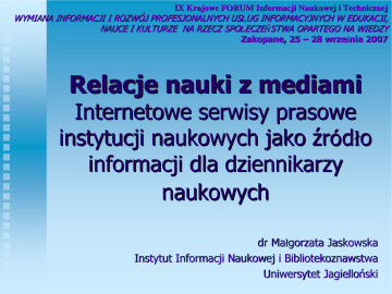 IX Krajowe FORUM Informacji Naukowej i Technicznej WYMIANA INFORMACJI I ROZWÓJ PROFESJONALNYCH USŁUG INFORMACYJNYCH W EDUKACJI, NAUCE I KULTURZE NA RZECZ SPOŁECZEŃSTWA OPARTEGO NA WIEDZY Zakopane, 25 – 28 września 2007 Relacje nauki z mediami Internetowe serwisy prasowe instytucji naukowych jako źródło informacji dla dziennikarzy naukowych dr Małgorzata Jaskowska Instytut Informacji Naukowej i Bibliotekoznawstwa Uniwersytet Jagielloński1 Czytelnictwo artykułów o nauce w prasie (2006 r.) 70% 60% 59% 48% 50% 40% 30% 20% 10% 0% Europa* Polska** * Eurobarometer 2 ** Ośrodek Przetwarzania Informacji Wnioski z projektu badawczego EU „MESSENGER”* Wykorzystanie doświadczeń amerykańskich: współpraca dziennikarzy naukowych i pracowników PR uczelni (PIO) ------------------------------------------------------------------------*MESSENGER Media, science & society; engagement & governance in Europe 2005-2006 r. 3 Wnioski z projektu badawczego EU „MESSENGER”* Wykorzystanie doświadczeń amerykańskich: współpraca dziennikarzy naukowych i pracowników PR uczelni (PIO) ------------------------------------------------------------------------*MESSENGER Media, science & society; engagement & governance in Europe 2005-2006 r. 4 Źródła informacji dla dziennikarzy naukowych Wiodące czasopisma naukowe Serwisy WWW EurekAlert!, Communique Initiative Naukawpolsce Serwisy WWW instytucji naukowych (w ich ramach elektroniczne serwisy prasowe) 5 Elektroniczny serwis prasowy instytucji naukowej I. wyodrębnione i łatwo dostępne miejsce w serwisie instytucji, którą reprezentuje, II. informacja I. II. III. IV. III. na temat przedstawiciela instytucji w kontaktach z mediami oraz dane teleadresowe; wyczerpujące informacje na temat instytucji (historia, kierownictwo, pracownicy, działalność, misja) oraz opracowania prasowe; notatki prasowe (w szczególności na temat wyników badań); gotowa zawartość w postaci plików do pobrania (zdjęcia, filmy, znaki firmowe czyli elementy systemu identyfikacji wizualnej); narzędzia dialogu (e-mail do biura prasowego, e-mail do rzecznika, call back service, FAQ, formularze zapytań do ekspertów) 6 Notatki prasowe Notatki, komunikaty prasowe informacja bieżąca oświadczenie prasowe informacja specjalistyczna komunikat informacyjny Profesjonalne komunikaty prasowe posiadają określoną strukturę (nagłówek, treść, stopka, elementy tożsamości wizualnej instytucji) Komunikaty prasowe nie powinny dotyczyć wyłącznie wydarzeń związanych z instytucją naukową, ale przede wszystkim anonsować osiągnięcia naukowe, takie jak np. zakończenie badań i ich wyniki; 7 Pytania badawcze Czy na stronach głównych instytucji naukowych istnieje wyróżnione miejsce poświęcone kontaktom z dziennikarzami? Czy podane jest nazwisko i dane teleadresowe osoby odpowiedzialnej w instytucji za kontakty z mediami? Czy podaje się specjalnie dla prasy opracowaną informację o instytucji? Czy istnieją klasyczne serwisy prasowe zawierające notatki prasowe oraz materiały do pobrania przez dziennikarzy ze strony WWW w formie plików? Jakie formy komunikacji internetowej z dziennikarzami oferują serwisy? 8 Przedmiot badań serwisy WWW stu pięciu polskich państwowych szkół wyższych uniwersytety (19), politechniki i wyższe szkoły techniczne (19), wyższe szkoły ekonomiczne (5), rolnicze (6), morskie (2), wojskowe (5), policyjna i pożarnicza (2), wyższe szkoły artystyczne: akademie sztuk pięknych (7), teatralne (3) i muzyczne (8), pedagogiczne (6), teologiczne (6) i medyczne (11) oraz wychowania fizycznego (6) Podobne badania są przeprowadzane również w innych krajach, w serwisach wszystkich instytucji naukowych określonego typu (np. uczelni w Niemczech i Austrii, bibliotek instytucji naukowych w Polsce) 9 Metoda I. Analiza zawartości serwisów WWW polskich szkół wyższych pod kątem obecności w nich serwisów prasowych II. Analiza zawartości serwisów prasowych III. Analiza treści notatek prasowych 10 Elektroniczne serwisy prasowe polskich państwowych szkół wyższych 120 105 100 80 60 40 18 20 2 0 serwisy WWW Państwowych Szkół Wyższych elektroniczne serwisy prasowe na stronie głównej w innym miejscu serwisu 11 Zawartość serwisów prasowych dane teleadresowe biura prasowego 13 nazwisko rzecznika 15 zdjęcie rzecznika 2 podstawowe informacje o instytucji 2 "NAPISALI O NAS" 9 zawartość do pobrania w formie pliku 1 0 2 4 6 8 10 12 14 16 12 Zawartość serwisów prasowych informacja o zdobytych stopniach i tytułach naukowych 1 informacje o konferencjach i seminariach naukowych 2 informacje o badaniach naukowych 1 kalendarz, zapowiedzi wydarzeń 1 notatki prasowe 14 sprostowania 3 0 2 4 6 8 10 12 14 16 13 komunikacja 16 14 12 10 8 6 4 2 0 15 12 1 e-mail do biura e-mail do rzecznika formularz kontaktowy 2 kontakt w sprawie uzyskania opinii eksperta* * Szkoła Główna Handlowa w Warszawie, Akademia Medyczna w Warszawie 14 wnioski Zaledwie 1/5 wszystkich polskich uczelni państwowych posiada elektroniczne serwisy prasowe, a ich zawartość w 30% ogranicza się do podania nazwiska i danych teleadresowych rzecznika Udostępniane notatki prasowe nie dotyczą, jak postulują autorzy projektu Messenger, wyników badań, ale są raczej promocją samej uczelni i wydarzeń z nią związanych 15 Dziękuję za uwagę dr Małgorzata Jaskowska [email protected] 16