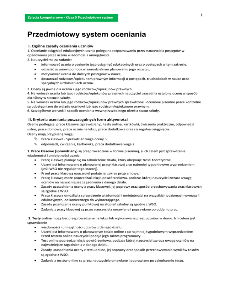 Zajęcia komputerowe - Klasa 5 Przedmiotowy system 1 oceniania Przedmiotowy system oceniania I. Ogólne zasady oceniania uczniów 1. Ocenianie osiągnięć edukacyjnych ucznia polega na rozpoznawaniu przez nauczyciela postępów w opanowaniu przez ucznia wiadomości i umiejętności. 2. Nauczyciel ma za zadanie: informować ucznia o poziomie jego osiągnięć edukacyjnych oraz o postępach w tym zakresie, udzielać uczniowi pomocy w samodzielnym planowaniu jego rozwoju, motywować ucznia do dalszych postępów w nauce, dostarczać rodzicom/opiekunom prawnym informacji o postępach, trudnościach w nauce oraz specjalnych uzdolnieniach ucznia. 3. Oceny są jawne dla ucznia i jego rodziców/opiekunów prawnych. 4. Na wniosek ucznia lub jego rodziców/opiekunów prawnych nauczyciel uzasadnia ustaloną ocenę w sposób określony w statucie szkoły. 5. Na wniosek ucznia lub jego rodziców/opiekunów prawnych sprawdzone i ocenione pisemne prace kontrolne są udostępniane do wglądu uczniowi lub jego rodzicom/opiekunom prawnym. 6. Szczegółowe warunki i sposób oceniania wewnątrzszkolnego określa statut szkoły. II. Kryteria oceniania poszczególnych form aktywności Ocenie podlegają: prace klasowe (sprawdziany), testy online, kartkówki, ćwiczenia praktyczne, odpowiedzi ustne, prace domowe, praca ucznia na lekcji, prace dodatkowe oraz szczególne osiągnięcia. Oceny mają przypisaną wagę: Praca klasowa - Sprawdzian waga oceny 5; odpowiedź, ćwiczenia, kartkówka, praca dodatkowa waga 2. 1. Prace klasowe (sprawdziany) są przeprowadzane w formie pisemnej, a ich celem jest sprawdzenie wiadomości i umiejętności ucznia. Pracę klasową planuje się na zakończenie działu, który obejmuje treści teoretyczne. Uczeń jest informowany o planowanej pracy klasowej z co najmniej tygodniowym wyprzedzeniem (jeśli WSO nie reguluje tego inaczej). Przed pracą klasową nauczyciel podaje jej zakres programowy. Pracę klasową może poprzedzać lekcja powtórzeniowa, podczas której nauczyciel zwraca uwagę uczniów na najważniejsze zagadnienia z danego działu. Zasady uzasadniania oceny z pracy klasowej, jej poprawy oraz sposób przechowywania prac klasowych są zgodne z WSO. Praca klasowa umożliwia sprawdzenie wiadomości i umiejętności na wszystkich poziomach wymagań edukacyjnych, od koniecznego do wykraczającego. Zasady przeliczania oceny punktowej na stopień szkolny są zgodne z WSO. Zadania z pracy klasowej są przez nauczyciela omawiane i poprawiane po oddaniu prac. 2. Testy online mogą być przeprowadzane na lekcji lub wykonywane przez uczniów w domu. Ich celem jest sprawdzenie wiadomości i umiejętności uczniów z danego działu. Uczeń jest informowany o planowanym teście online z co najmniej tygodniowym wyprzedzeniem Przed testem online nauczyciel podaje jego zakres programowy. Test online poprzedza lekcja powtórzeniowa, podczas której nauczyciel zwraca uwagę uczniów na najważniejsze zagadnienia z danego działu. Zasady uzasadniania oceny z testu online, jej poprawy oraz sposób przechowywania wyników testów są zgodne z WSO. Zadania z testów online są przez nauczyciela omawiane i poprawiane po zakończeniu testu. Zajęcia komputerowe - Klasa 5 Przedmiotowy system 2 oceniania 3. Kartkówki są przeprowadzane w formie pisemnej, a ich celem jest sprawdzenie wiadomości i umiejętności ucznia z zakresu programowego ostatnich jednostek lekcyjnych (maksymalnie trzech). Nauczyciel nie ma obowiązku uprzedzania uczniów o terminie i zakresie programowym kartkówki. Kartkówka powinna być tak skonstruowana, aby uczeń mógł wykonać wszystkie polecenia w czasie nie dłuższym niż 15 minut. Kartkówka jest oceniana w skali punktowej, a liczba punktów jest przeliczana na ocenę zgodnie z zasadami WSO. Zasady przechowywania kartkówek reguluje WSO. 4. Ćwiczenia praktyczne obejmują zadania praktyczne, które uczeń wykonuje podczas lekcji. Oceniając je, nauczyciel bierze pod uwagę: wartość merytoryczną, stopień zaangażowanie w wykonanie ćwiczenia, dokładność wykonania polecenia, staranność i estetykę. 5. Odpowiedź ustna obejmuje zakres programowy aktualnie realizowanego działu. Oceniając ją, nauczyciel bierze pod uwagę: zgodność wypowiedzi z postawionym pytaniem, prawidłowe posługiwanie się pojęciami, zawartość merytoryczną wypowiedzi, sposób formułowania wypowiedzi. 6. Praca domowa jest pisemną (praktyczną) formą ćwiczenia umiejętności i utrwalania wiadomości zdobytych przez ucznia podczas lekcji. Pracę domową uczeń wykonuje na komputerze (i zapisuje ją w odpowiednim miejscu wskazanym przez nauczyciela, np. w Teczce ucznia), w zeszycie, w zbiorze zadań lub w formie zleconej przez nauczyciela. Brak pracy domowej jest oceniany zgodnie z umową między nauczycielem a uczniami, z uwzględnieniem zapisów WSO. Błędnie wykonana praca domowa jest sygnałem dla nauczyciela, mówiącym o konieczności wprowadzenia dodatkowych ćwiczeń utrwalających umiejętności i nie może być oceniona negatywnie. Przy wystawianiu oceny za pracę domową nauczyciel bierze pod uwagę samodzielność, poprawność i estetykę wykonania. 7. Aktywność i praca ucznia na lekcji są oceniane (jeśli WSO nie stanowi inaczej), zależnie od ich charakteru, za pomocą plusów i minusów. Plus uczeń może uzyskać m.in. za samodzielne wykonanie krótkiej pracy na lekcji, krótką poprawną odpowiedź ustną, aktywną pracę w grupie, pomoc koleżeńską na lekcji przy rozwiązywaniu problemu, przygotowanie do lekcji. Minus uczeń może uzyskać m.in. za brak przygotowania do lekcji (np. brak podręcznika multimedialnego, zbioru zadań, plików potrzebnych do wykonania zadania), brak zaangażowania na lekcji. Sposób przeliczania plusów i minusów na oceny jest zgodny z umową między nauczycielem a uczniami, trzy plusy - ocena bardzo dobry, trzy minusy - ocena niedostateczna. 8. Prace dodatkowe obejmują dodatkowe zadania dla zainteresowanych uczniów, 