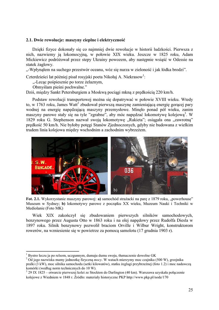 Rozdział II. Fizyka atomowa i cząsteczkowa 2.1. Dwie rewolucje: maszyny cieplne i elektryczność Dzięki fizyce dokonały się co najmniej dwie rewolucje w historii ludzkości. Pierwsza z nich, nazwiemy ją lokomocyjną, w połowie XIX wieku. Jeszcze w 1825 roku, Adam Mickiewicz podróżował przez stepy Ukrainy powozem, aby następnie wsiąść w Odessie na statek żaglowy. „-Wpłynąłem na suchego przestwór oceanu, wóz się nurza w zieloność i jak łódka brodzi”. Czterdzieści lat później pisał rosyjski poeta Nikołaj A. Niekrasow1: „-Lecąc pośpiesznie po torze żelaznym, Obmyślam pieśni pochwalne.” Dziś, między Sankt Petersburgiem a Moskwą pociągi mkną z prędkością 220 km/h. Podstaw rewolucji transportowej można się dopatrywać w połowie XVIII wieku. Wtedy to, w 1763 roku, James Watt2 zbudował pierwszą maszynę zamieniającą energię gorącej pary wodnej na energię napędzającą maszyny przemysłowe. Minęło ponad pół wieku, zanim maszyny parowe stały się na tyle ”zgrabne”, aby móc napędzać lokomotywę kolejową3. W 1829 roku G. Stephenson nazwał swoją lokomotywę „Rakieta”; osiągała ona „zawrotną” prędkość 50 km/h. Nie byłoby potęgi Stanów Zjednoczonych, gdyby nie budowana z wielkim trudem linia kolejowa między wschodnim a zachodnim wybrzeżem. a) b) Fot. 2.1. Wykorzystanie maszyny parowej: a) samochód strażacki na parę z 1879 roku, „powerhouse” Museum w Sydney; b) lokomotywy parowe z początku XX wieku, Muzeum Nauki i Techniki w Mediolanie (Foto MK) Wiek XIX zakończył się zbudowaniem pierwszych silników samochodowych, benzynowego przez Augusta Otto w 1863 roku i na olej napędowy przez Rudolfa Diesla w 1897 roku. Silnik benzynowy pozwolił braciom Orville i Wilbur Wright, konstruktorom rowerów, na wzniesienie się w powietrze za pomocą samolotu (17 grudnia 1903 r). 1 Bystro leczu ja po relsom, uczgunnym, dumaju dumu swoju, tłumaczenie dowolne GK Od jego nazwiska mamy jednostkę fizyczną mocy. W watach mierzymy moc czajnika (500 W), grzejnika pralki (3 kW), moc silnika samochodu (setki kilowatów), statku żeglugi przybrzeżnej (foto 1.2) i moc nadawczą komórki (według norm technicznych do 10 W). 3 29 IX 1825 – otwarcie pierwszej kolei ze Stockton do Darlington (40 km). Warszawa uzyskała połączenie kolejowe z Wiedniem w 1848 r. Źródło: materiały historyczne PKP http://www.pkp.pl/node/170 2 25 a) b) Fot. 2.2. Nagrobek Jamesa Joule’a w Opactwie Westminster w Londynie. Joule jako pierwszy zmierzył, jakiej ilości pracy odpowiada jednostka ciepła. Na jego cześć jednostkę pracy (lub energii) nazywamy dżulem. b) Opakowanie kartonu napoju czy jakiegokolwiek innego pożywienia podaje „wartość energetyczną” jednej porcji – najczęściej w kilodżulach (kJ) i kilokaloriach (kcal). Foto AK Druga rewolucja przemysłowa, związana z użyciem energii elektrycznej miała miejsce w XX wieku (pierwszy tramwaj elektryczny w Berlinie 1881oku). Podobnie jak pierwsza, korzeniami sięgała sto lat wcześniej. W końcu XVIII wieku, inspektor szkolny z zawodu, Alessandro Volta polemizując z Luigi Galvanim, położył na własnym języku dwa kawałki różnych metali (cyny i srebra) i poczuł „kwaśny smak”4. Powstało w ten sposób ogniwo galwaniczne. Poprzez ułożenie większej ilości monet (zob. fot. 2.3) lub umieszczenie par metali (cynk-miedź) w serii szklanek – powstał stos, czyli bateria Volty. Dziś nadal wszystkie komputery i telefony komórkowe korzystają ze źródeł prądu (stałego) w postaci ogniw chemicznych, czyli ogniw Volty. a) a) b) Fot. 2.3. a) Ogniwo Volty: ogniwo zbudowane z monet cynowych i srebrnych przekładanych kartonem nasączonym wodą, Como; b) schemat samochodowego akumulatora ołowiowego. Już w 1803 roku, adwokat z Trydentu, Gian Domenico Romagnosi, zauważył wpływ prądu elektrycznego na igłę magnetyczną5. Minęło prawie 30 lat, zanim angielski samouk, Michael Faraday znalazł sposób na wytworzenie prądu elektrycznego z pola magnetycznego. Rozwiązanie było proste: należy poruszać przewodnikiem w polu magnetycznym. Zjawisko to nazywamy indukcją elektromagnetyczną i jest dziś podstawą całej energetyki światowej. 4 Doświadczenie to opisujemy w artykule A. Karbowski, G. Karwasz, „Na końcu języka (Volty)”, Foton 96, Wiosna 2007. 5 Doświadczenie powtórzone w 1817 roku przez Hansa Christiana Ørsteda. 26