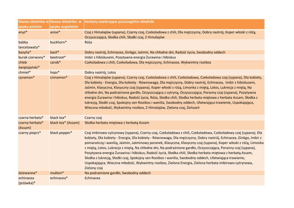 Nazwa składnika w Nazwa składnika w Herbaty zawierające poszczególne składniki języku polskim języku angielskim anyż* anise* Czaj z Himalajów (sypana), Czarny czaj, Czekoladowa z chili, Dla mężczyzny, Dobry nastrój, Koper włoski z różą, Oczyszczająca, Słodka chili, Słodki czaj, Z Himalajów babka buckhorn* Róża lancetowata* bazylia* basil* Dobry nastrój, Echinacea, Ginkgo, Jaśmin, Na chłodne dni, Radość życia, Swobodny oddech burak czerwony* beetroot* Imbir z hibiskusem, Pozytywna energia Żurawina i hibiskus chleb carob* Czekoladowa z chili, Czekoladowa, Dla mężczyzny, Echinacea, Wykwintny rooibos świętojański* chmiel* hops* Dobry nastrój, Lotos cynamon* cinnamon* Czaj z Himalajów (sypana), Czarny czaj, Czekoladowa z chili, Czekoladowa, Czekoladowy czaj (sypana), Dla kobiety, Dla kobiety - Energia, Dla kobiety - Równowaga, Dla mężczyzny, Dobry nastrój, Echinacea, Imbir z hibiskusem, Jaśmin, Klasyczna, Klasyczny czaj (sypana), Koper włoski z różą, Limonka z miętą, Lotos, Lukrecja z miętą, Na chłodne dni, Na podrażnione gardło, Oczyszczająca z cytryną, Oczyszczająca, Poranny czaj (sypana), Pozytywna energia Żurawina i hibiskus, Radość życia, Róża, Słodka chili, Słodka herbata miętowa z herbata Assam, Słodka z lukrecją, Słodki czaj, Spokojny sen Rooibos i wanilia, Swobodny oddech, Ułatwiająca trawienie, Uspokajająca, Wieczna młodość, Wykwintny rooibos, Z Himalajów, Zielony czaj, Żeńszeń czarna herbata* czarna herbata* (Assam) czarny pieprz* black tea* black tea* (Assam) Czarny czaj Słodka herbata miętowa z herbatą Assam black pepper* dziewanna* echinacea (jeżówka)* mullein* echinacea* Czaj imbirowo-cytrynowy (sypana), Czarny czaj, Czekoladowa z chili, Czekoladowa, Czekoladowy czaj (sypana), Dla kobiety, Dla kobiety - Energia, Dla kobiety - Równowaga, Dla mężczyzny, Dobry nastrój, Echinacea, Ginkgo, Imbir z pomarańczą i wanilią, Jaśmin, Jaśminowy poranek, Klasyczna, Klasyczny czaj (sypana), Koper włoski z różą, Limonka z miętą, Lotos, Lukrecja z miętą, Na chłodne dni, Na podrażnione gardło, Oczyszczająca, Poranny czaj (sypana), Pozytywna energia Żurawina i hibiskus, Radość życia, Słodka chili, Słodka herbata miętowa z herbatą Assam, Słodka z lukrecją, Słodki czaj, Spokojny sen Rooibos i wanilia, Swobodny oddech, Ułatwiająca trawienie, Uspokajająca, Wieczna młodość, Wykwintny rooibos, Zielona Energia, Zielona herbata imbirowo-cytrynowa, Zielony czaj Na podrażnione gardło, Swobodny oddech Echinacea ekstrakt cinnamon extract cynamonowy (natural flavour) (naturalny aromat) Czarny czaj, Czekoladowa, Dla mężczyzny, Dobry nastrój, Klasyczna, Lukrecja z miętą, Wieczna młodość, Wykwintny rooibos, Z Himalajów, Zielony czaj ekstrakt citrus extract* Czaj imbirowo-cytrynowy (sypana), Imbirowo-cytrynowa, Słodka zielona mate z zieloną herbatą, Zielona herbata cytrusowy* imbirowo-cytrynowa, Żeńszeń ekstrakt korzenia angelica root extract Dla kobiety, Dla kobiety - Energia dziegla (naturalny (natural flavour) aromat) ekstrakt orange extract pomarańczowy (natural flavour) (naturalny aromat) Dla kobiety, Dobry nastrój, Imbir z pomarańczą i wanilią, Na podrażnione gardło, Słodka z lukrecją ekstrakt waniliowy* ekstrakt z lotosu* vanilla extract* lotus extract* Czekoladowa z chili, Czekoladowa, Imbir z pomarańczą i wanilią, Słodka z lukrecją, Spokojny sen Rooibos i wanilia, Swobodny oddech, Wykwintny rooibos Dla Kobiety, Lotos, Oczyszczająca, Oczyszczająca z cytryną estragon* eukaliptus* gałka muszkatołowa* gałka muszkatołowa* ginkgo (miłorząb japoński)* goździki* tarragon* eucalyptus* mace* Słodka cytrynowa mate z zielona herbatą Na chłodne dni, Swobodny oddech Dla mężczyzny nutmeg* Spokojny sen, Spokojny sen Rooibos i wanilia ginkgo* Ginkgo cloves* Czarny czaj, Czekoladowa z chili, Czekoladowa, Czekoladowy czaj (sypana), Dla kobiety, Dla kobiety - Energia, Dla kobiety - Równowaga, Dobry nastrój, Imbir z hibiskusem, Jaśmin, Klasyczna, Klasyczny czaj (sypana), Koper włoski z różą, Limonka z miętą, Lotos, Lukrecja z miętą, Na chłodne dni, Na podrażnione gardło, Oczyszczająca, Pozytywna energia Żurawina i hibiskus, Radość życia, Róża, Słodka chili, Słodka herbata miętowa z herbata Assam, Słodka z lukrecją, Słodki czaj, Spokojny sen Rooibos i wanilia, Swobodny oddech, Ułatwiająca trawienie, Uspokajająca, Wieczna młodość, Wykwintny rooibos, Zielony czaj, Żeńszeń guarana* hibiskus* guarana* hibiscus* imbir* ginger* jagody cytryńca* schisandra berries* Słodka cytrynowa mate z zieloną herbatą, Słodka herbata miętowa z herbatą Assam kardamon* cardamom* kolendra* koper włoski (fenkuł)* coriander* fennel* Czekoladowa z chili, Czekoladowa, Czekoladowy czaj (sypana), Dla kobiety, Dla kobiety - Energia, Dla kobiety Równowaga, Dla mężczyzny, Dobry nastrój, Echinacea, Ginkgo, Imbir z hibiskusem, Jaśmin, Klasyczna, Klasyczny czaj (sypana), Koper włoski z różą, Limonka z miętą, Lotos, Lukrecja z miętą,Na chłodne dni, Na podrażnione gardło, Oczyszczająca, Poranny czaj (sypana), Pozytywna energia Żurawina i hibiskus, Radość życia, Róża, Słodka chili, Słodka herbata miętowa z herbata Assam, Słodka z lukrecją, Słodki czaj, Spokojny sen Rooibos i wanilia, Spokojny sen, Swobodny oddech, Ułatwiająca trawienie, Uspokajająca,Wieczna młodość, Wykwintny rooibos, Zielony czaj, Żeńszeń Czaj z Himalajów (sypana), Oczyszczająca, Ułatwiająca trawienie, Wieczna młodość, Z Himalajów Czaj z Himalajów (sypana), Dla kobiety, Dla mężczyzny, Dobry nastrój, Echinacea, Koper włoski z różą, Na podrażnione gardło, Oczyszczająca, Róża, Słodka chili, Słodki czaj, Spokojny sen, Swobodny oddech, Ułatwiająca trawienie, Uspokajająca, Z Himalajów Pozytywna energia Żurawina i hibiskus, Żeńszeń korzen żeńszenia* ginseng root* korzeń kozłka lekarskiego (waleriany)* korzeń kurkumy* Pozyt