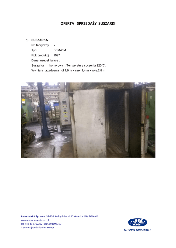 OFERTA SPRZEDAŻY SUSZARKI 1. SUSZARKA Nr fabryczny . Typ: SEM-2 M Rok produkcji 1997 Dane uzupełniające : Suszarka komorowa . Temperatura suszenia 220°C. Wymiary urządzenia dł 1,9 m x szer 1,4 m x wys.2,8 m Andoria-Mot Sp. z o.o. 34-120 Andrychów, ul. Krakowska 140, POLAND www.andoria-mot.com.pl tel. +48 33 8762202 kom.693692710 [email protected] Andoria-Mot Sp. z o.o. 34-120 Andrychów, ul. Krakowska 140, POLAND www.andoria-mot.com.pl tel. +48 33 8762202 kom.693692710 [email protected]