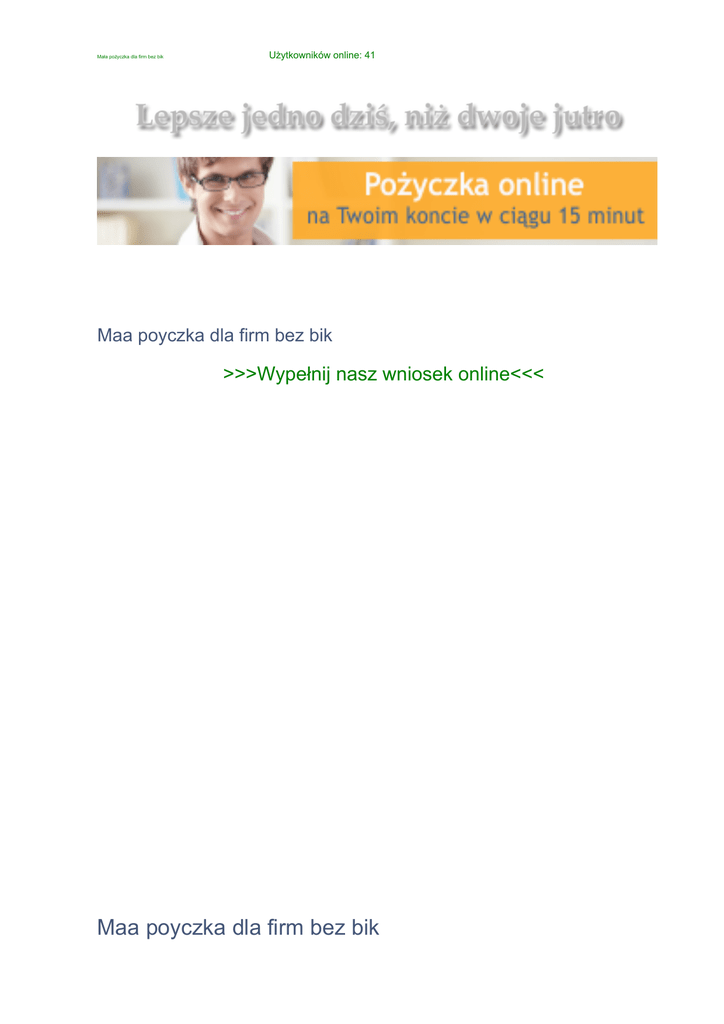 _____________Użytkowników online: 41 Mała pożyczka dla firm bez bik Maa poyczka dla firm bez bik _______________>>>Wypełnij nasz wniosek online<<< Smart Pożyczka nowym klientom nie udziela wysokich kwot chwilówek – limit przy pierwszej pożyczce (darmowej!) to 600 złotych. Koszty pożyczek są uzależnione od oceny wiarygodności klienta (stali klienci mogą liczyć na bardziej atrakcyjne warunki) i wynoszą średnio ok. Należy do firmy Mała Pożyczka, która zarządza również inną marką chwilówek – Pożyczka Plus. Z porównywarki GrupaFinanse.pl korzystam regularnie od dwóch miesięcy moja największa uwagę przyciągają pożyczki pozabankowe. Mała Pożyczka to jeszcze jedna łotewska firma, która stara się rozszerzyć grono klientów i przygotowuje nowe oferty skrojone na potrzeby konkretnych grup. Firma deklaruje, że w przypadku pozytywnej decyzji pieniądze na koncie klienta są w ciągu pół godziny. Wniosek możemy złożyć bardzo szybko, równie szybko Smart Pożyczka podejmuje decyzję o przyznaniu chwilówki i przelewa pieniądze na konto, z którego wcześniej wykonaliśmy weryfikacyjny przelew. Klienci Smart Pożyczki są ubezpieczeni na wypadek śmierci – więc ich zobowiązania nie obciążają rodziny. Największe podziękowania dla PaniAleksandry za pomoc w wyborze karty kredytowej dla osób na emeryturze. Ale z każdą kolejną pożyczką limit się zwiększa, a od siódmej pożyczki możemy otrzymać nawet 2,5 tysiąca złotych. Pożyczki udzielane są na okres od 5 do 30 dni, a spłatę można przedłużać na 10, 20 lub 30 dni. Maa poyczka dla firm bez bik _____________>>>Wypełnij nasz wniosek online<<<
