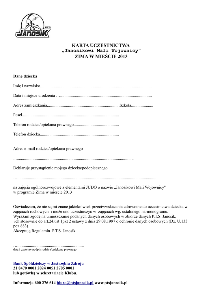 KARTA UCZESTNICTWA „Janosikowi Mali Wojownicy” ZIMA W MIEŚCIE 2013 Dane dziecka Imię i nazwisko.......................................................................................................... Data i miejsce urodzenia …....................................................................................... Adres zamieszkania.....................................................................Szkoła..................... Pesel............................................................................................ Telefon rodzica/opiekuna prawnego........................................... Telefon dziecka........................................................................... Adres e-mail rodzica/opiekuna prawnego …............................................................................................................... Deklaruję przystąpienie mojego dziecka/podopiecznego ….................................................................................................................................... na zajęcia ogólnorozwojowe z elementami JUDO o nazwie „Janosikowi Mali Wojownicy" w programie Zima w mieście 2013 Oświadczam, że nie są mi znane jakiekolwiek przeciwwskazania zdrowotne do uczestnictwa dziecka w zajęciach ruchowych i może ono uczestniczyć w zajęciach wg. ustalonego harmonogramu. Wyrażam zgodę na umieszczanie podanych danych osobowych w zbiorze danych P.T.S. Janosik, ich stosownie do art.24.ust 1pkt 2 ustawy z dnia 29.08.1997 o ochronie danych osobowych (Dz. U.133 poz 883). Akceptuję Regulamin P.T.S. Janosik. …............................................................... data i czytelny podpis rodzica/opiekuna prawnego Bank Spółdzielczy w Jastrzębiu Zdroju 21 8470 0001 2024 0051 2705 0001 lub gotówką w sekretariacie Klubu. Informacja 600 276 614 [email protected] www.ptsjanosik.pl