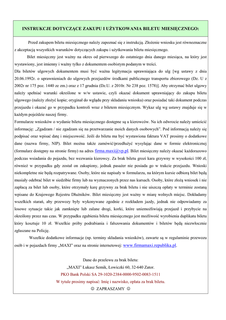 INSTRUKCJE DOTYCZĄCE ZAKUPU I UŻYTKOWANIA BILETU MIESIĘCZNEGO: Przed zakupem biletu miesięcznego należy zapoznać się z instrukcją. Złożenie wniosku jest równoznaczne z akceptacją wszystkich warunków dotyczących zakupu i użytkowania biletu miesięcznego. Bilet miesięczny jest ważny na okres od pierwszego do ostatniego dnia danego miesiąca, na który jest wystawiony, jest imienny i ważny tylko z dokumentem osobistym podanym w treści. Dla biletów ulgowych dokumentem musi być ważna legitymacja uprawniająca do ulg [wg ustawy z dnia 20.06.1992r. o uprawnieniach do ulgowych przejazdów środkami publicznego transportu zbiorowego (Dz. U z 2002r nr 175 poz. 1440 ze zm.) oraz z 17 grudnia (Dz.U. z 2010r. Nr 238 poz. 1578)]. Aby otrzymać bilet ulgowy należy spełniać warunki określone w w/w ustawie, czyli okazać dokument uprawniający do zakupu biletu ulgowego (należy złożyć kopie; oryginał do wglądu przy składaniu wniosku) oraz posiadać taki dokument podczas przejazdu i okazać go w przypadku kontroli wraz z biletem miesięcznym. Wykaz ulg wg ustawy znajduje się w każdym pojeździe naszej firmy. Formularze wniosków o wydanie biletu miesięcznego dostępne są u kierowców. Na ich odwrocie należy umieścić informację: „Zgadzam / nie zgadzam się na przetwarzanie moich danych osobowych”. Pod informacją należy się podpisać oraz wpisać datę i miejscowość. Jeśli do biletu ma być wystawiona faktura VAT prosimy o dodatkowe dane (nazwa firmy, NIP). Bilet można także zamówić/przedłużyć wysyłając dane w formie elektronicznej (formularz dostępny na stronie firmy) na adres [email protected]. Bilet miesięczny należy okazać każdorazowo podczas wsiadania do pojazdu, bez wezwania kierowcy. Za brak biletu grozi kara grzywny w wysokości 100 zł, również w przypadku gdy został on zakupiony, jednak pasażer nie posiada go w trakcie przejazdu. Wnioski niekompletne nie będą rozpatrywane. Osoby, które nie napisały w formularzu, na którym kursie odbiorą bilet będą musiały odebrać bilet w siedzibie firmy lub na wyznaczonych przez nas kursach. Osoby, które złożą wniosek i nie zapłacą za bilet lub osoby, które otrzymały karę grzywny za brak biletu i nie uiszczą opłaty w terminie zostaną wpisane do Krajowego Rejestru Dłużników. Bilet miesięczny jest ważny w miarę wolnych miejsc. Dokładamy wszelkich starań, aby przewozy były wykonywane zgodnie z rozkładem jazdy, jednak nie odpowiadamy za losowe sytuacje takie jak zamknięte lub zalane drogi, korki, które uniemożliwiają przejazd i przybycie na określony przez nas czas. W przypadku zgubienia biletu miesięcznego jest możliwość wyrobienia duplikatu biletu który kosztuje 10 zł. Wszelkie próby podrabiania i fałszowania dokumentów i biletów będą niezwłocznie zgłaszane na Policję. Wszelkie dodatkowe informacje (np. terminy składania wniosków), zawarte są w regulaminie przewozu osób i w pojazdach firmy „MAXI” oraz na stronie internetowej: www.firmamaxi.republika.pl. Dane do przelewu za brak biletu: „MAXI” Łukasz Semik, Łowiczki 60, 32-640 Zator. PKO Bank Polski SA 29-1020-2384-0000-9502-0083-1511 W tytule prosimy napisać: Imię i nazwisko, opłata za brak biletu. ☺ ZAPRASZAMY ☺
