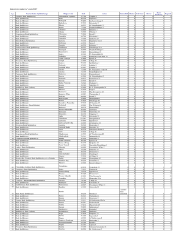 Załącznik do regulaminu "Lokata SGB" Lp. Nazwa Banku Spółdzielczego 1 2 3 4 5 6 7 8 9 10 11 12 13 14 15 16 17 18 19 20 21 22 23 24 25 26 27 28 29 30 31 32 33 34 35 36 37 38 39 40 41 42 43 44 45 46 47 48 49 50 51 52 53 54 55 56 57 58 59 60 61 62 63 64 65 66 67 Kujawski Bank Spółdzielczy Bank Spółdzielczy Bank Spółdzielczy Bank Spółdzielczy Bank Spółdzielczy Bank Spółdzielczy Bank Spółdzielczy Bank Spółdzielczy Gospodarczy Bank Spółdzielczy Bank Spółdzielczy Bank Spółdzielczy Bałtycki Bank Spółdzielczy Bank Spółdzielczy Bank Spółdzielczy Nadwarciański Bank Spółdzielczy Bank Spółdzielczy Bank Spółdzielczy Bank Spółdzielczy Bank Spółdzielczy Bank Spółdzielczy Powiatowy Bank Spółdzielczy Bank Spółdzielczy Bank Spółdzielczy Bank Spółdzielczy Bank Spółdzielczy Bank Spółdzielczy Piastowski Bank Spółdzielczy Bank Spółdzielczy Bank Spółdzielczy Bank Spółdzielczy Bank Spółdzielczy Bank Spółdzielczy Spółdzielczy Bank Ludowy Bank Spółdzielczy Bank Spółdzielczy Bank Spółdzielczy Bank Spółdzielczy Bank Spółdzielczy Bank Spółdzielczy Bank Spółdzielczy Bank Spółdzielczy Ziemi Kaliskiej Bank Spółdzielczy Bank Spółdzielczy Bank Spółdzielczy Bank Spółdzielczy Bank Spółdzielczy Bank Spółdzielczy Bank Spółdzielczy Bank Spółdzielczy Rejonowy Bank Spółdzielczy Bank Spółdzielczy Bank Spółdzielczy Bank Spółdzielczy Gospodarczy Bank Spółdzielczy Bank Spółdzielczy Gospodarczy Bank Spółdzielczy Bank Spółdzielczy Bank Spółdzielczy Bank Spółdzielczy Ludowy Bank Spółdzielczy Bank Spółdzielczy Bank Spółdzielczy Bank Spółdzielczy Bank Spółdzielczy Braniewsko - Pasłęcki Bank Spółdzielczy z/s w Pasłęku Bank Spółdzielczy Bank Spółdzielczy 68 69 70 71 72 73 74 75 76 77 Pobiedzisko-Gośliński Bank Spółdzielczy Powiatowy Bank Spółdzielczy Bank Spółdzielczy Bank Spółdzielczy Bank Spółdzielczy Bank Spółdzielczy Pyrzycko - Stargardzki Bank Spółdzielczy Bank Spółdzielczy Nadobrzański Bank Spółdzielczy Bank Spółdzielczy Miejscowość Aleksandrów Kujawski Biała Białogard Białośliwie Błaszki Bytów ChodzieŜ Chojna Choszczno Czarnków Człuchów Darłowo Dobrzyca Duszniki Działoszyn Dzierzgoń DzierŜoniów Gniew Goleniów Golub Dobrzyń Gostyń Grabów Grębocin Grodzisk Wlkp. Gryfice Gryfino Janikowo Jarocin Jastrowie Jutrosin Kalisz Pomorski Kcynia Kępno Kłodawa Koronowo Kostrzyn Wlkp. Kościan Kościerzyna Kowal Kowalewo Pomorskie Koźminek Krokowa Krosno Odrzańskie Krotoszyn Kruszwica Lipka Lubichowo Lubraniec Lubycza Królewska Lututów Lwówek Śląski Łasin Łeba Międzyrzecz Międzyzdroje Mosina Nakło n/Notecią Nowe n/Wisłą Nowy Tomyśl Oborniki Oława Osie Ośno Lubuskie OŜarów Pasłęk Piotrków Kuj. Pleszew Pobiedziska Police Połczyn Zdrój Pruszcz Pruszcz Gdański Przemków Pyrzyce Radziejów Rakoniewice Raszków Kod Adres Bank Rumia Spółdzielczy Bank Spółdzielczy Bank Spółdzielczy Express Bank Spółdzielczy Bank Spółdzielczy Bank Spółdzielczy Bank Spółdzielczy Bank Spółdzielczy Spółdzielczy Bank Ludowy Bank Spółdzielczy Bank Spółdzielczy Bank Spółdzielczy Bank Spółdzielczy Bank Spółdzielczy Bank Spółdzielczy Powiatowy Bank Spółdzielczy Bank Spółdzielczy Rusiec Rzepin Rzeszów Santok Siedlec Sieradz Sierakowice Skalmierzyce Skępe Sławno Słupca Smętowo Graniczne Starogard Gdański Stegna Strzelin Strzelno Robot kuchenny Rower Zegarek 87-700 98-350 78-200 89-340 98-235 77-100 64-800 74-500 73-200 64-700 77-300 76-150 63-330 64-550 98-355 82-440 58-200 83-140 72-100 87-400 63-800 99-150 87-122 62-065 72-300 74-100 88-160 63-200 64-915 63-930 78-540 89-240 63-600 62-650 86-010 62-025 64-000 83-400 87-820 87-410 62-840 84-110 66-600 63-700 88-150 77-420 83-240 87-890 22-680 98-360 59-600 86-320 84-360 66-300 72-510 62-050 89-100 86-170 64-300 64-600 55-200 86-150 69-220 27-530 14-400 88-230 63-300 Chopina 3 Rządowa 2 Kochanowskiego 6 Kościuszki 41 pl. Niepodległości 33 Wojska Polskiego 33 Składowa 1 Wilsona 2 Rynek 2 Kościuszki 5 Zamkowa 23 Bogusława X nr 3 Nowa 2 Kolejowa 7 Piłsudskiego 21A Wojska Polskiego 4 Daszyńskiego 24 Pl. Grunwaldzki 26 Konstytucji 3-go Maja 20 Rynek 34 1 Maja 18 Spółdzielcza 1 Lubicka 2 Chopina 1 Pl. Zwycięstwa 5 /skr.78/ Niepodległości 24 Przemysłowa 4 Al. Niepodległości 5 Kieniewicza 53 Rynek 18 Wolności 8 Nakielska 21 Ks. P. Wawrzyniaka 20 Krępa 2 Plac Zwycięstwa 12 Warszawska 4 Rynek 23 Świętojańska 1 Piłsudsiego 42 23 Stycznia 14 Plac Wolności 6 śarnowicka 1 ZboWiD 3 Piastowska 14 Podgórna 2 Kościuszki 35 Starogardzka 9 Ogrodowa 7 ul. Kolejowa 14 Klonowska 2 Morcinka 16 Odrodzenia Polski 5 1 Maja 1b ul. Waszkiewicza 24 Światowida 19 Dworcowa 9 Sądowa 10 Bydgoska 12 Marszałka Piłsudskiego 2 Powstańców Wlkp. 5 Pałacowa 13 Dworcowa 8 Chrobrego 5 ul. Długa 14 Westerplatte 17 Poznańska 13 Kraszewskiego 11 0 0 0 0 0 0 0 0 0 0 0 0 0 1 0 0 1 0 0 0 0 0 0 0 0 0 0 0 0 0 0 0 0 0 1 0 0 0 0 0 0 0 0 0 0 0 0 0 0 0 0 0 0 0 0 0 0 0 0 0 0 0 0 0 0 0 0 0 0 0 1 0 0 0 1 0 0 0 1 1 0 0 0 0 0 0 0 0 1 0 1 0 0 0 1 0 0 0 1 0 0 2 0 0 0 1 0 1 1 0 0 0 0 0 0 0 1 0 0 0 1 1 1 1 1 0 0 0 0 1 1 0 0 0 0 0 1 0 0 0 0 2 0 0 0 1 0 1 0 1 0 0 0 0 1 1 1 1 1 0 0 1 0 2 0 0 0 0 1 0 0 0 0 0 0 0 0 1 0 0 0 0 1 1 0 0 0 0 0 0 0 0 0 1 1 0 1 1 0 0 1 0 0 0 0 0 3 1 2 0 0 0 3 1 2 0 0 0 1 0 0 2 2 0 1 2 0 3 2 0 2 0 0 2 1 2 1 3 0 0 1 1 0 0 3 0 0 0 0 0 0 0 0 2 5 0 1 1 0 0 1 0 0 1 1 0 0 0 0 1 0 0 1 0 0 3 0 1 3 0 1 0 2 0 0 1 0 0 5 1 0 1 2 0 0 0 0 2 3 0 1 0 5 0 2 0 4 0 0 1 2 5 0 2 0 4 0 2 2 4 1 5 0 1 1 0 0 3 0 3 0 1 4 2 5 0 4 0 5 0 0 0 5 0 5 0 4 0 0 0 0 0 0 0 0 5 2 0 0 15 10 3 0 10 6 15 3 1 0 10 3 0 0 0 0 3 20 0 0 0 0 10 8 0 0 0 0 5 10 0 0 0 3 0 0 0 3 0 0 0 0 25 62-010 72-015 78-320 86-120 83-000 59-170 74-200 88-200 62-067 63-440 Tysiąclecia 15 Piastów 46 Ogrodowa 4 Dworcowa 6 Wita Stwosza 2a Głogowska 12A 1 Maja 20 Kościuszki 26 Powstańców Wlkp. 34 Ostrowska 28 0 0 0 0 0 0 0 0 0 0 0 0 0 0 0 1 0 0 0 
