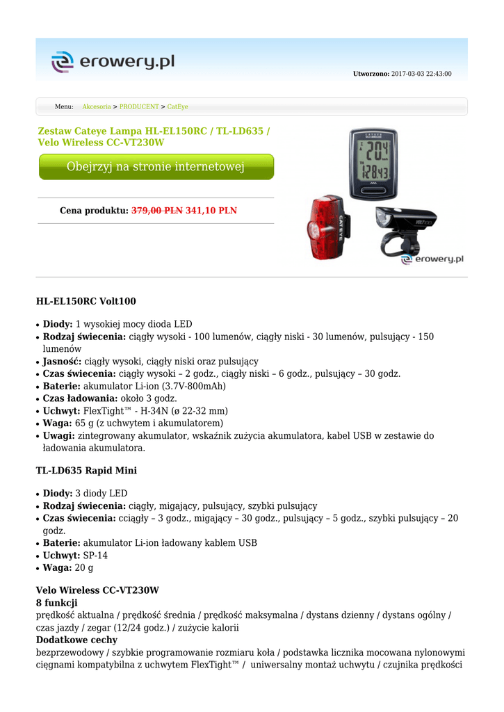 Utworzono: 2017-03-03 22:43:00 Menu: Akcesoria > PRODUCENT > CatEye Zestaw Cateye Lampa HL-EL150RC / TL-LD635 / Velo Wireless CC-VT230W Obejrzyj na stronie internetowej Cena produktu: 379,00 PLN 341,10 PLN HL-EL150RC Volt100 ● ● ● ● ● ● ● ● ● Diody: 1 wysokiej mocy dioda LED Rodzaj świecenia: ciągły wysoki - 100 lumenów, ciągły niski - 30 lumenów, pulsujący - 150 lumenów Jasność: ciągły wysoki, ciągły niski oraz pulsujący Czas świecenia: ciągły wysoki – 2 godz., ciągły niski – 6 godz., pulsujący – 30 godz. Baterie: akumulator Li-ion (3.7V-800mAh) Czas ładowania: około 3 godz. Uchwyt: FlexTight™ - H-34N (ø 22-32 mm) Waga: 65 g (z uchwytem i akumulatorem) Uwagi: zintegrowany akumulator, wskaźnik zużycia akumulatora, kabel USB w zestawie do ładowania akumulatora. TL-LD635 Rapid Mini ● ● ● ● ● ● Diody: 3 diody LED Rodzaj świecenia: ciągły, migający, pulsujący, szybki pulsujący Czas świecenia: cciągły – 3 godz., migający – 30 godz., pulsujący – 5 godz., szybki pulsujący – 20 godz. Baterie: akumulator Li-ion ładowany kablem USB Uchwyt: SP-14 Waga: 20 g Velo Wireless CC-VT230W 8 funkcji prędkość aktualna / prędkość średnia / prędkość maksymalna / dystans dzienny / dystans ogólny / czas jazdy / zegar (12/24 godz.) / zużycie kalorii Dodatkowe cechy bezprzewodowy / szybkie programowanie rozmiaru koła / podstawka licznika mocowana nylonowymi cięgnami kompatybilna z uchwytem FlexTight™ / uniwersalny montaż uchwytu / czujnika prędkości / automatyczny start/stop / funkcja uśpienia / funkcja oszczędzania baterii / poświetlenie wyświetlacza / programowalny wyświetlacz Producent CatEye Zawartość Licznik, Lampka tył, Lampka przód Mimo dołożenia wszelkich starań nie gwarantujemy, że publikowane opisy i specyfikacje techniczne niezawierają uchybień lub błędów, które nie mogą jednak być podstawą do roszczeń. W przypadku jakichkolwiek wątpliwości, przed podjęciem decyzji prosimy o kontakt. Adres: www.erowery.pl Telefon: 605 515 185, 34 361 16 71 Email: [email protected]