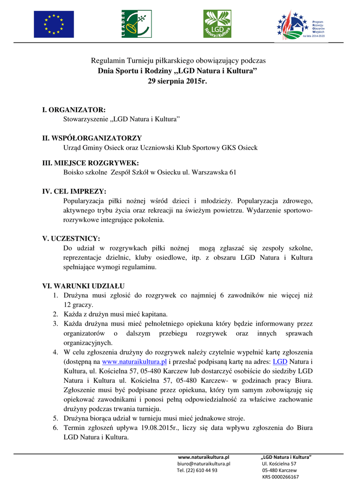 Regulamin Turnieju piłkarskiego obowiązujący podczas Dnia Sportu i Rodziny „LGD Natura i Kultura” 29 sierpnia 2015r. I. ORGANIZATOR: Stowarzyszenie „LGD Natura i Kultura” II. WSPÓŁORGANIZATORZY Urząd Gminy Osieck oraz Uczniowski Klub Sportowy GKS Osieck III. MIEJSCE ROZGRYWEK: Boisko szkolne Zespół Szkół w Osiecku ul. Warszawska 61 IV. CEL IMPREZY: Popularyzacja piłki nożnej wśród dzieci i młodzieży. Popularyzacja zdrowego, aktywnego trybu życia oraz rekreacji na świeżym powietrzu. Wydarzenie sportoworozrywkowe integrujące pokolenia. V. UCZESTNICY: Do udział w rozgrywkach piłki nożnej mogą zgłaszać się zespoły szkolne, reprezentacje dzielnic, kluby osiedlowe, itp. z obszaru LGD Natura i Kultura spełniające wymogi regulaminu. VI. WARUNKI UDZIAŁU 1. Drużyna musi zgłosić do rozgrywek co najmniej 6 zawodników nie więcej niż 12 graczy. 2. Każda z drużyn musi mieć kapitana. 3. Każda drużyna musi mieć pełnoletniego opiekuna który będzie informowany przez organizatorów o dalszym przebiegu rozgrywek oraz innych sprawach organizacyjnych. 4. W celu zgłoszenia drużyny do rozgrywek należy czytelnie wypełnić kartę zgłoszenia (dostępną na www.naturaikultura.pl i przesłać podpisaną kartę na adres: LGD Natura i Kultura, ul. Kościelna 57, 05-480 Karczew lub dostarczyć osobiście do siedziby LGD Natura i Kultura ul. Kościelna 57, 05-480 Karczew- w godzinach pracy Biura. Zgłoszenie musi być podpisane przez opiekuna, który tym samym zobowiązuję się opiekować zawodnikami i ponosi pełną odpowiedzialność za właściwe zachowanie drużyny podczas trwania turnieju. 5. Drużyna biorąca udział w turnieju musi mieć jednakowe stroje. 6. Termin zgłoszeń upływa 19.08.2015r., liczy się data wpływu zgłoszenia do Biura LGD Natura i Kultura. www.naturaikultura.pl [email protected] Tel. (22) 610 44 93 „LGD Natura i Kultura” Ul. Kościelna 57 05-480 Karczew KRS 0000266167 7. Zgłoszenie do rozgrywek jest jednoznaczne z przyjęciem regulaminu i przepisów gry ustalonych na turnieju. VII. PRZEPISY GRY 1. Rozgrywki zostaną przeprowadzone w trzech kategoriach wiekowych chłopców: • Rocznik 2007-2009 • Rocznik 2004-2006 • Rocznik 2000-2003 W ramach każdej z kategorii wiekowej mogą wziąć udział maksymalnie trzy drużyny. 2. Drużyny zgłaszają się na miejsce rozgrywek na 15 min przed rozpoczęciem meczu. 3. Dokładny system rozgrywania „Turnieju Piłkarskiego” zostanie podany po upływie terminu zgłoszeń, nie później niż 24 sierpnia. 4. Terminy spotkań wyznacza organizator. Każda drużyna otrzyma terminarz rozgrywek. 5. Za zwycięstwo drużyna otrzymuje 3 punkty, za remis 1 pkt., przegrana (w tym walkowerem) 0 pkt., wygrana walkowerem 3 pkt. 6. O kolejności w tabeli w fazie eliminacyjnej decyduje: – ilość zdobytych punktów, – wynik bezpośredniego pojedynku między drużynami (w przypadku 3 lub więcej drużyn „mała tabela” uwzględniająca wyniki bezpośrednich pojedynków), – ilość goli dodatnich wynikająca z różnicy goli zdobytych i straconych, – ilość zdobytych goli w turnieju. 8. Mecz może rozpocząć się tylko wtedy, gdy w każdej drużynie jest minimum 5 zawodników. Jeżeli drużyna jest reprezentowana przez mniejszą liczbę zawodników, uznawana jest za drużynę niekompletną, a wynik meczu zostanie zweryfikowany na jej niekorzyść w stosunku 3:0 i 0 punktów. 9. Turniej odbywa się na boisku sportowym na powierzchni o wymiarach 20x 40 m. 10. Zespoły występują w sześcioosobowych składach (bramkarz + 5 zawodników w polu). 11. Jeżeli w wyniku wykluczeń z boiska w którymkolwiek zespole pozostanie mniej niż 3 zawodników, mecz należy zakończyć. 12. Ilość zmian w locie zawodników z pola podczas trwania rozgrywek jest nieograniczona i nie wymaga przerwy w grze. 13. Zawodnik, który został zmieniony może powtórnie wrócić na boisko podczas kolejnej zmiany. 14. Czas gry - 2 x 10 min. z 3 minutową przerwą . 15. Rzut karny wykonywany jest z odległości 7 metrów. 16. Rzut od bramki jest rzutem wolnym pośrednim, wykonanym z pola karnego. 17. Sędzia może ukarać zawodnika karą dyscyplinującą w wymiarze czasowym 2 i 5 minut za brutalne faule i niesportowe zachowanie. 18. Nie obowiązuje przepis o spalonym. 19. Bramka zdobyta bezpośrednio z rozpoczęcia z połowy boiska nie zostanie zaliczona. www.naturaikultura.pl [email protected] Tel. (22) 610 44 93 „LGD Natura i Kultura” Ul. Kościelna 57 05-480 Karczew KRS 0000266167 VIII. NAGRODY 1. Nagrody rzeczowe zostaną przyznane dla zwycięskiej drużyny w każdej kategorii. 2. Dodatkowo sędziowie wskażą zwycięzców, którzy otrzymają nagrody od Organizatora w następujących kategoriach: • Najlepszy zawodnik • Najlepszy strzelec • Najlepszy bramkarz IX. POSTANOWIENIA KOŃCOWE 1. Sprawy sporne rozstrzyga Organizator turnieju. 2. Termin i godziny rozgrywania meczu ustalone są przez Organizatora. 3. W przypadku nie przestrzegania zasad gry i regulaminu turnieju Organizator ma prawo do weryfikacji wyniku turnieju, dyskwalifikacji zawodnika lub drużyny z turnieju. 4. Organizator i Współorganizator nie ponoszą odpowiedzialności prawnej za wypadki wynikające z udziału w turnieju osób chorych oraz skutki wypadków przed, po i czasie gry. 5. Organizator ma prawo do sprawdzenia tożsamości osób biorących udział w rozgrywkach. 6. Organizator zastrzega sobie prawo do nieprzyznania nagród w kategoriach dla najlepszego: zawodnika, strzelca, bramkarza. 7. Organizator zastrzega sobie prawo do odwołania rozgrywek w kategorii wiekowej, w ramach której nie zgłoszą się minimum dwie drużyny. 8. Organizator zastrzega sobie prawo do zmiany Regulaminu. 9. Organizator zapewnia opiekę medyczną na czas trwania rozgrywek. 10. Ostateczna interpretacja niniejszego regulaminu należy do Organizatora. www.naturaikultura.pl [email protected] Tel. (22) 610 44 93 „LGD Natura i Kultura” Ul. Kościelna 57 05-