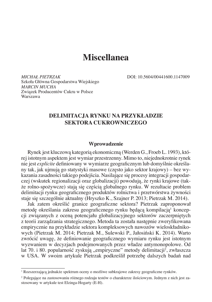 Miscellanea MICHAŁ PIETRZAK Szkoła Główna Gospodarstwa Wiejskiego MARCIN MUCHA Związek Producentów Cukru w Polsce Warszawa DOI: 10.5604/00441600.1147009 DELIMITACJA RYNKU NA PRZYKŁADZIE SEKTORA CUKROWNICZEGO Wprowadzenie Rynek jest kluczową kategorią ekonomiczną (Werden G., Froeb L. 1993), której istotnym aspektem jest wymiar przestrzenny. Mimo to, niejednokrotnie rynek nie jest explicite definiowany w wymiarze geograficznym lub domyślnie określany tak, jak ujmują go statystyki masowe (często jako sektor krajowy) – bez wykazania zasadności takiego podejścia. Nasilające się procesy integracji gospodarczej (wskutek regionalizacji oraz globalizacji) powodują, że rynki krajowe (także rolno-spożywcze) stają się częścią globalnego rynku. W rezultacie problem delimitacji rynku geograficznego produktów rolnictwa i przetwórstwa żywności staje się szczególnie aktualny (Hryszko K., Szajner P. 2013; Pietrzak M. 2014). Jak zatem określić granice geograficzne sektora? Pietrzak zaproponował metodę określania zakresu geograficznego rynku będącą kompilacją1 koncepcji związanych z oceną potencjału globalizacyjnego sektorów zaczerpniętych z teorii zarządzania strategicznego. Metoda ta została następnie zweryfikowana empirycznie na przykładzie sektora kompleksowych nawozów wieloskładnikowych (Pietrzak M. 2014; Pietrzak M., Sulewski P., Jałosiński K. 2014). Warto zwrócić uwagę, że definiowanie geograficznego wymiaru rynku jest istotnym wyzwaniem w decyzjach podejmowanych przez władze antymonopolowe. Od lat 70. i 80. popularność zyskują „empiryczne” metody delimitacji2, zwłaszcza w USA. W swoim artykule Pietrzak podkreślił potrzebę dalszych badań nad Rozszerzającą jednakże spektrum oceny o możliwe subkrajowe zakresy geograficzne rynków. Polegające na zastosowaniu różnego rodzaju testów o charakterze ilościowym. Jednym z nich jest zastosowany w artykule test Elzinga-Hogarty (E-H). 1 2 Miscellanea 123 oceną zakresu geograficznego rynków, zwłaszcza w przypadku produktów rolnych i żywnościowych (Pietrzak M. 2014). Można wykorzystać w tym zakresie koncepcję zaproponowaną przez niego, warto również podejmować próby delimitacji rynków w oparciu o metody ilościowe wypracowane przez teoretyków i praktyków zaangażowanych w problematykę ochrony konkurencji. Celami niniejszego artykułu są: 1) przedyskutowanie problematyki delimitacji rynku geograficznego, w tym z uwzględnieniem metod wykorzystywanych w decyzjach podejmowanych przez organy antymonopolowe, oraz 2) weryfikacja przy pomocy testu Elzinga-Hogarty geograficznego zakresu rynku cukru definiowanego jako rynek narodowy w decyzjach Komisji Europejskiej oraz polskich organów antymonopolowych. Tymczasem w opiniach przedstawicieli branży należałoby rynek cukru definiować szerzej. Autorzy artykułu przychylają się do tej opinii. Jest ona również wyrażana w literaturze przedmiotu (Hryszko K., Szajner P. 2013; Iwan C. 2007; Nolte S., Grethe H. 2013). W związku z powyższym przyjęto następującą hipotezę badawczą: rynek cukru jest rynkiem o ponadnarodowym zakresie geograficznym. Dobór sektora do badań był celowy. W większości znaczących państw produkujących cukier istnieje interwencja na rynku obejmująca kontrolę rynku krajowego, cła importowe lub wsparcie eksportu (Hryszko K., Szajner P. 2013; Mucha M. 2014). W Unii Europejskiej regulacja rynku cukru obowiązuje od ponad 45 lat. W ramach reformy rozpoczętej w 2006 r. politycy UE zdecydowali o częściowej liberalizacji rynku cukru (Mucha M. 2010). Pojawia się zatem pytanie o międzynarodową konkurencyjność sektora cukrowniczego – w UE jako bloku gospodarczym, jak również w poszczególnych państwach członkowskich. Ponieważ to rynek jest areną, na której przedsiębiorstwa zdobywają lub tracą przewagę konkurencyjną – właściwa definicja rynku w wymiarze geograficznym staje się problemem szczególnie istotnym w przypadku tego sektora. W dyskusji problematyki delimitacji rynków geograficznych wykorzystano krytyczną analizę literatury przedmiotu. Dokonano również pełnego przeglądu decyzji Komisji Europejskiej i polskich władz antymonopolowych w zakresie dotyczącym delimitacji rynku właściwego – w odniesieniu do sektora cukrowniczego. Do charakterystyki światowego cukrownictwa oraz weryfikacji geograficznego zakresu rynku cukru wykorzystano dane wtórne. Bazując na nich, zastosowano test Elzinga-Hogarty do oceny zasadności traktowania rynków narodowych jako rynków właściwych. Przebadane kraje reprezentują 98% podaży cukru – można zatem przyjąć, że były to badania pełne. Definiowanie rynku w kontekście europejskiego prawa konkurencji Allaire Y. i Firsirotu M.E. (2000) zwracają uwagę na fakt, że próba zdefiniowania pojęcia rynku jest dużym wyzwaniem, w którym napotykamy na szereg trudności. W podobnym duchu wypowiadają się nt. definicji rynku Audy E. i Erutku C. (2005), Crane S.E. i Welch P.J. (1991) oraz Wårel L. (2007). Również Gorynia M. (1993) podkreśla trudności w przeprowadzaniu linii de- 124 Miscellanea markacyjnej pomiędzy różnymi branżami3. Znamienna jest przy tym deklaracja Tirole – laureata Nagrody Nobla w dziedzinie ekonomii z 2014 r. za „analizę siły rynku oraz regulacji”, który we wstępie do swojej książki nt. ekonomii branży przyznaje: „W zakresie niniejszej książki te empiryczne trudności związane z definiowaniem rynku będą ignorowane. Przyjęte będzie założenie, że rynek jest dobrze zdefiniowany”4 (Tirole J. 1988). O ile w stricte teoretycznych rozważaniach takie podejście jest dopuszczalne, to jednak z praktycznego punktu widzenia nie da się ignorować problemów we właściwym zdefiniowaniu rynków. Allaire i Firsirotu dokonują przeglądu definicji rynku w różnych dyscyplinach naukowych – odwołując się do teorii ekonomii, ekonomii branży, marketingu, prawa konkurencji, s