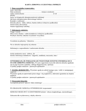 KARTA ZDROWIA UCZESTNIKA IMPREZY 1. Dane uczestnika wypoczynku : Imi i nazwisko ……………………………………………………………………………….... Data urodzenia …………………………….. miejsce urodzenia …………………………….... Adres zamieszkania …………………………………………. nr tel. …………………………. PESEL …………………….......................................................................................................... Seria i nr ksi eczki ubezpieczeniowej rodzinnej ……………………………………………… lub ksero ubezpieczenia zdrowotnego rodzica …………………………………………………. Kontakt z rodzicami ……………………………………………………………………………. Dziecko pływa : słabo, dobrze, bardzo dobrze (wła ciwe podkre li ) Numer karty pływackiej ………………………………………………………………………... Numer legitymacji szkolnej ……………………………………………………………………. ę ą Ŝ ś ś ć 2. Informacje rodziców: Waga i wzrost …………………………………………………………………………………... Musi nosi okulary / szkła kontaktowe (wła ciwe podkre li ) ………………………………… Przebyte choroby zaka ne (wymieni wszystkie) ……………………………………………… …………………………………………..………………………………………….…………… Uczulenia na pokarmy / lekarstwa …………………………………………..…………………. …………………………………………..………………………………………………………. Na co dziecko najcz ciej si uskar a …………………………………………..……………… …………………………………………..………………………………………………………. Informacje o usposobieniu i zachowaniu dziecka ……………………………………………… …………………………………………..………………………………………………………. …………………………………………..………………………………………………………. Jazd autokarem znosi : dobrze, le ……………………………………………………………. Istotne informacje dodatkowe / drgawki, omdlenia, moczenie, inne / …………………………. …………………………………………..………………………………………………………. STWIERDZAM, E PODAŁEM/AM/ WSZYSTKIE ISTOTNE INFORMACJE O STANIE ZDROWIA DZIECKA. W razie zagro enia ycia lub zdrowia dziecka zgadzam si na jego leczenie szpitalne, zabiegi diagnostyczne, operacje. Czytelny podpis rodziców / prawnych opiekunów ……………………………………………. ć ś ź ś ć ć ę ę ś Ŝ ę ź ś Ŝ Ŝ ę 3. ZGODA RODZICÓW : Wyra am zgod na udział mojego syna / córki w nast puj cej imprezie …………………………………………….. w term. ………………………………... Wyra am zgod na uprawianie przez niego / ni eglarstwo, zdawanie egzaminu na stopie eglarza. Czytelny podpis rodziców / prawnych opiekunów ……………………………………………. ę ę Ŝ ą ę Ŝ Ŝ ą Ŝ ń 4. Orzeczenie lekarskie Szczepienia przeciw t cowi /data ostatniego/ ……………………………………………….... …………………………………………….…………………………………………….……… ę Ŝ PO ZBADANIU DZIECKA STWIERDZAM /rozpoznanie/ ………………………………….. …………………………………………….…………………………………………………….. DZIECKO MO E BY UCZESTNIKIEM kolonii / obozu ( eglarskiego, narciarskiego). ś Ć Ŝ Zalecenia dla wychowawcy, słu by zdrowia …………………………………………………... …………………………………………….…………………………………………….………. Ŝ …………………… data …………………………………………. podpis rodziców ORGANIZATOR: SZKÓŁKA EGLARSKA mgr. Bolesław Kalinowski ul. Fioletowa 41/1, tel. 604 610 041, 668 676 559 70 – 781 Szczecin Biuro: ul. Marcinkowska 5a, 74-300 My libórz, tel./fax 095 747 08 83 ś ś PEKAO S.A. V O/Szczecin 66 1240 3969 1111 0000 4236 3075 adres internetowy: www.szkolkazeglarska.pl REGULAMIN KOLONII I OBOZÓW DLA DZIECI I MŁODZIE Y ś 1. Uczestnik wypoczynku zobowi zany jest do: a) nie oddalania si z terenu zakwaterowania bez wiedzy opiekuna grupy, b) dbania o czysto osobist , ład i porz dek w sypialniach i otoczeniu, c) przestrzegania rozkładu dnia, d) przestrzegania regulaminów (uczestnika kolonii, obozu, k pieli, bezpiecze stwa ppo ., poruszania si po drogach i transportu oraz słu b grup dy urnych), e) brania udziału we wszystkich zaj ciach (zwolnione s jedynie osoby chore z zaleceniem lekarskim nie opuszczania obiektu), f) dbania o sprz t i osprz t eglarski (łodzie, wiosła, kapoki, deski z aglem), g) zachowanie bezwzgl dnej karno ci w czasie zaj na wodzie. ą ę ś ć ą ą ą ń ę Ŝ Ŝ Ŝ ę ą ę ę Ŝ Ŝ ę ę ć ś 2. Ra ce przewinienia i łamanie regulaminów mo e by karane: - napomnieniem opiekuna grupy, kierownika kolonii obozu, - wysyłaniem zawiadomienia do rodziców / opiekunów, - wydaleniem z obozu na koszt rodziców / opiekunów uczestnika. Ŝ ą Ŝ ć 3. Bez ostrze e wydalane b d osoby posiadaj ce, przechowuj ce lub spo ywaj ce tyto i alkohol (w tym piwo). ę Ŝ ń ą ą ą Ŝ ą 4. Cisza nocna trwa od 22 –ej do 7 –ej rano. Po 22-ej nie wolno przebywa w pokojach innych uczestników. ć 5. Potwierdzenie dowodu wpłaty prosimy dostarczy przy AUTOKARZE ! Prosimy równie o zachowanie schematu tytułu przedpłaty: ć 